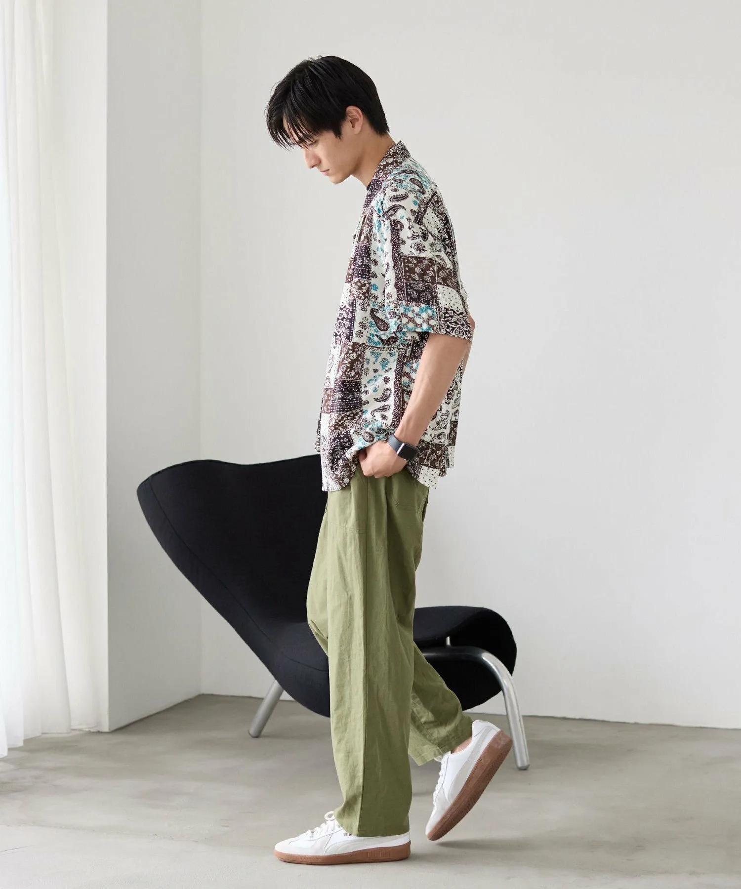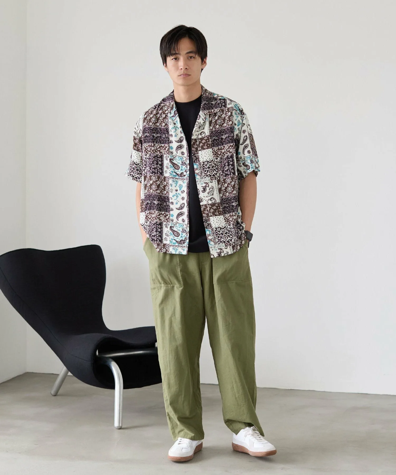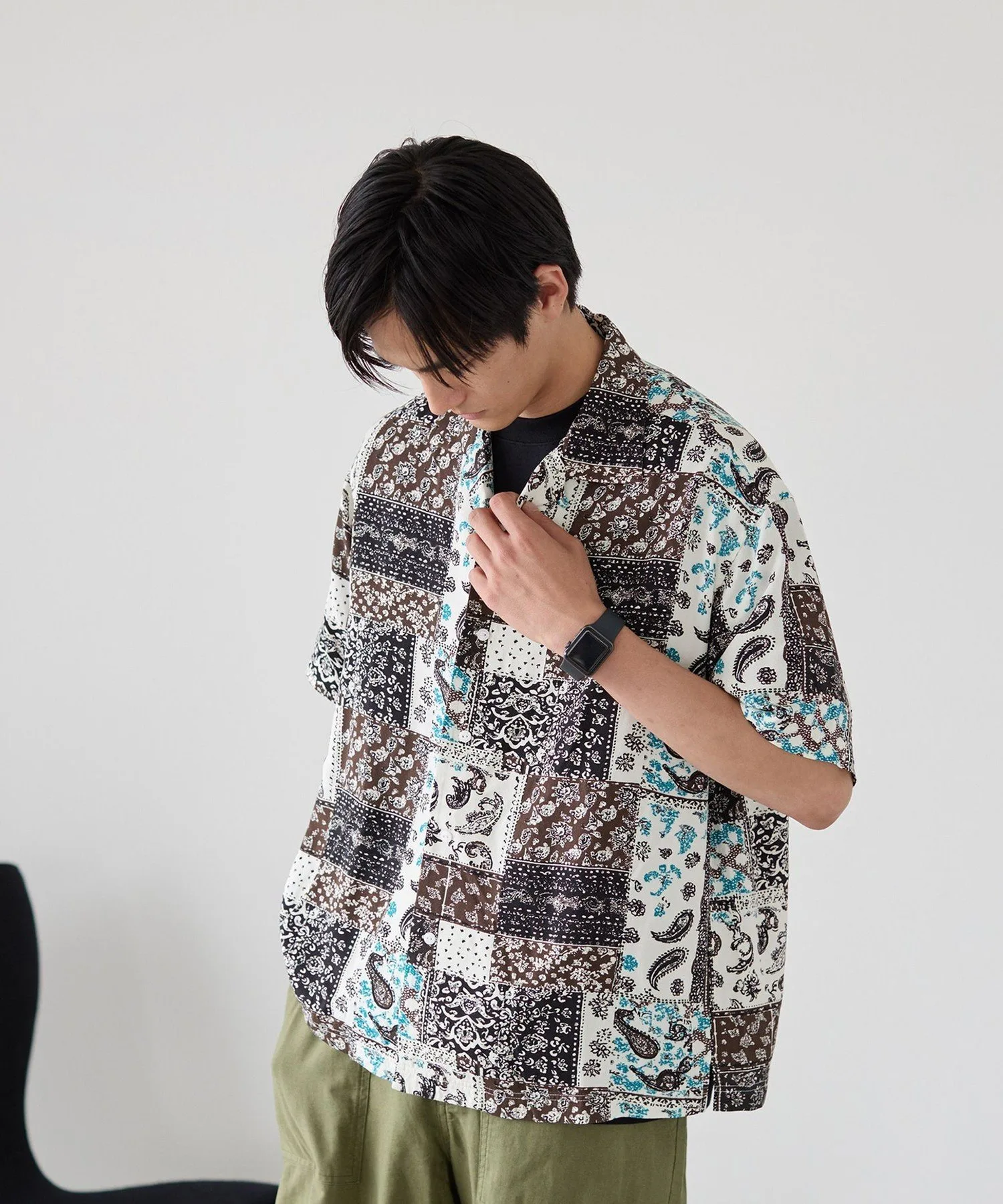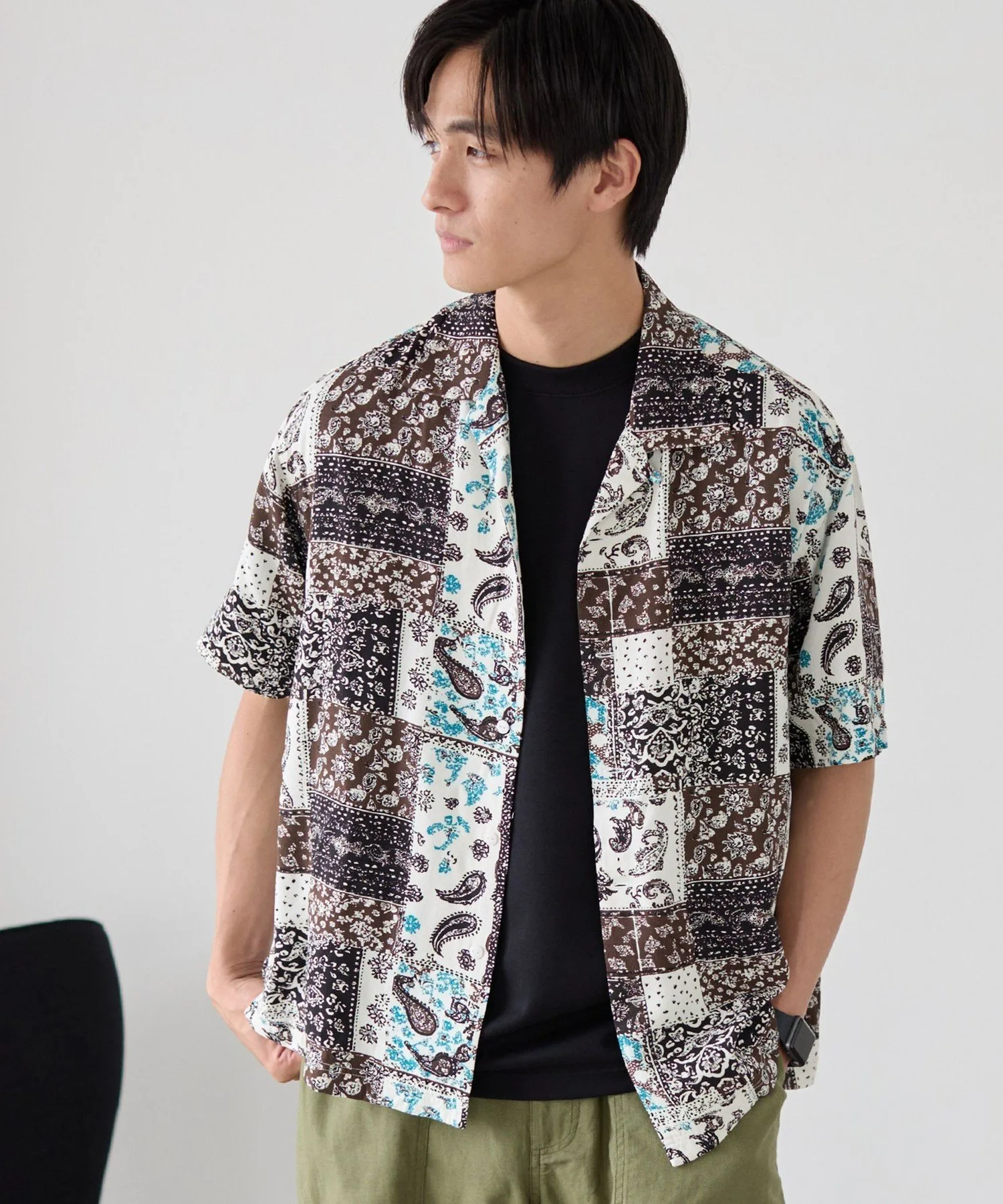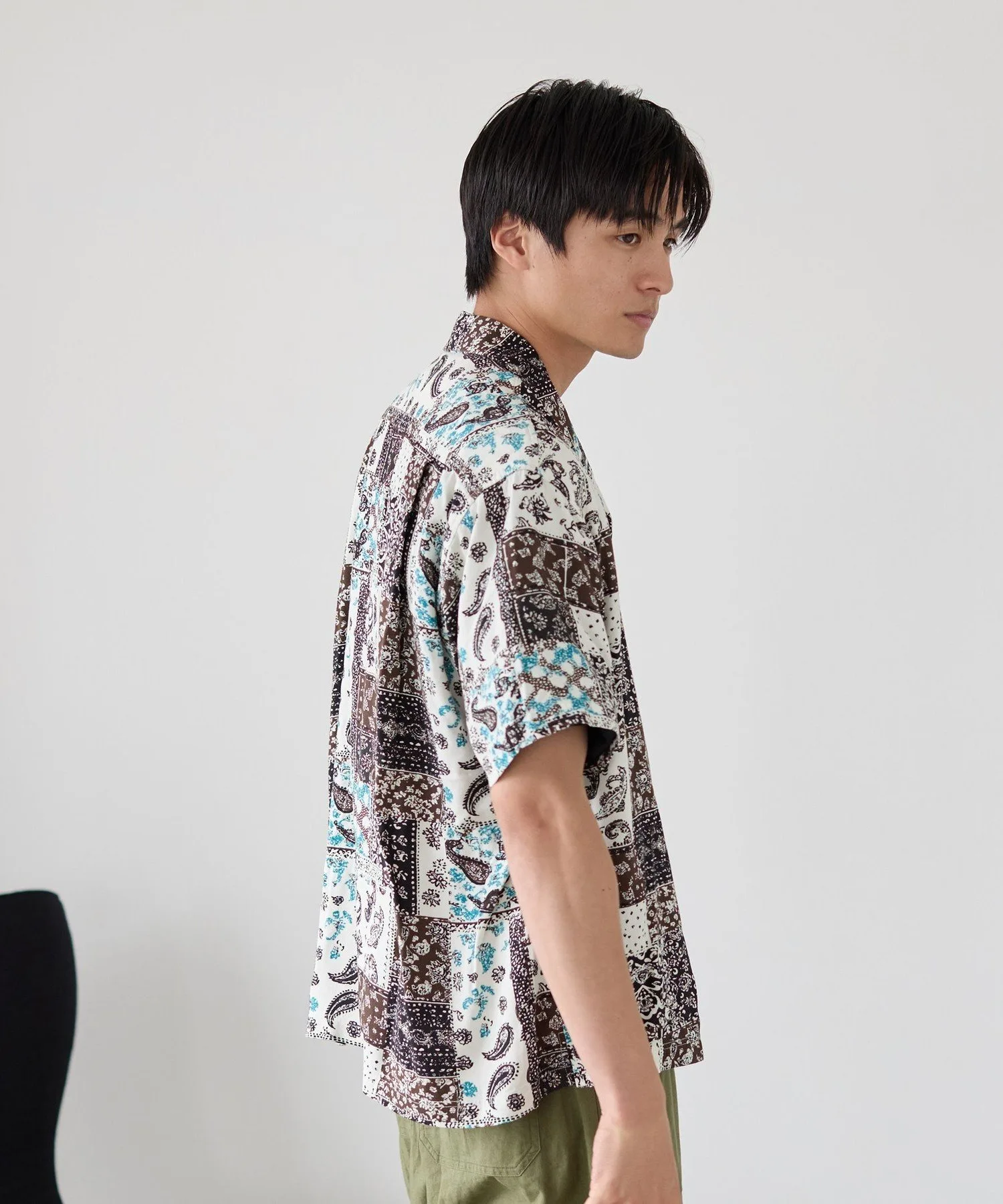 Рубашка с принтом, сочетающая в себе различные узоры, такие как батик и пейсли, в изысканном балансе.