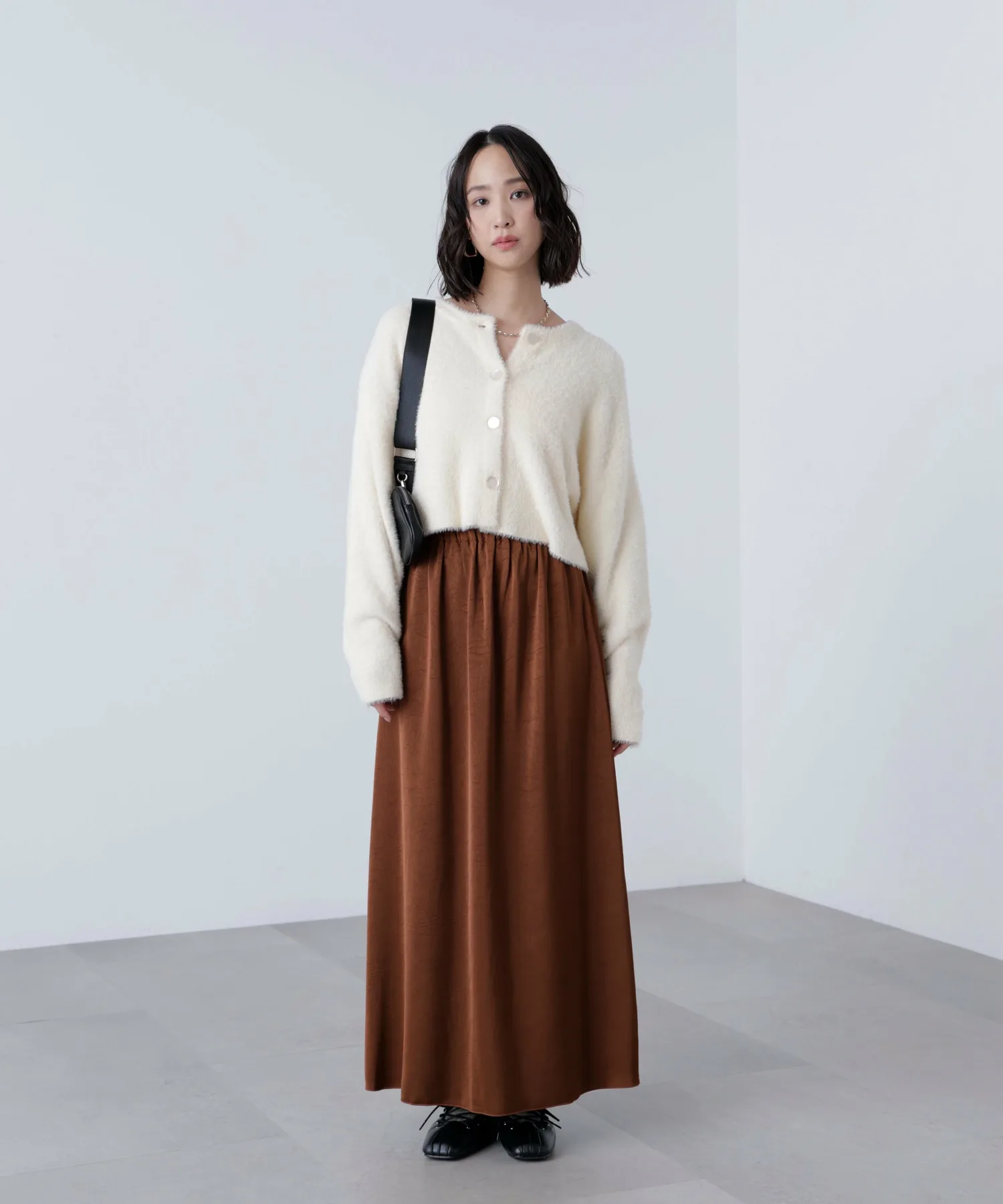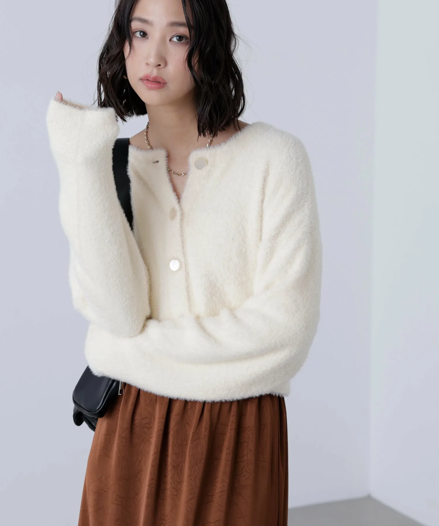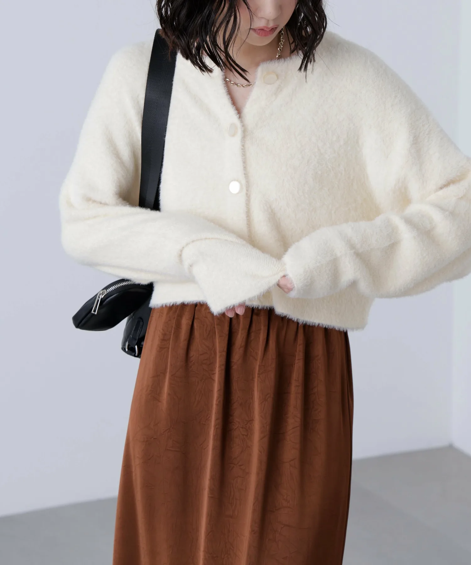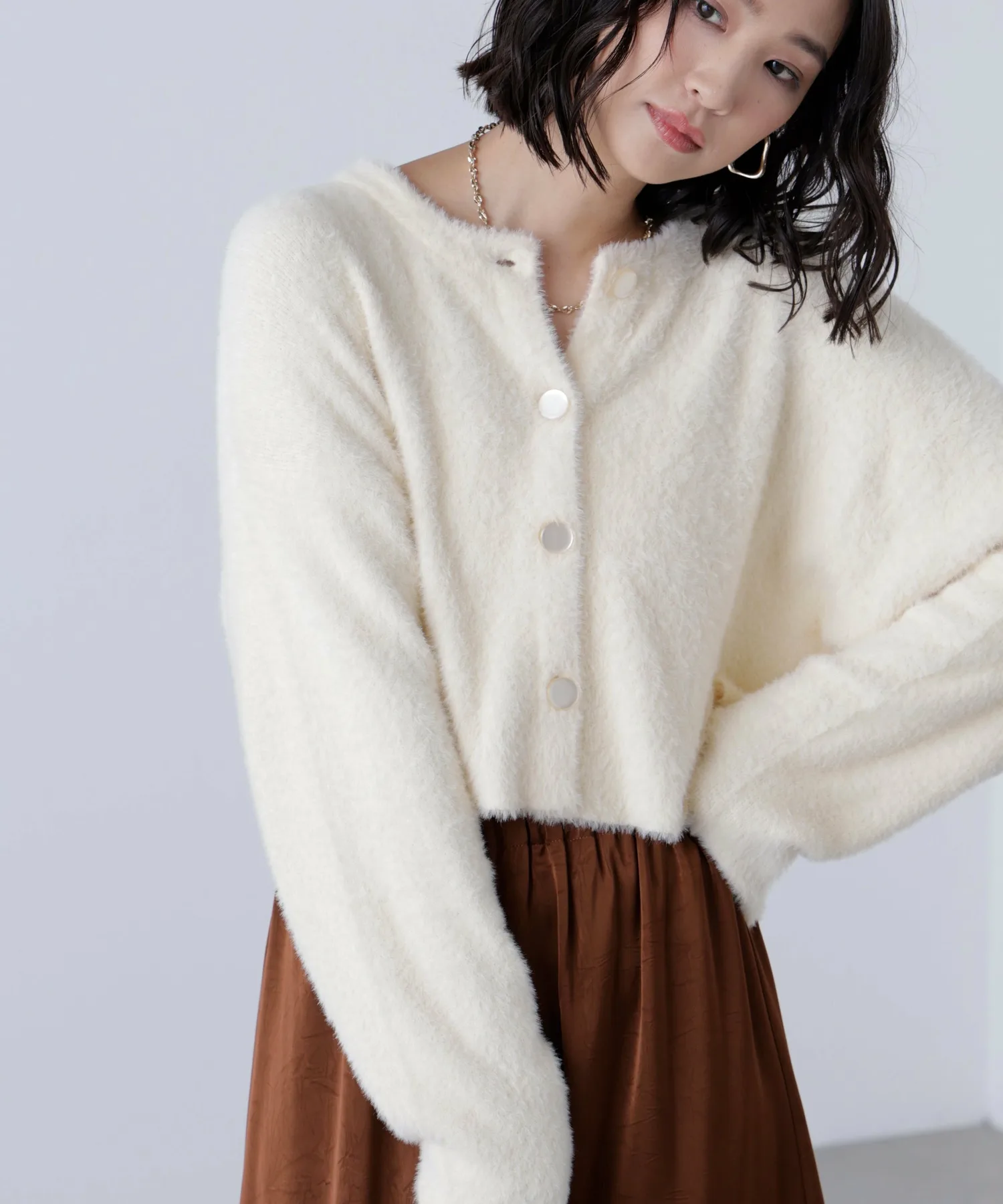 Популярный короткий трикотаж, который пользуется неизменной популярностью каждый год, возвращается в этом сезоне! Этот короткий трикотаж можно носить двумя способами: спереди и сзади, или как кардиган. Он изготовлен из мягкой, гладкой пряжи, которая имеет ворсистую структуру и не сильно линяет, поэтому не вызывает зуда на коже. Короткий ворс означает, что он не выглядит громоздким даже под пальто. Большой крой делает его объемным, не прилегая к телу, но короткая длина позволяет легко сбалансировать образ. Большие пуговицы спереди, которые соответствуют цвету ткани, также являются изюминкой.