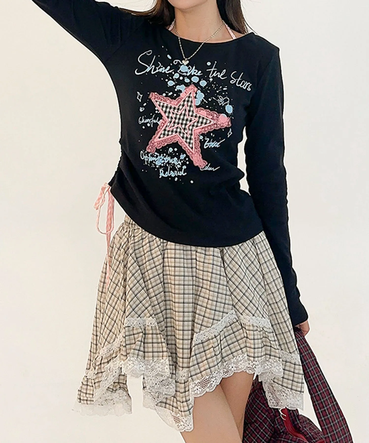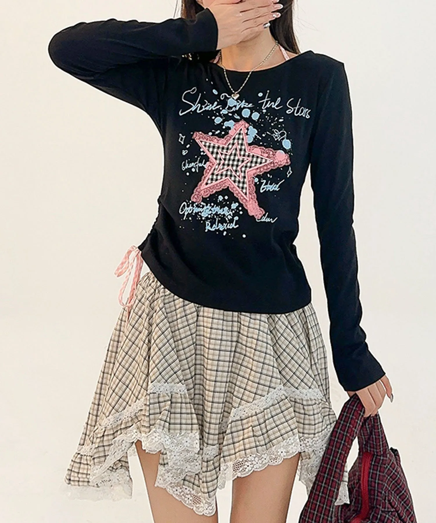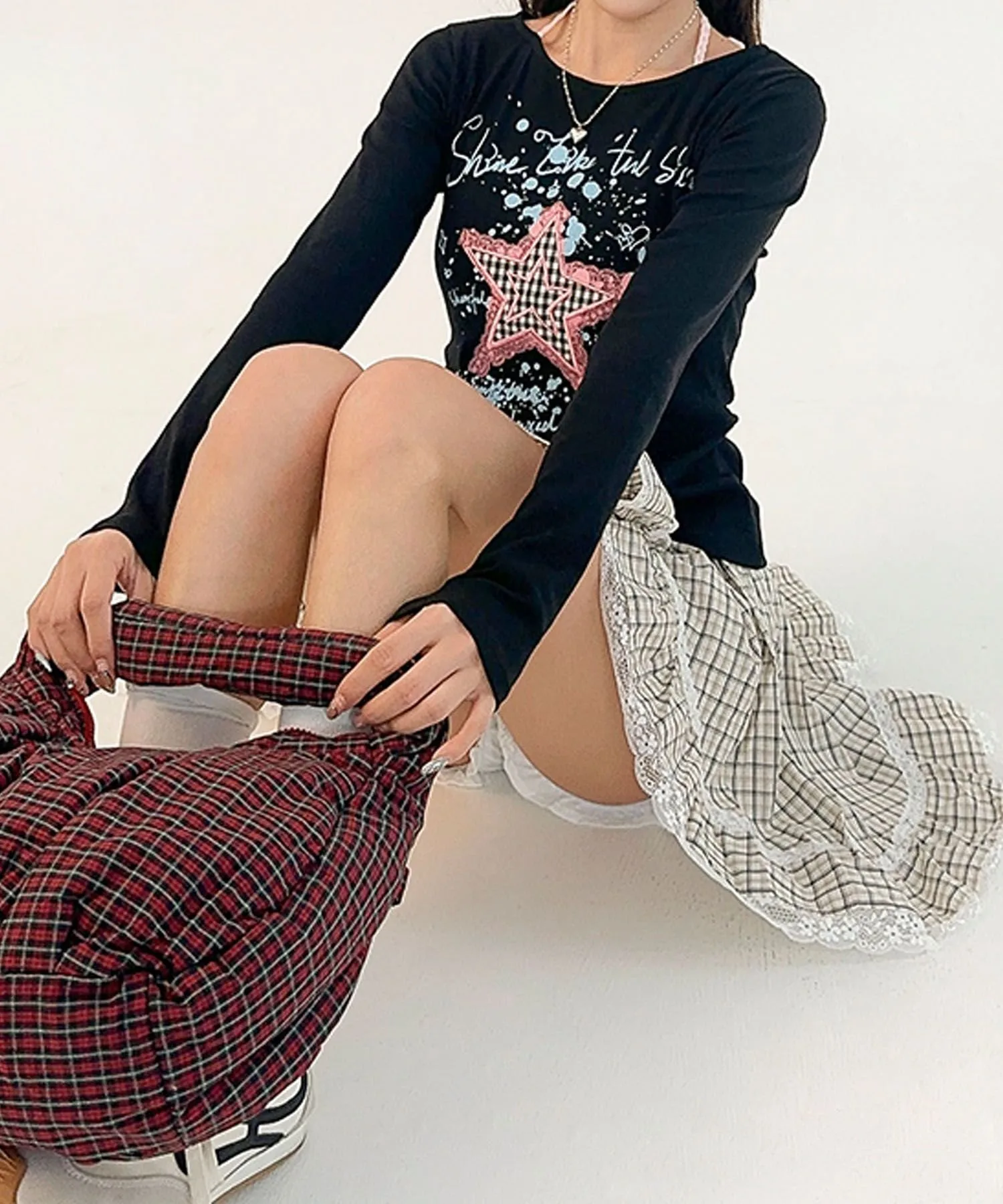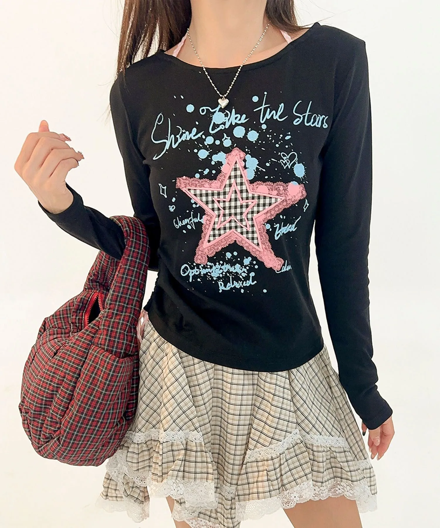 Этот топ с длинными рукавами в стиле Y2K украшен клетчатым узором в виде «звезд» спереди и принтом в виде английского логотипа в стиле «брызги». Его яркий дизайн, напоминающий граффити, идеально дополняет корейский уличный стиль и стиль Харадзюку. Нежная лента сбоку и акцент на талии создают объемный силуэт, который не выглядит слишком простым. Слегка укороченная длина — это классика стиля Y2K, и сочетание с джинсами с низкой посадкой или мини-юбкой подчеркнет ваш стиль. Изготовленный из удобного, эластичного трикотажного материала, он идеально подходит для активных мероприятий, таких как клубы, концерты и фестивали. Обязательный элемент гардероба для девушек, предпочитающих уличный стиль, — это эффектная вещь сама по себе.