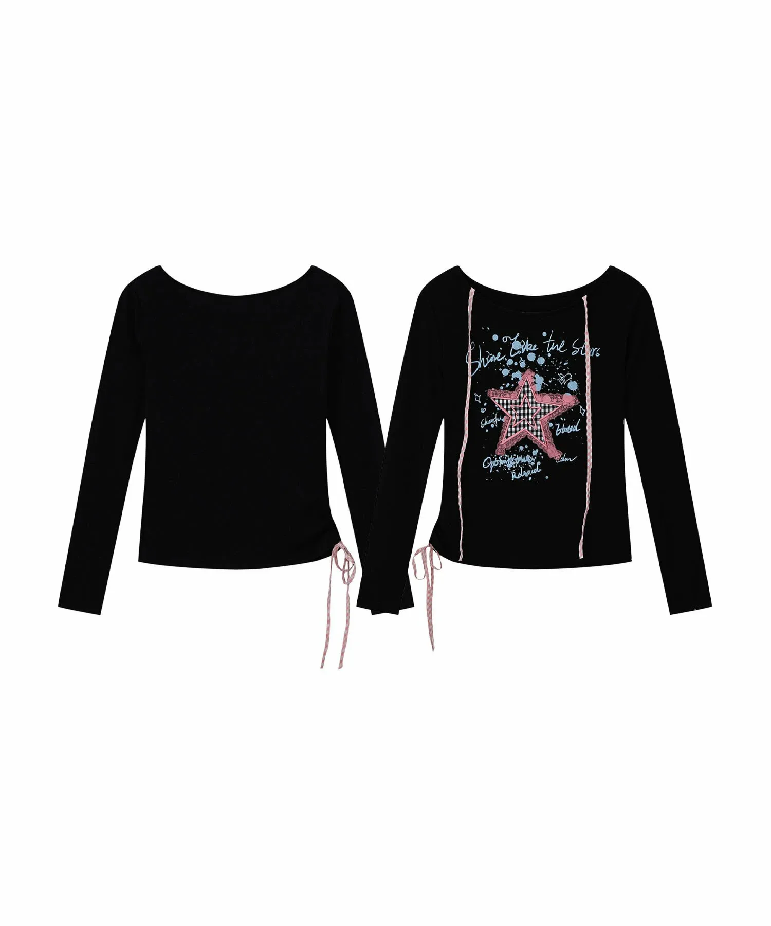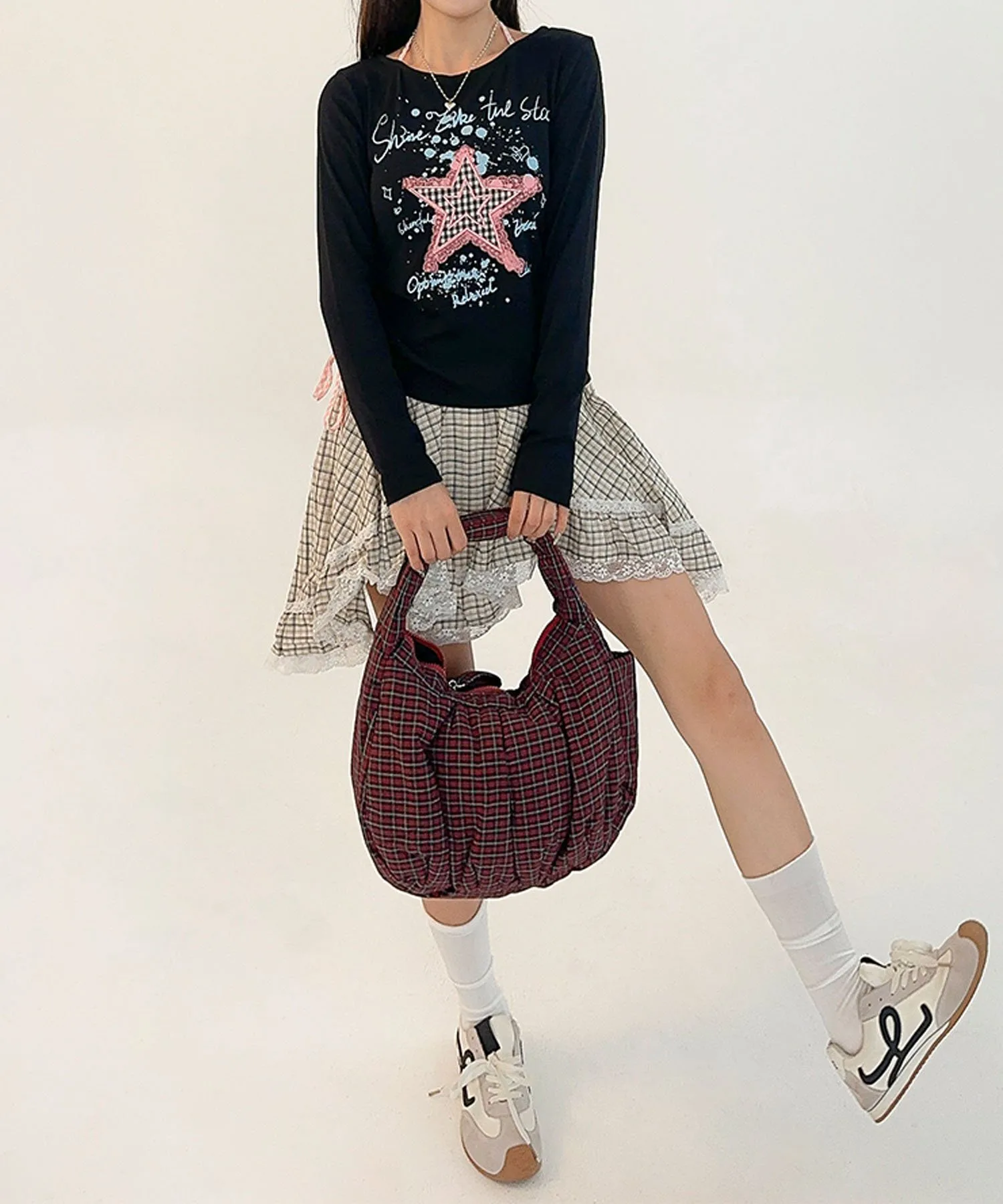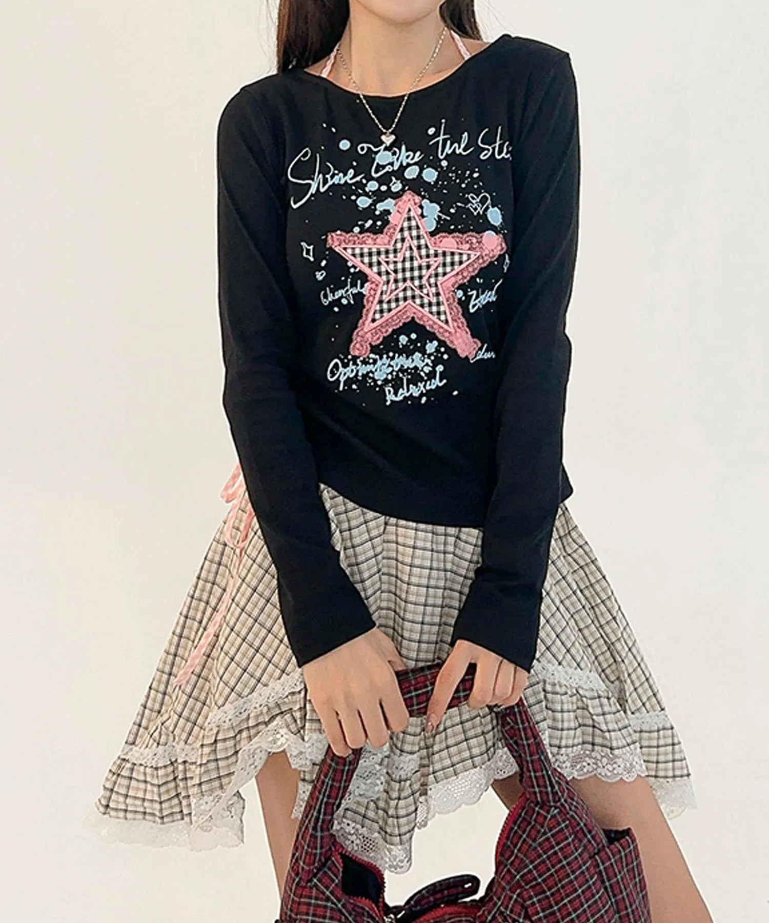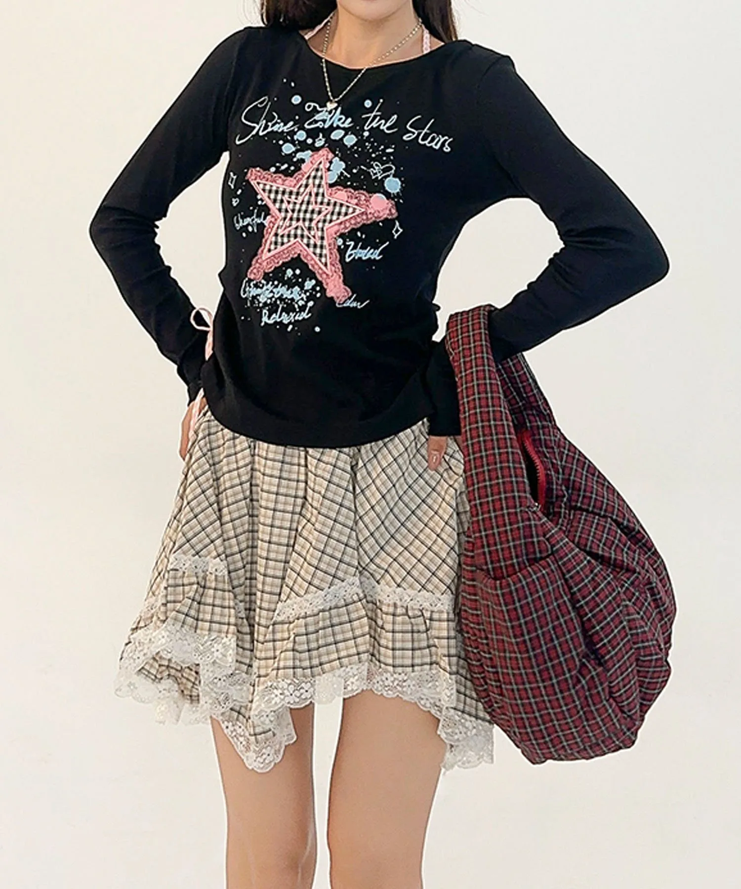 Этот топ с длинными рукавами в стиле Y2K украшен клетчатым узором в виде «звезд» спереди и принтом в виде английского логотипа в стиле «брызги». Его яркий дизайн, напоминающий граффити, идеально дополняет корейский уличный стиль и стиль Харадзюку. Нежная лента сбоку и акцент на талии создают объемный силуэт, который не выглядит слишком простым. Слегка укороченная длина — это классика стиля Y2K, и сочетание с джинсами с низкой посадкой или мини-юбкой подчеркнет ваш стиль. Изготовленный из удобного, эластичного трикотажного материала, он идеально подходит для активных мероприятий, таких как клубы, концерты и фестивали. Обязательный элемент гардероба для девушек, предпочитающих уличный стиль, — это эффектная вещь сама по себе.
