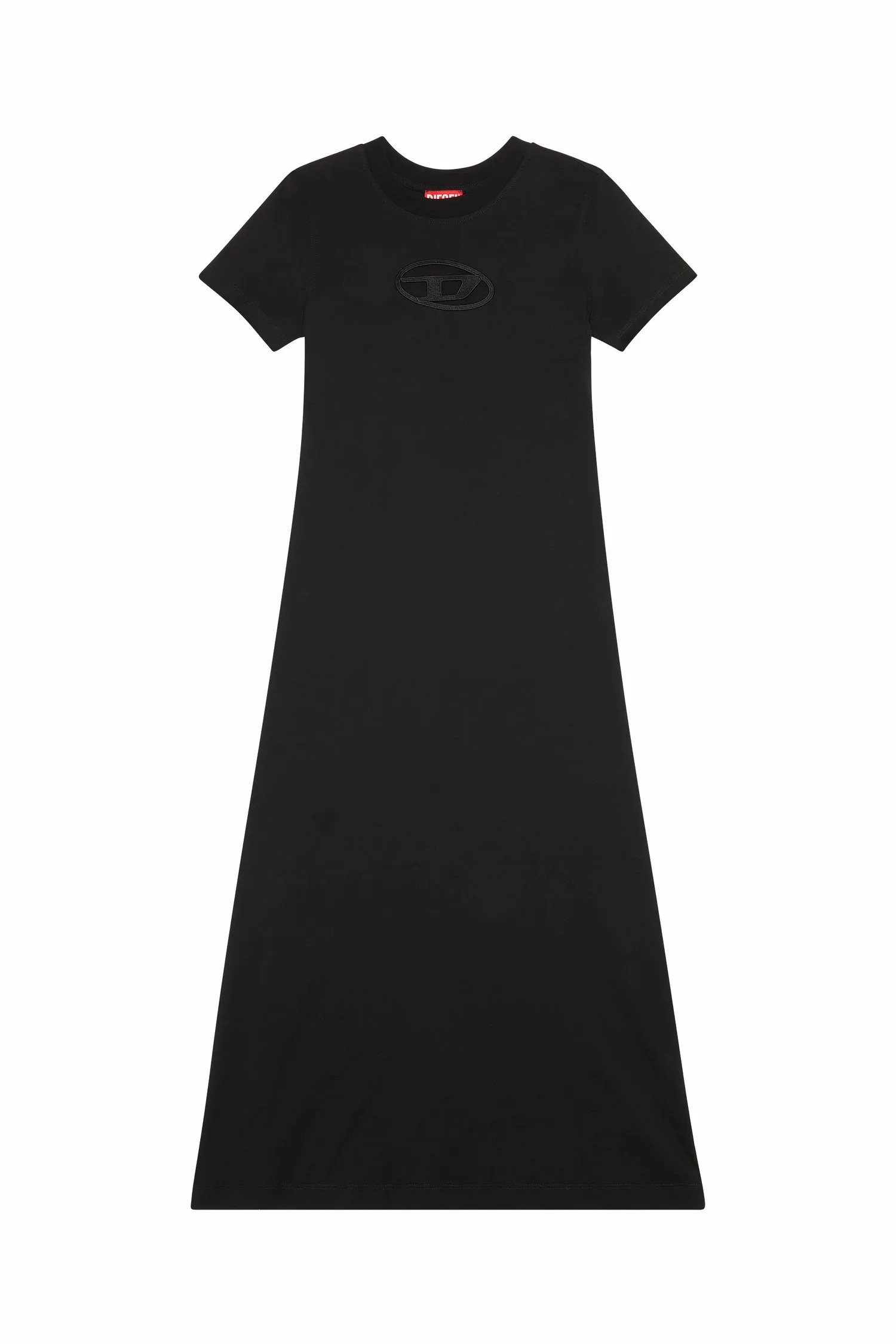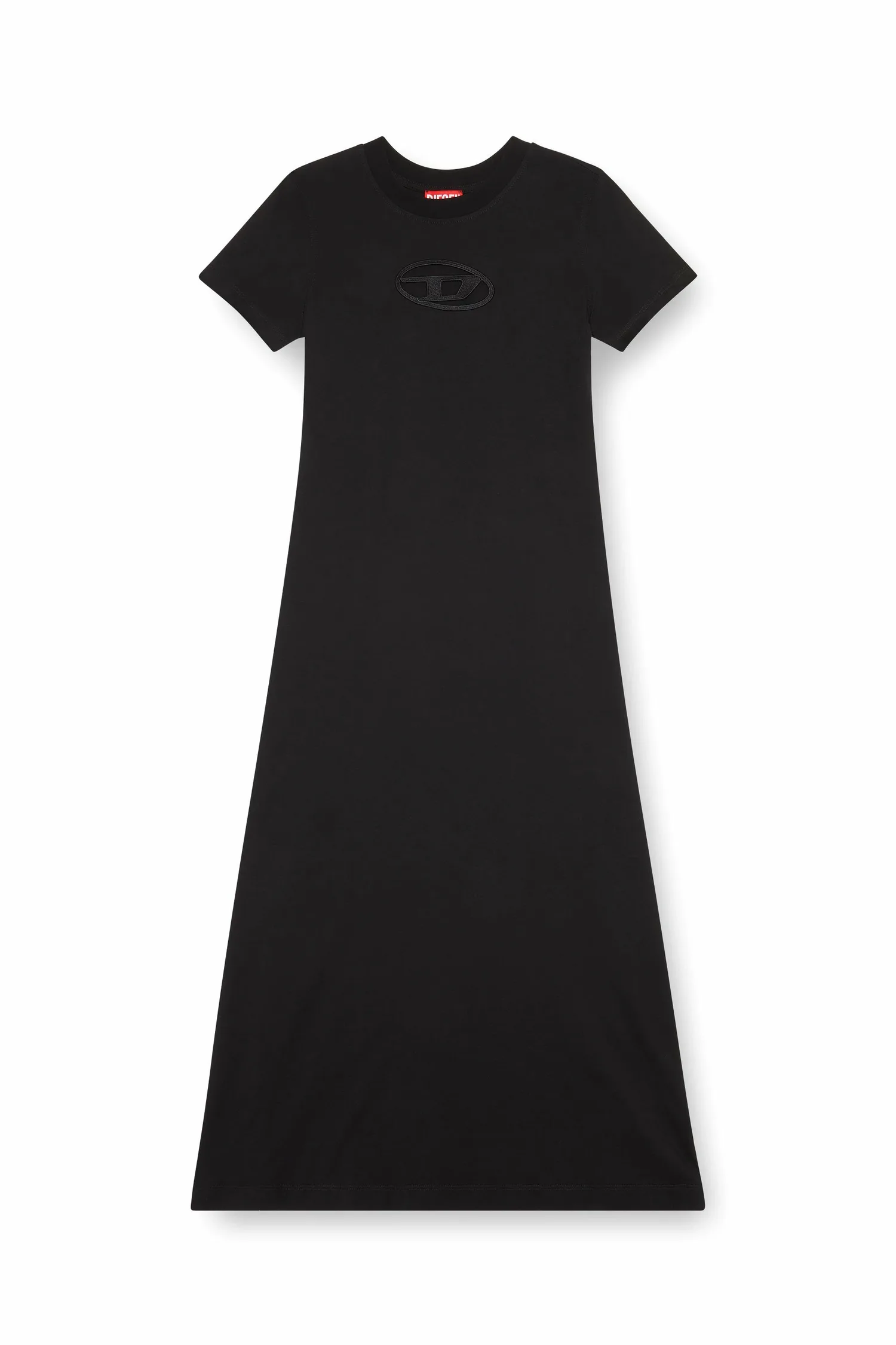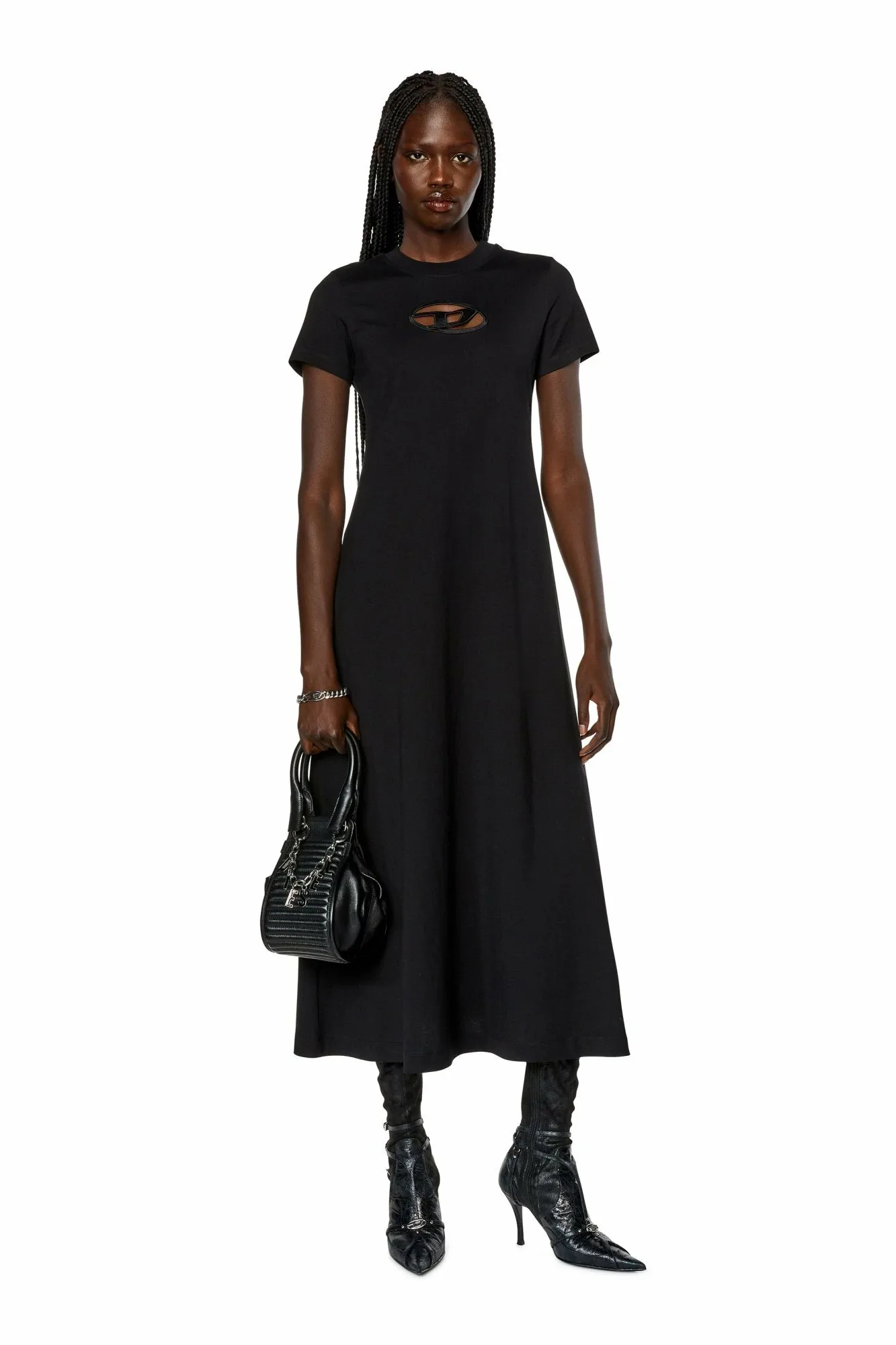 Сексуальное платье с короткими рукавами и вышитым овальным логотипом в виде буквы D. Силуэт А-образной формы, подчеркивающий талию и расклешенный, а также длина миди создают образ, который не выглядит слишком повседневным. Еще одна привлекательная особенность — мягкая и приятная на ощупь хлопковая трикотажная ткань. Дизайн сочетает в себе женственность и свободу движений, что делает его универсальным для самых разных случаев, от повседневной носки до курортных образов.