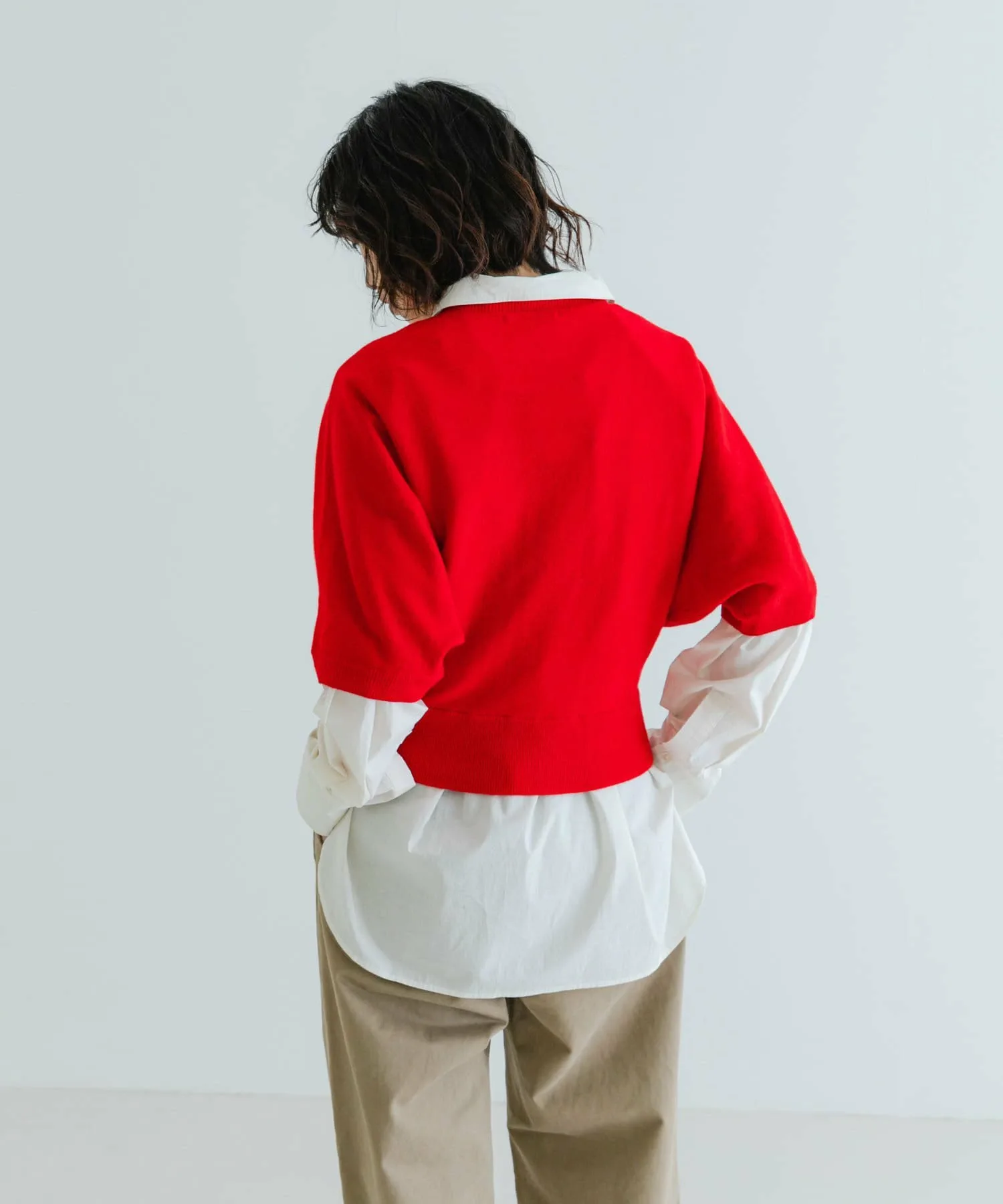 Изящный трикотаж с коротким рукавом из тонкой шерстяной пряжи, оптимальной толщины. Рукава «летучая мышь» достаточно свободно ниспадают, создавая динамичный силуэт.