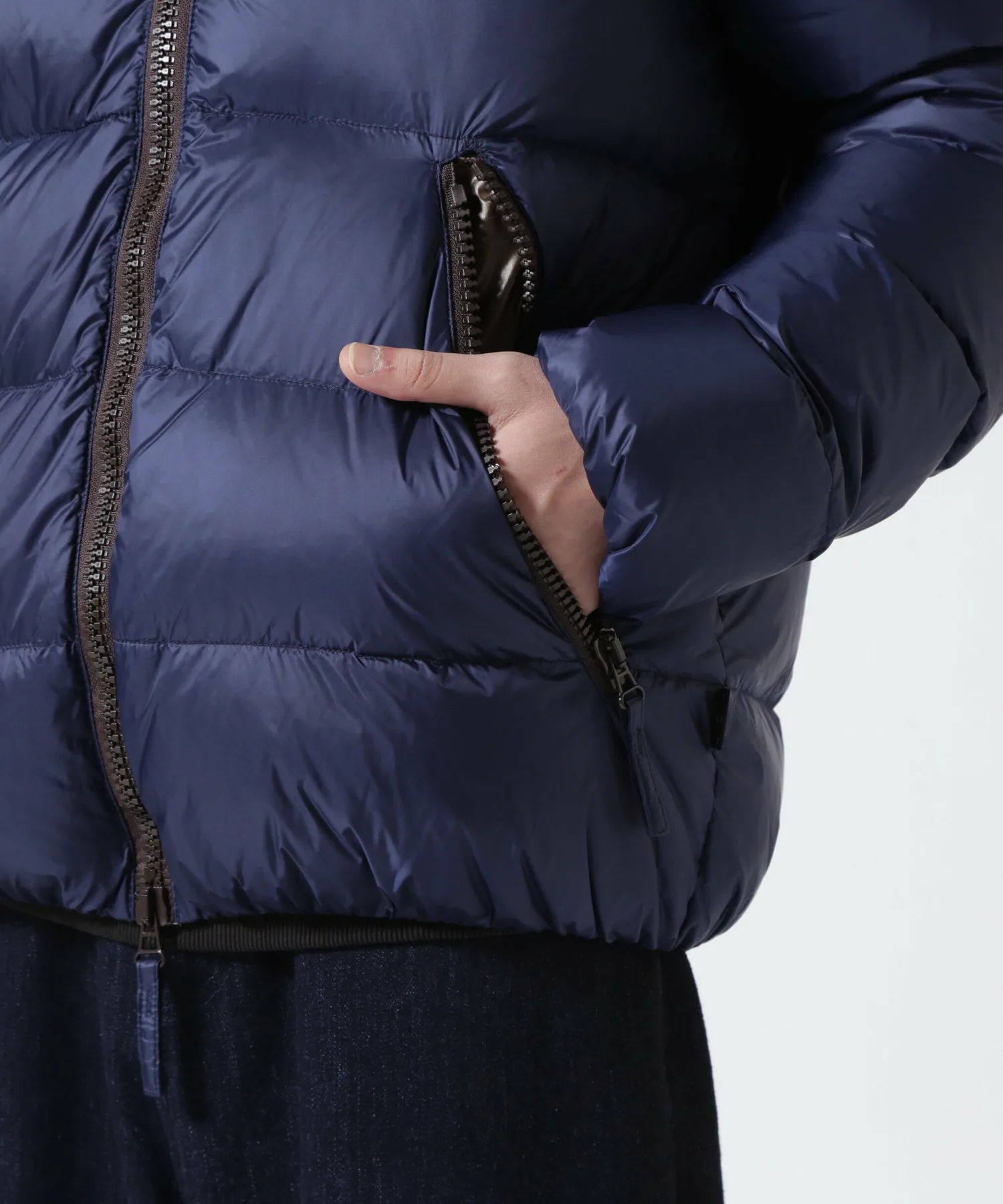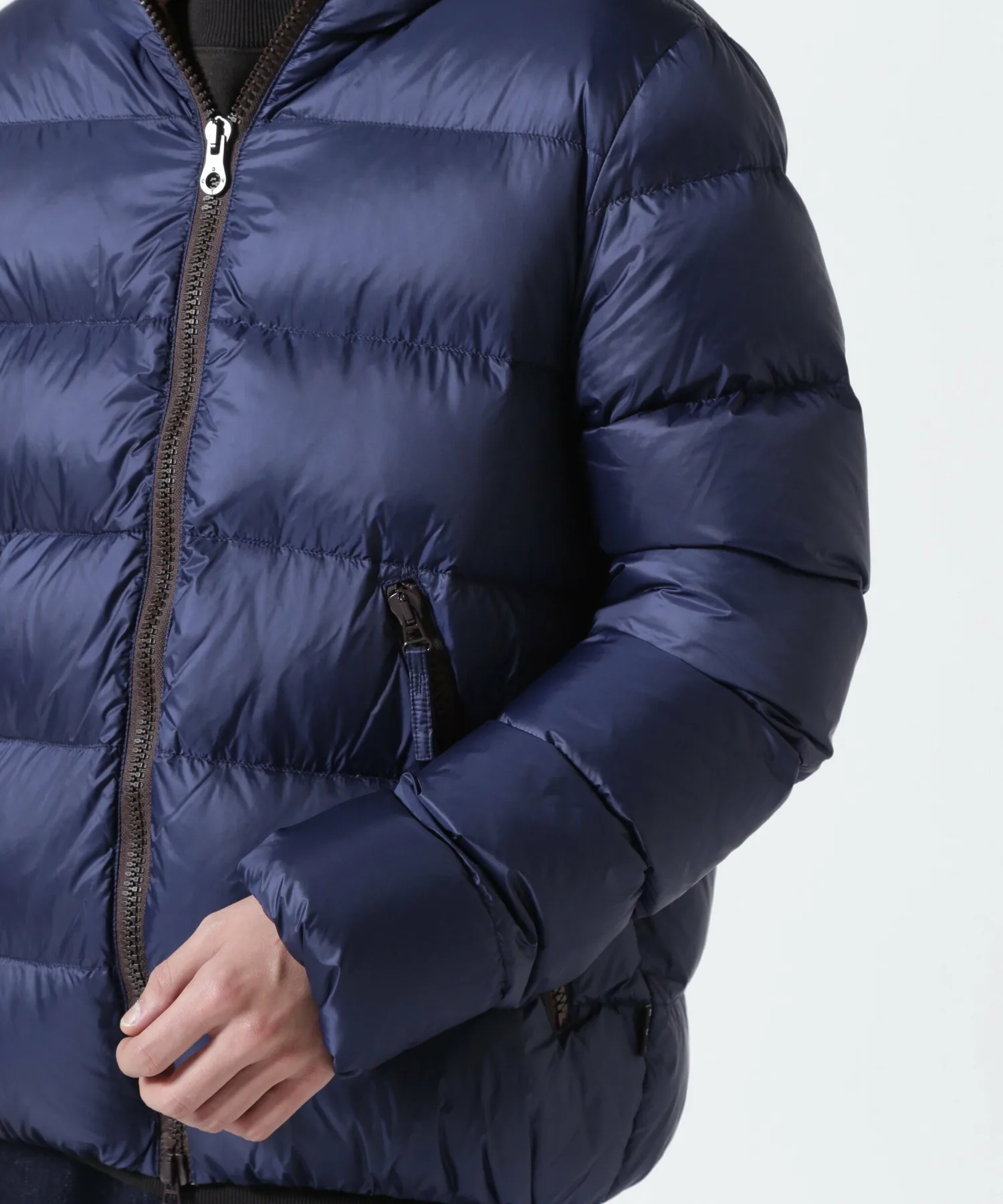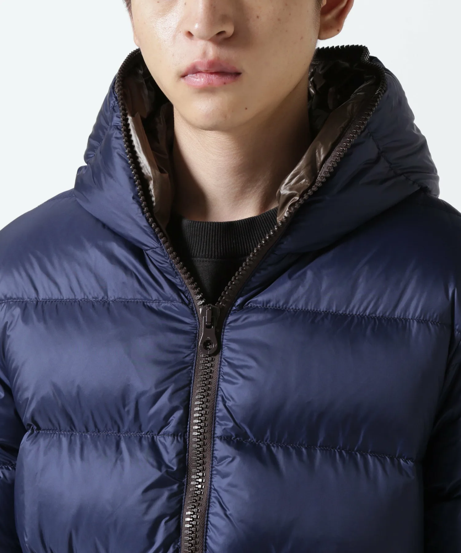 Куртка с застежкой-молнией по всей длине имеет двойную молнию, которая доходит до самого верха капюшона — культового элемента бренда. Внешняя ткань, подкладка и молния выполнены в изысканных цветах для создания расслабленного ощущения. Стежка по краю создает четкую, текстурированную поверхность. Сохраняя четыре отличительные особенности этой куртки, включая продуманный объем пуха, который защищает от холода в середине зимы, не создавая ощущения громоздкости, куртка теперь имеет новую, слегка блестящую нейлоновую внешнюю ткань. Кроме того, благодаря тонкой настройке ширины и размера шва, эта короткая пуховая куртка с капюшоном, фирменная модель DUVETICA, была переработана для более минималистичного и спортивного стиля.
