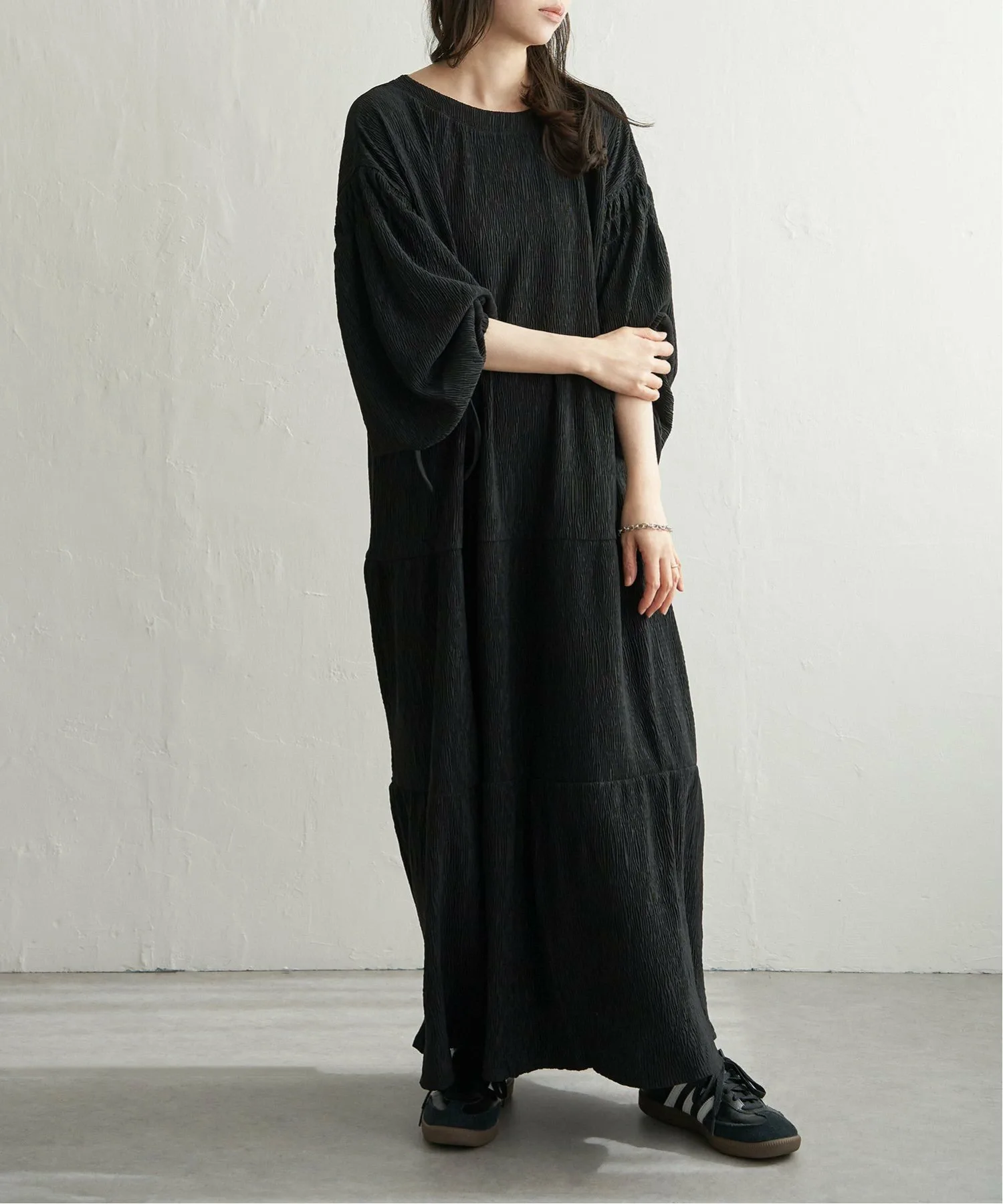 Текстурированная креповая ткань и мягкий, струящийся силуэт создают простой, но привлекательный образ.