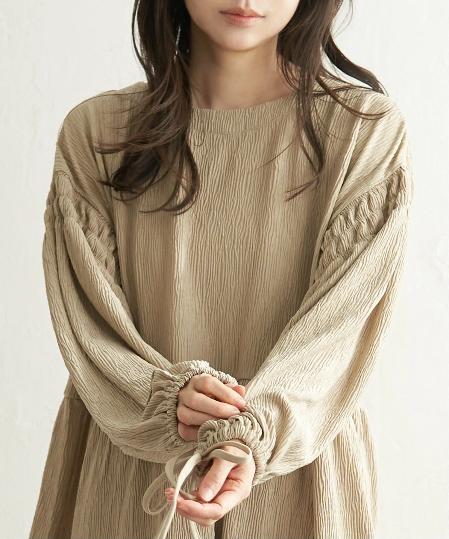 Текстурированная креповая ткань и мягкий, струящийся силуэт создают простой, но привлекательный образ.