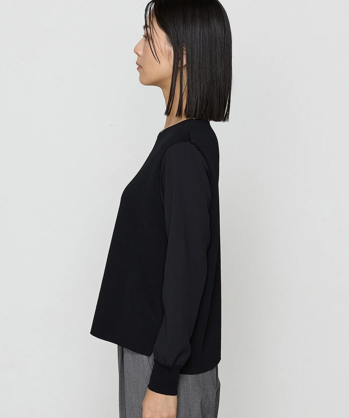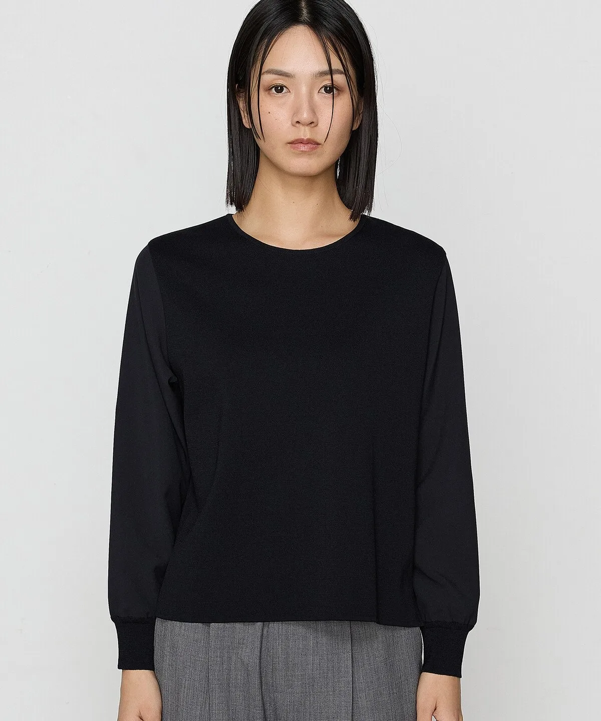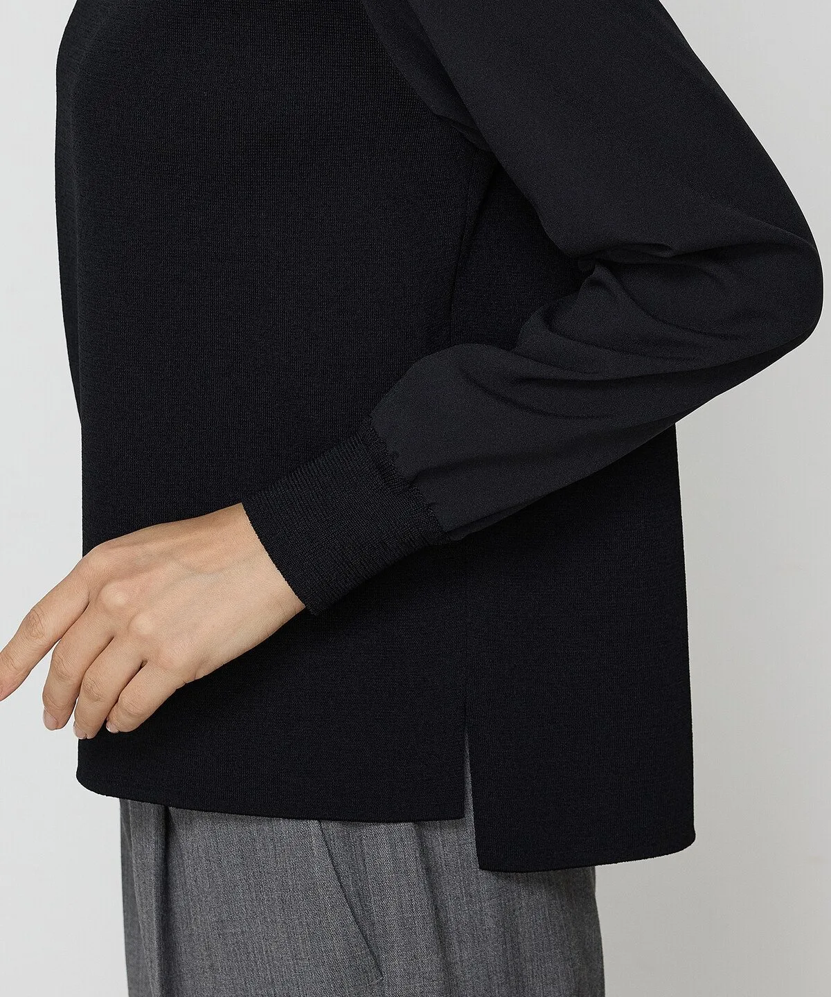 Этот трикотаж представляет собой сочетание гладкой миланской ребристой вязки и тканых рукавов.