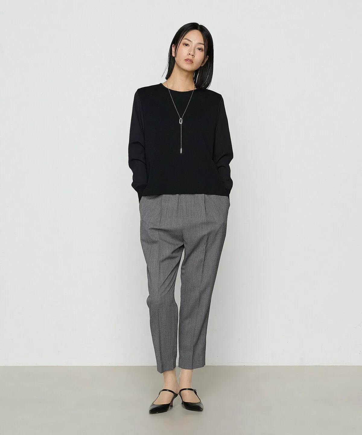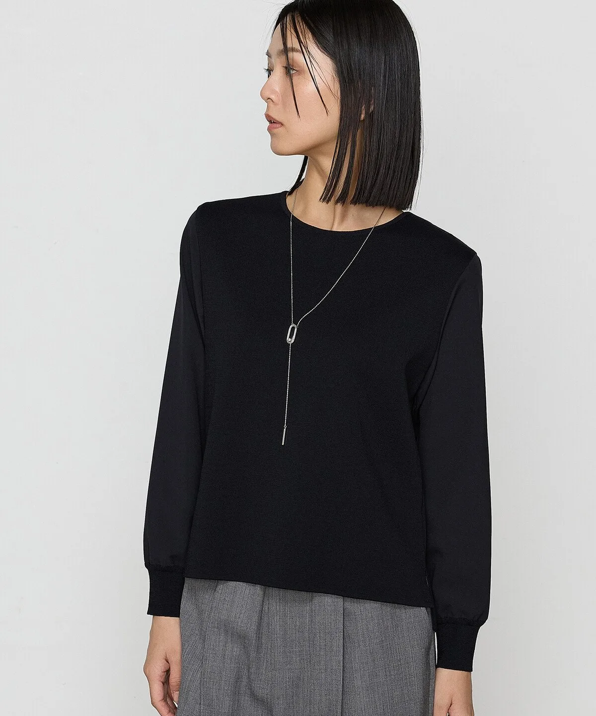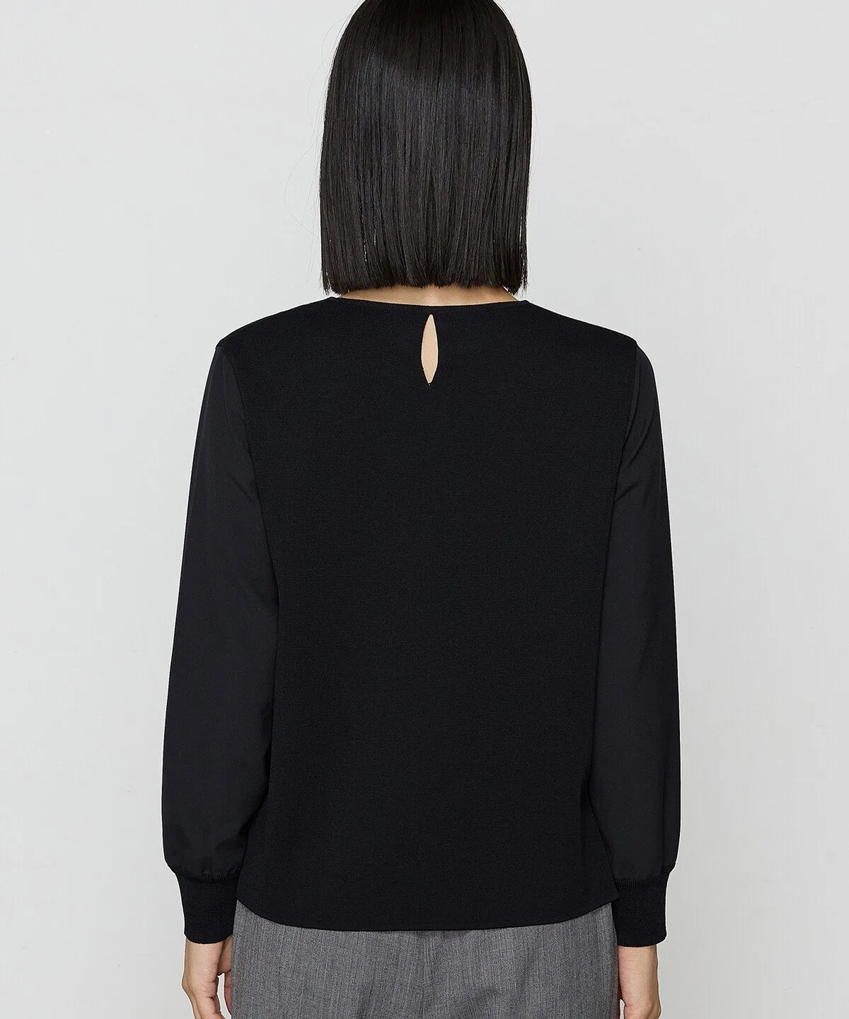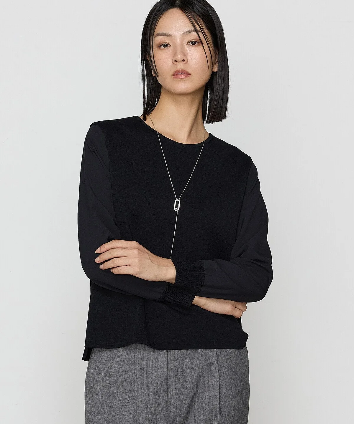 Этот трикотаж представляет собой сочетание гладкой миланской ребристой вязки и тканых рукавов.