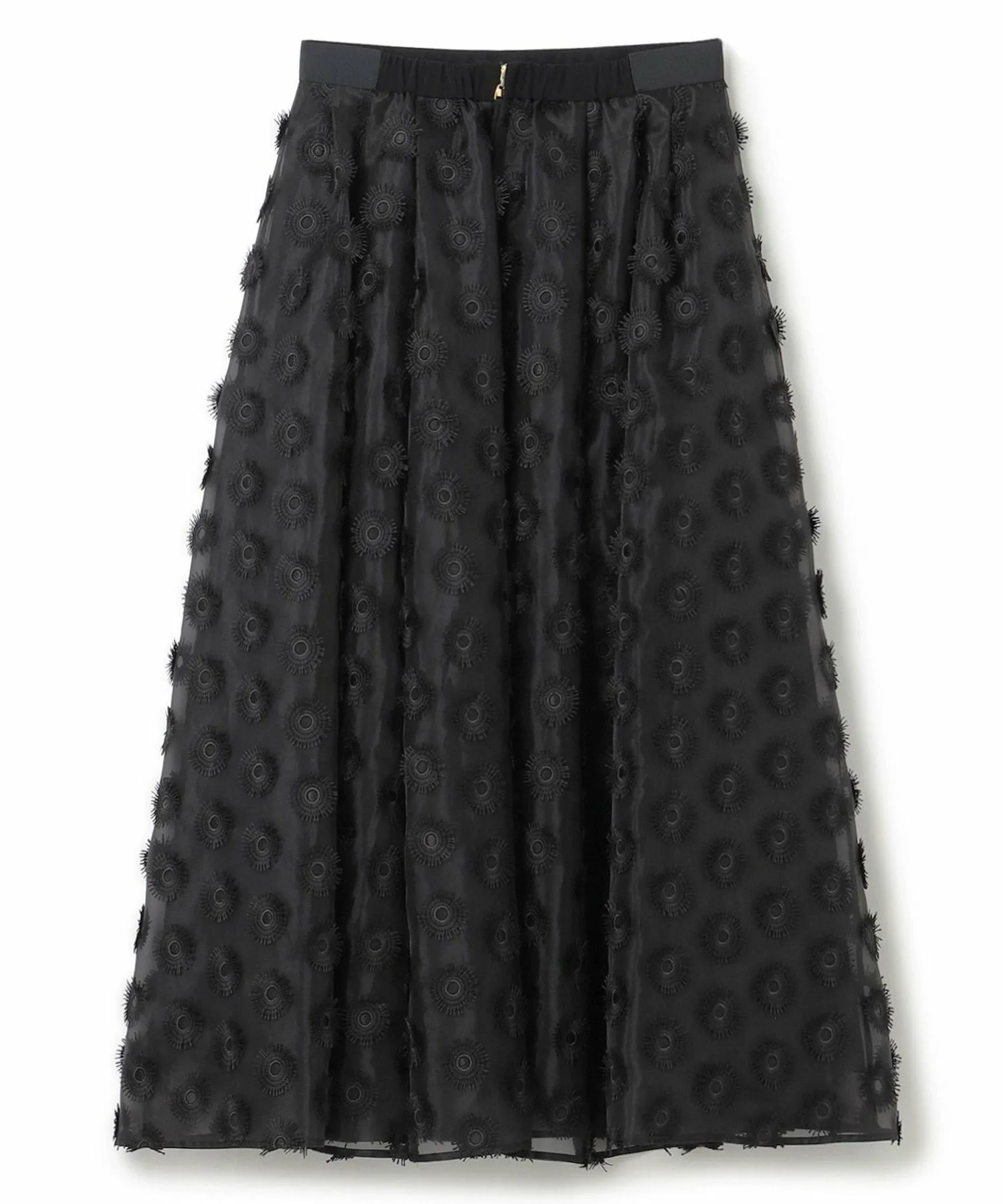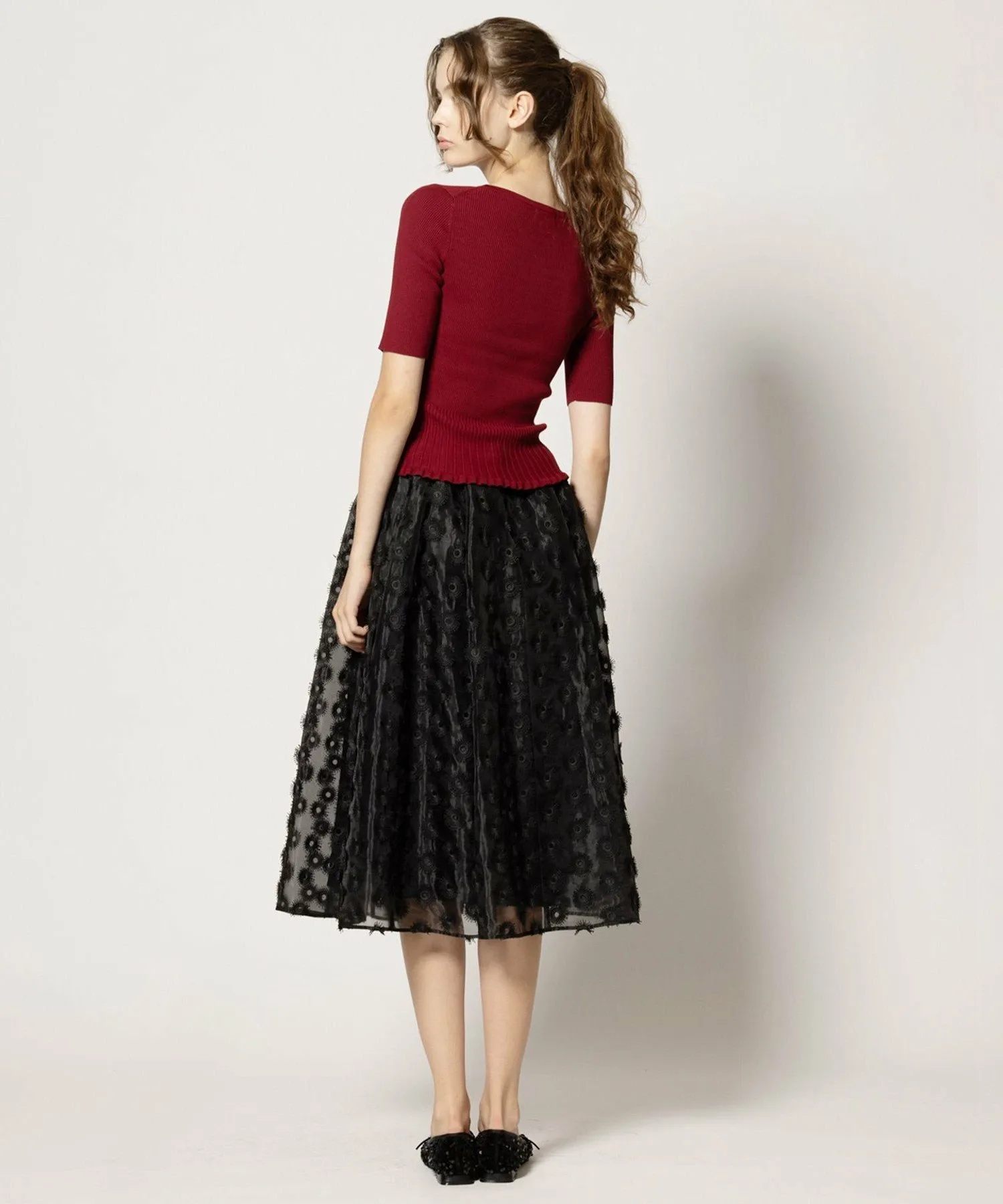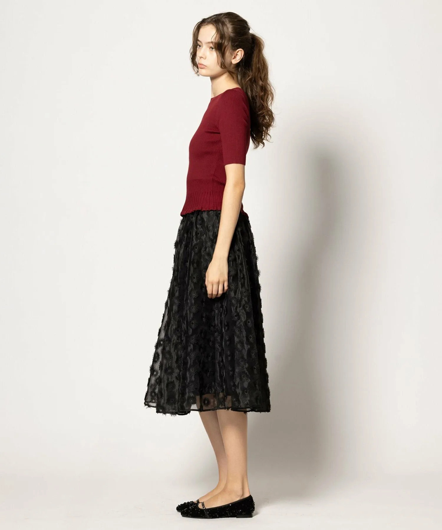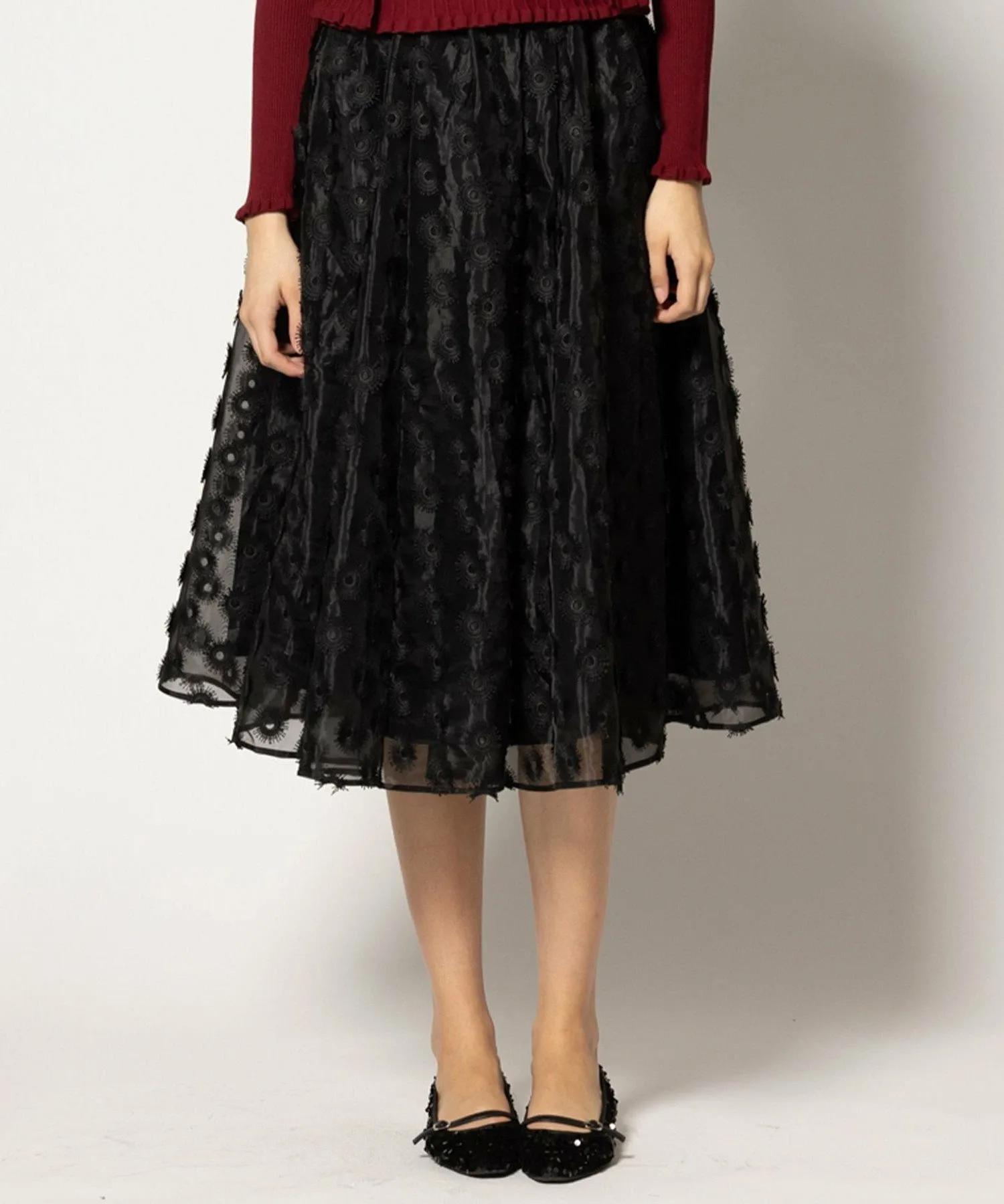 Эта юбка из органзы с вышивкой украшена привлекательными, пышными, парящими лепестками.