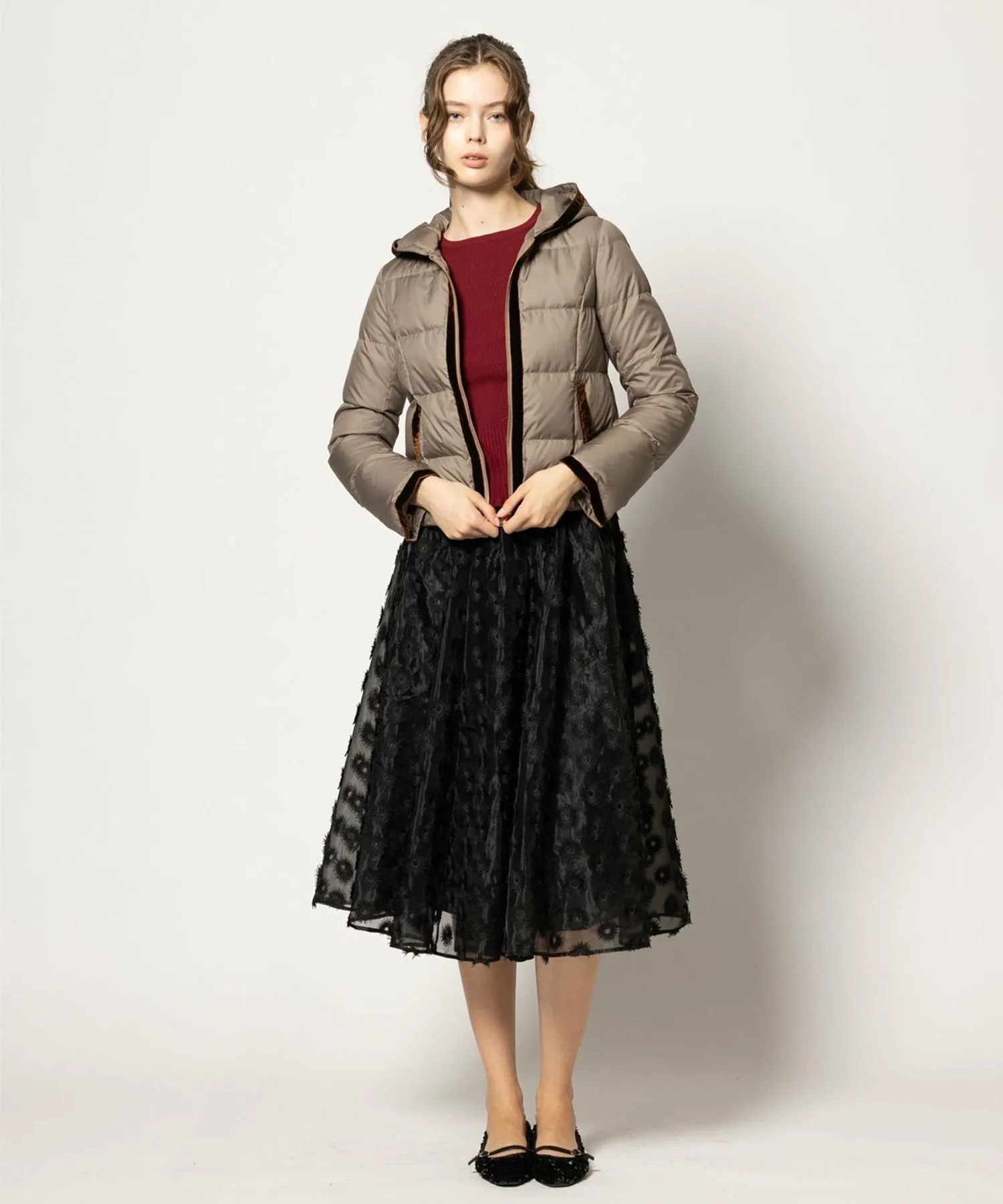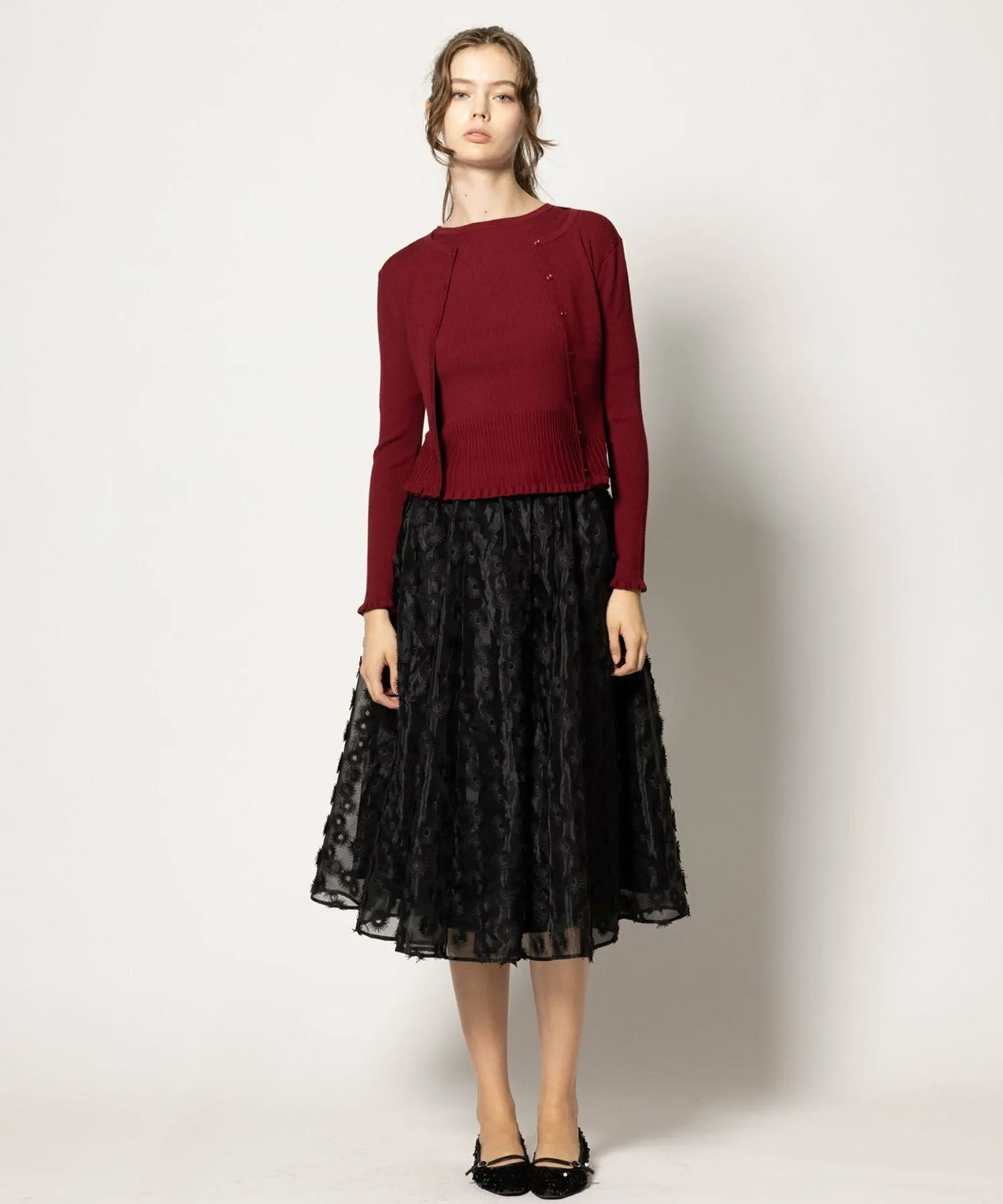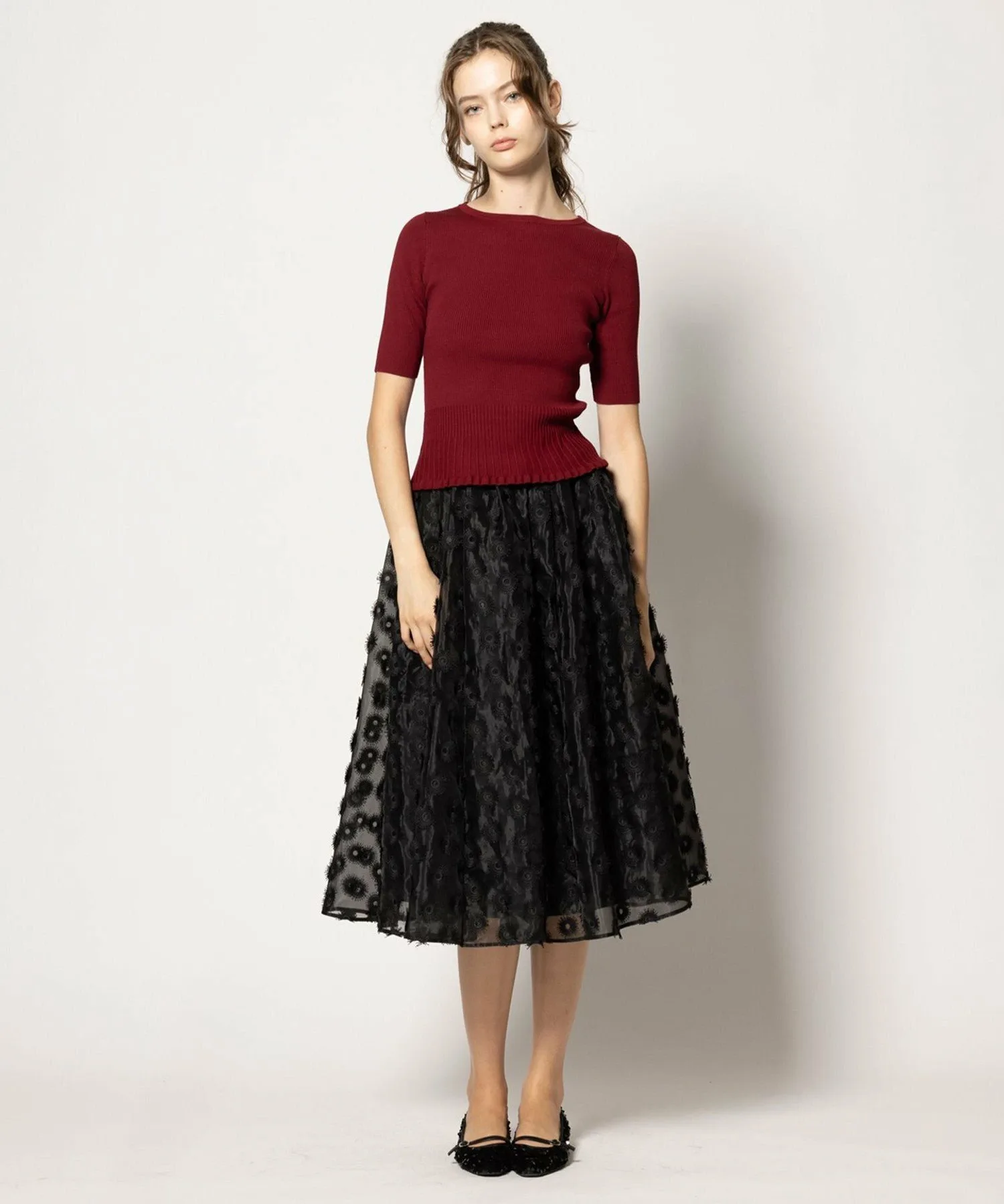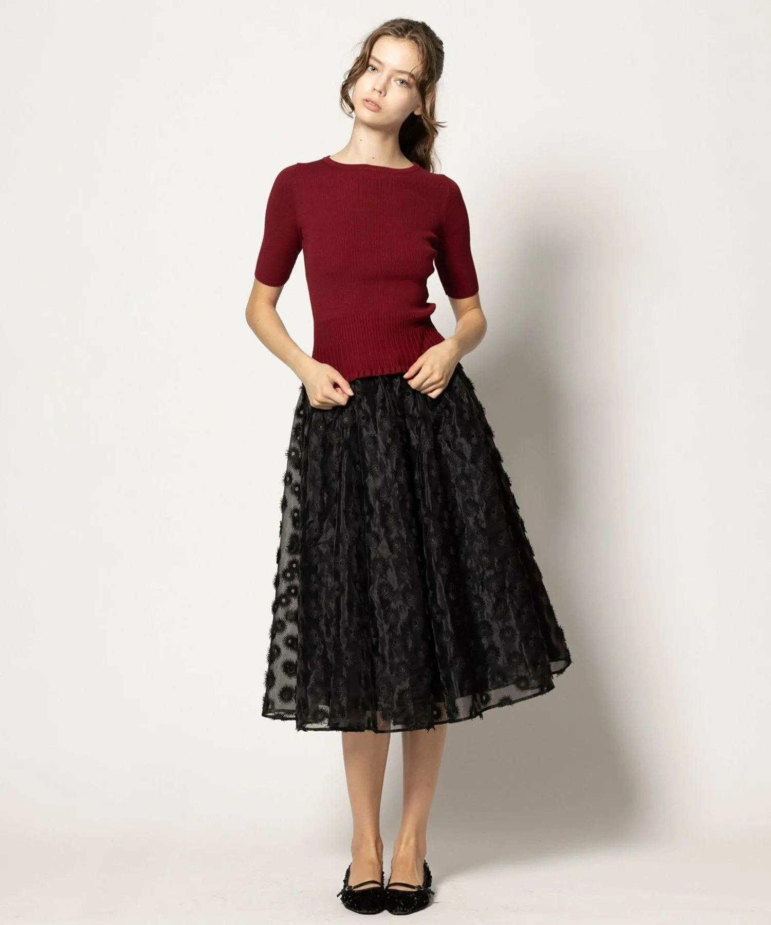 Эта юбка из органзы с вышивкой украшена привлекательными, пышными, парящими лепестками.