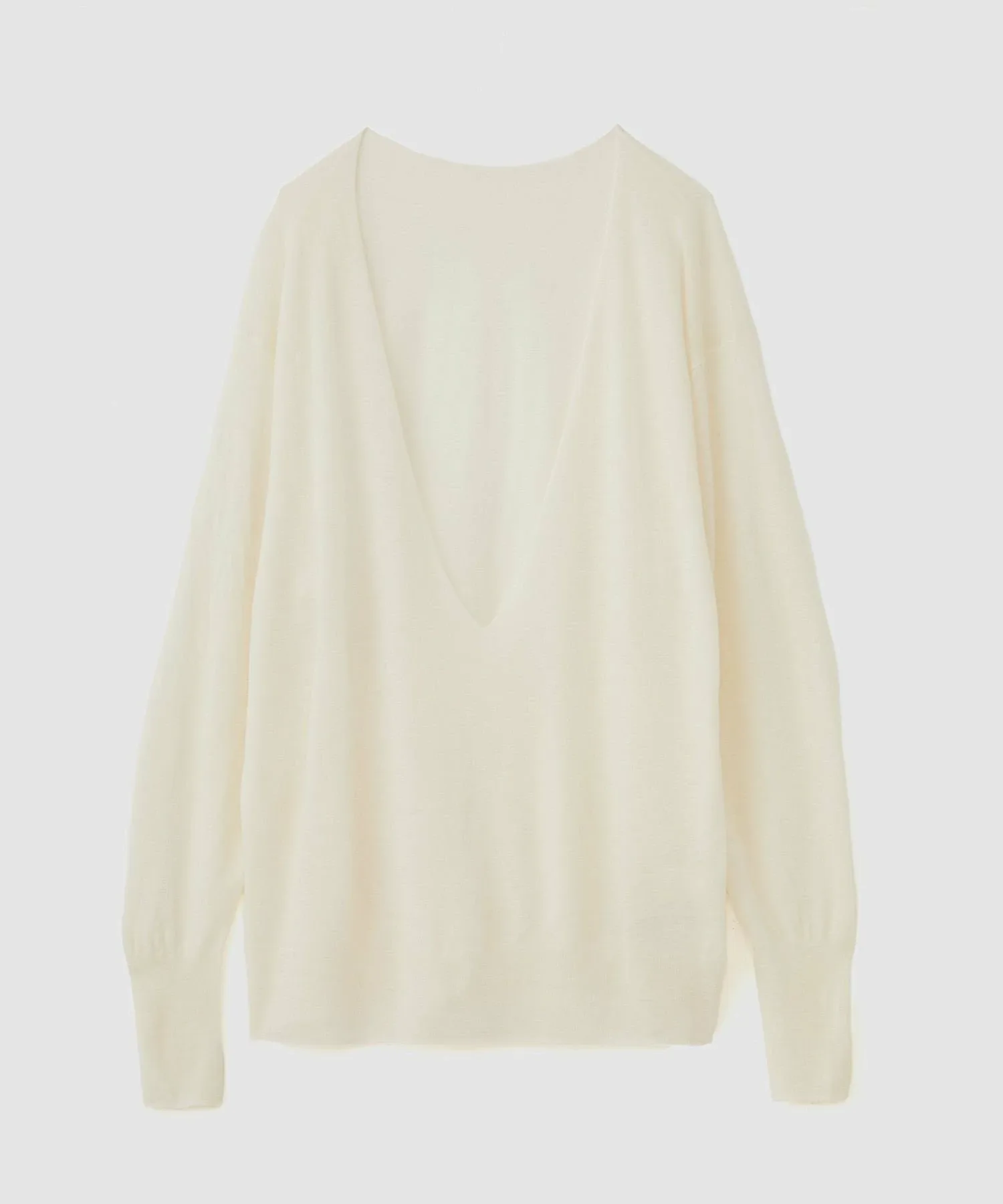 Прозрачный пуловер с глубоким V-образным вырезом, позволяющий носить его поверх другой одежды. Его привлекательность заключается в возможности менять образ в зависимости от нижнего белья. Основная часть имеет свободный крой, а рукава длинные. Есть отверстия для больших пальцев, поэтому его можно носить и так, чтобы он выглядывал из-под верхней одежды.