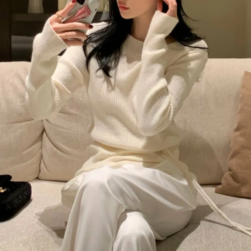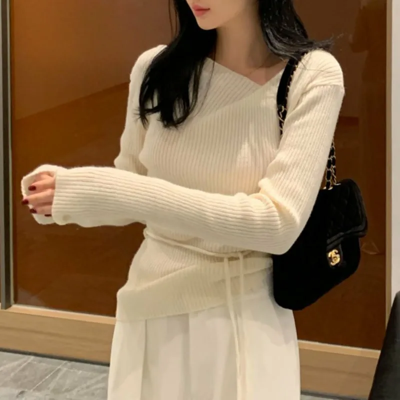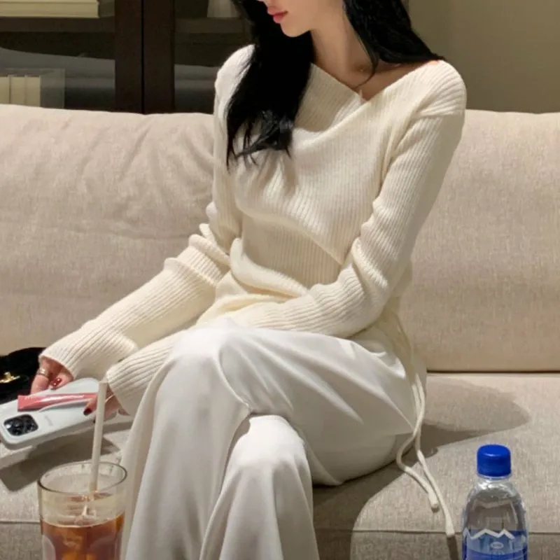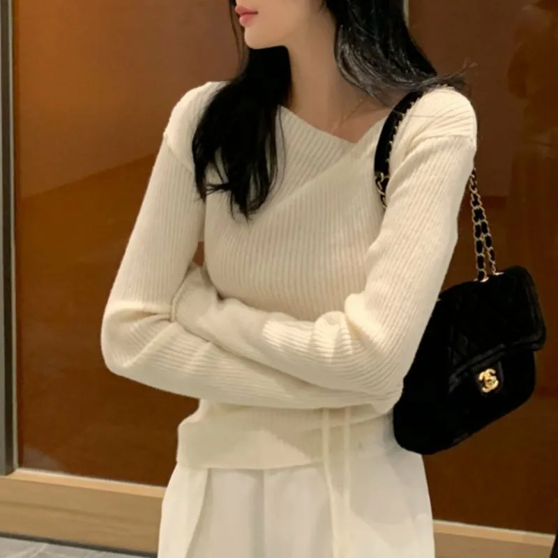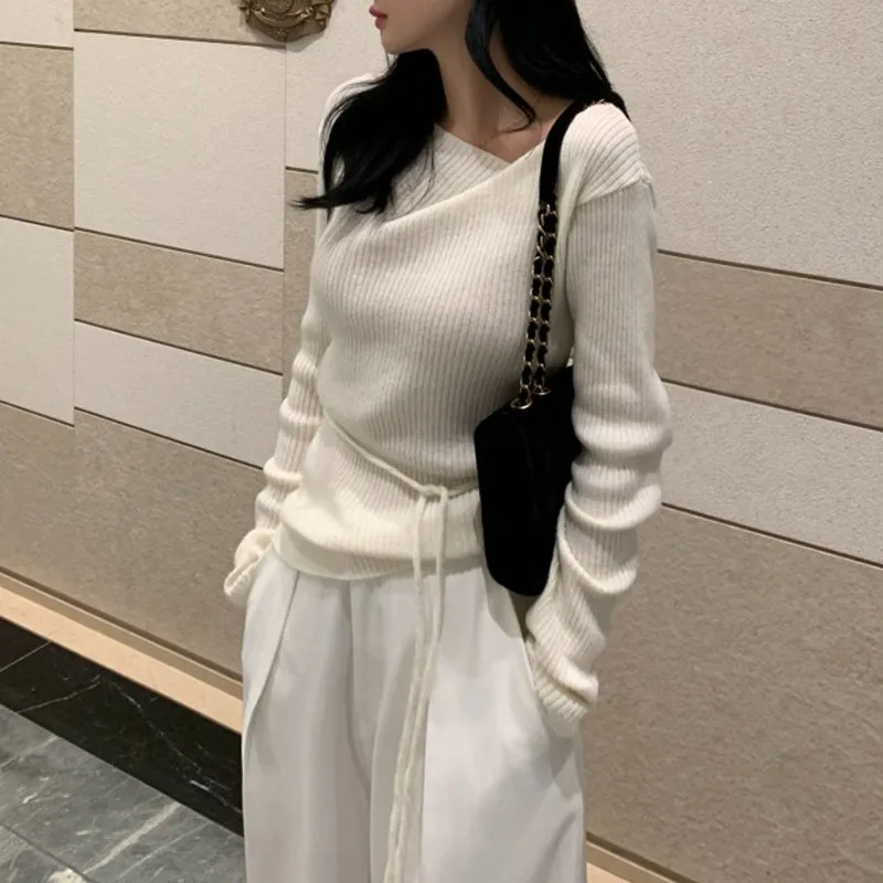 Вязаный свитер с асимметричным вырезом горловины, создающий женственный, непринужденный образ с умеренной долей стиля.