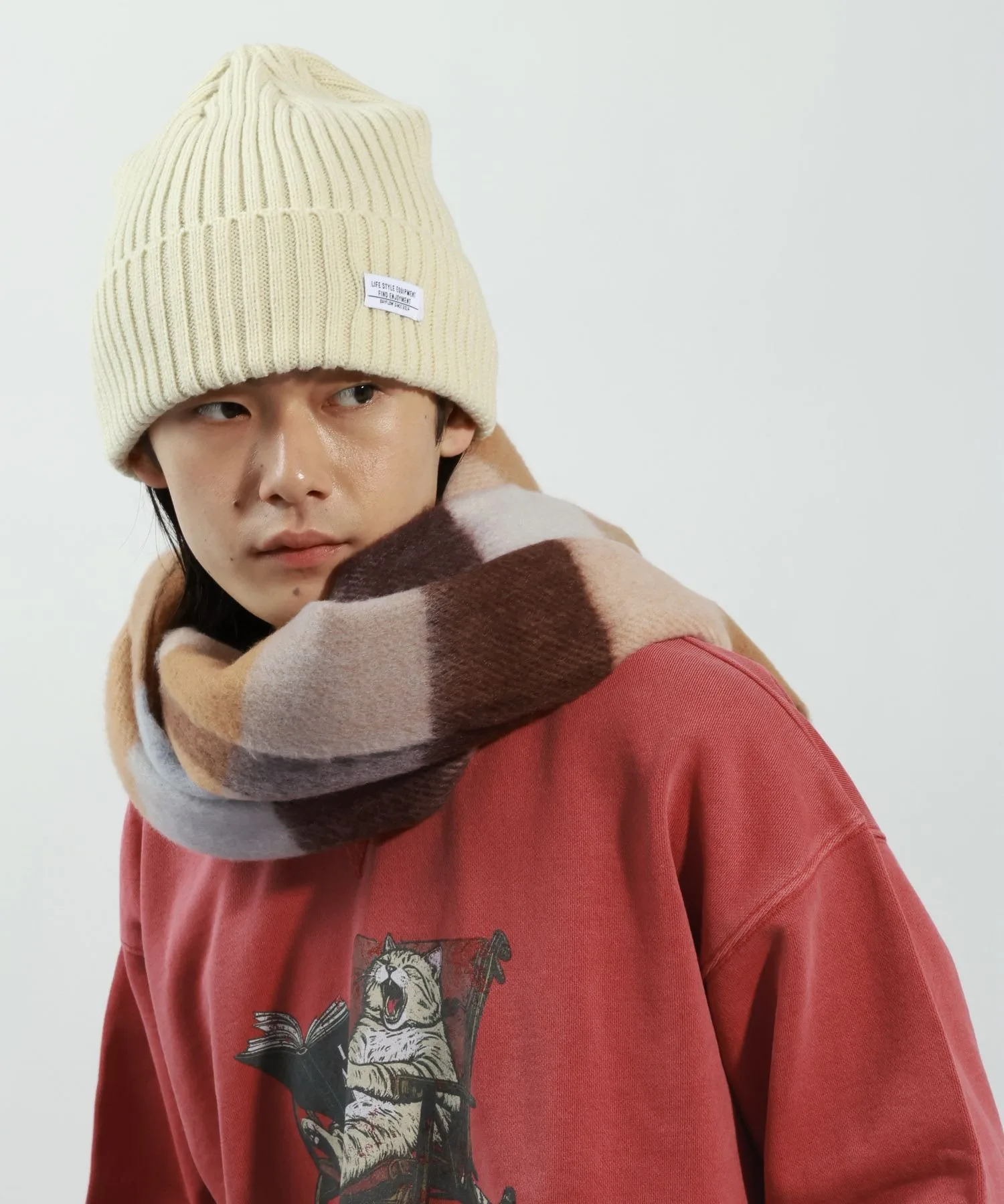 Шарф из букле, отличающийся умеренной толщиной и мягкой, пушистой тканью, приятной на ощупь.