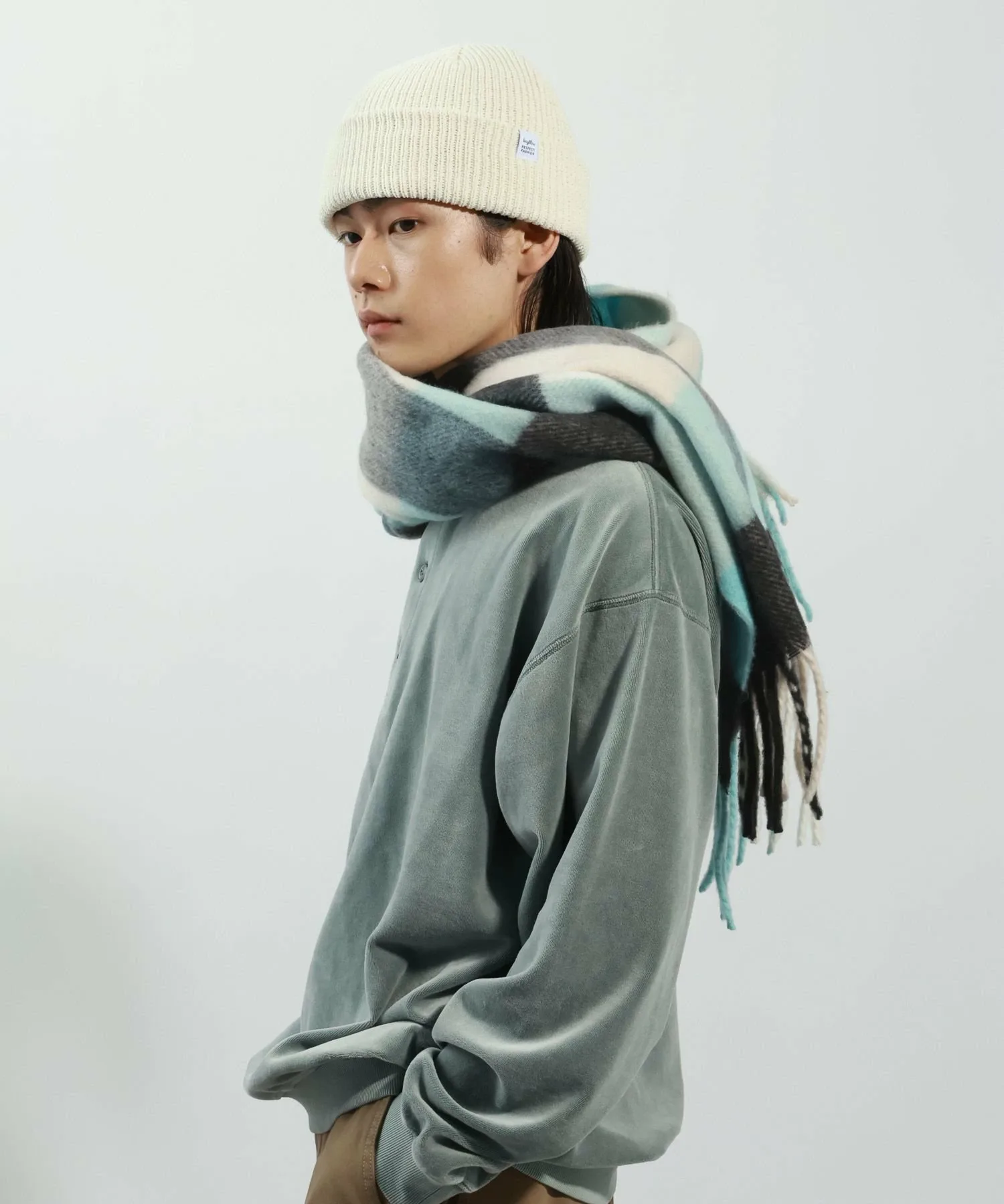 Шарф из букле, отличающийся умеренной толщиной и мягкой, пушистой тканью, приятной на ощупь.