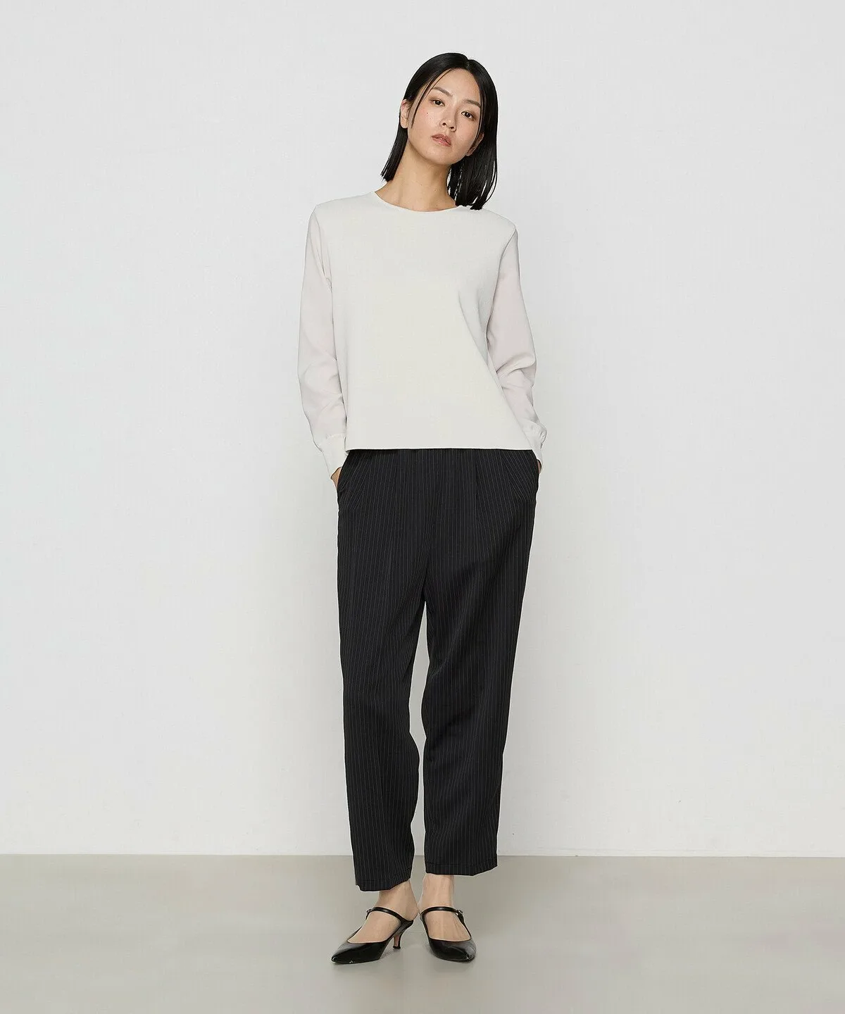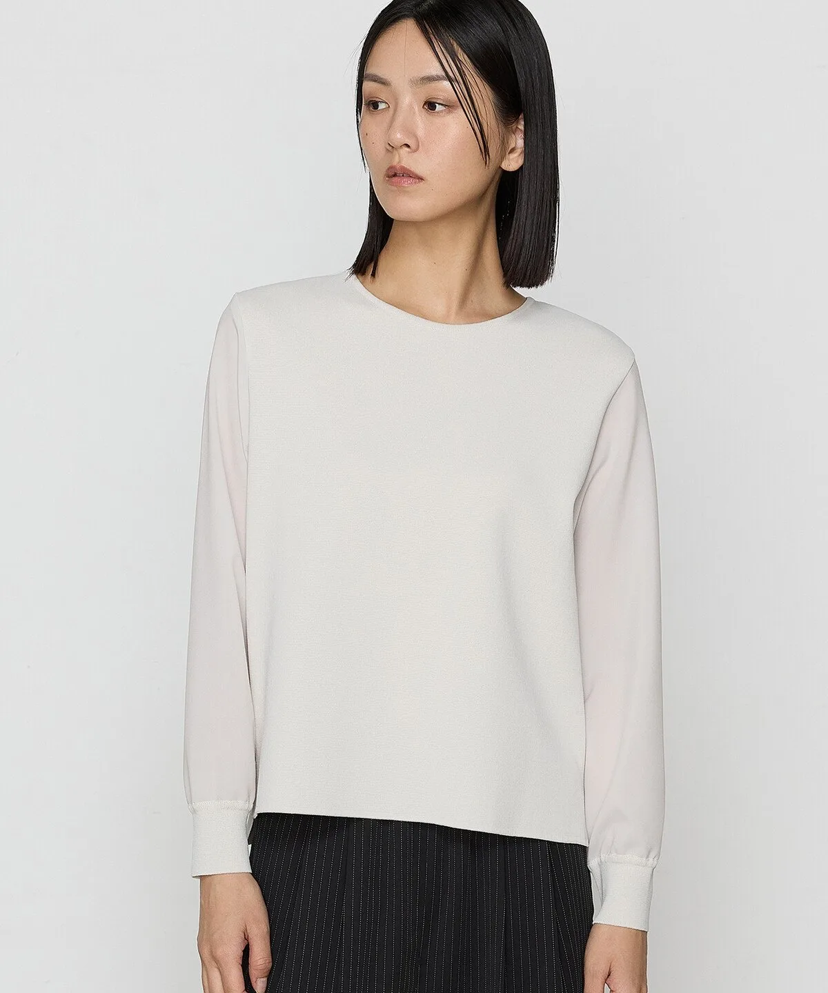 Комбинированный трикотаж из гладкой миланской ребристой вязки и тканых рукавов.