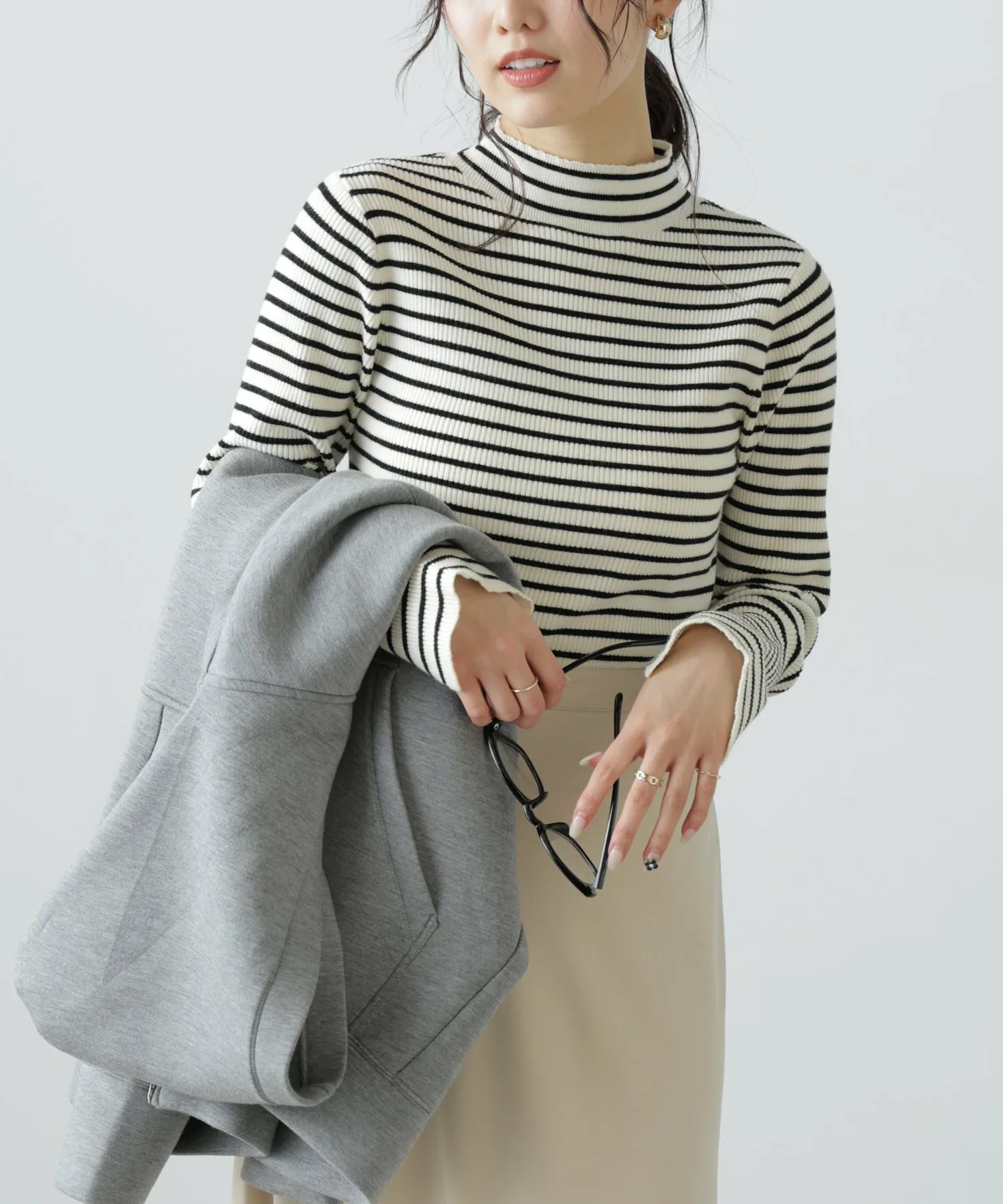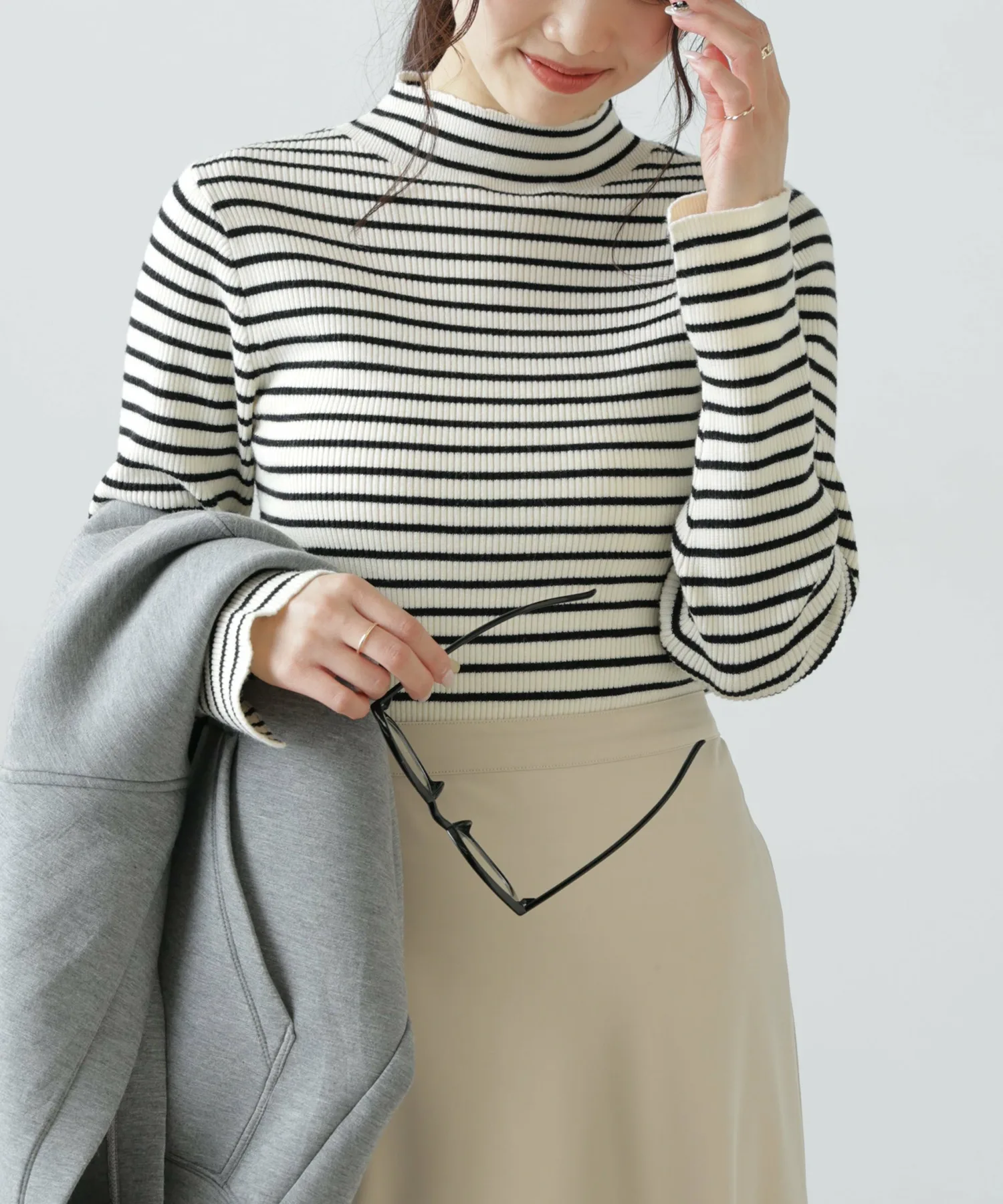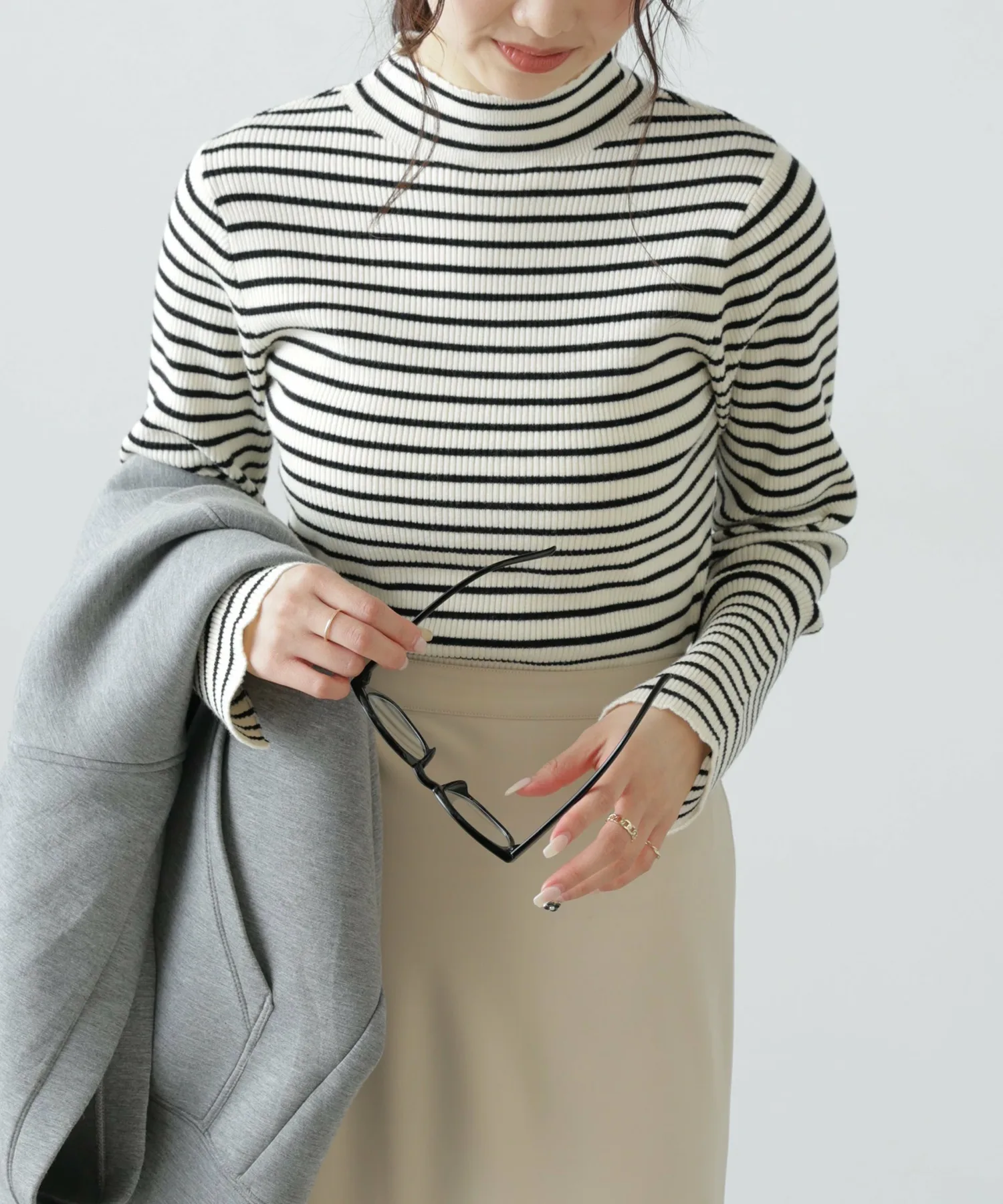 Базовая трикотажная серия, пригодная для машинной стирки. Этот свитер с высоким воротником идеально подходит в качестве нижнего слоя, благодаря простому силуэту, облегающему фигуру. Горловина выполнена из цельной ребристой вязки без швов, а манжеты имеют разрезы для дополнительного стиля. Этот свитер можно носить с платьем-майкой, а также под блузкой или жакетом. *При стирке выбирайте деликатный режим и помещайте изделие в сетку для белья.