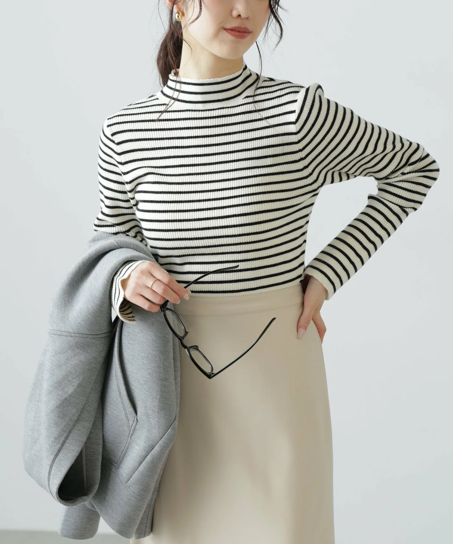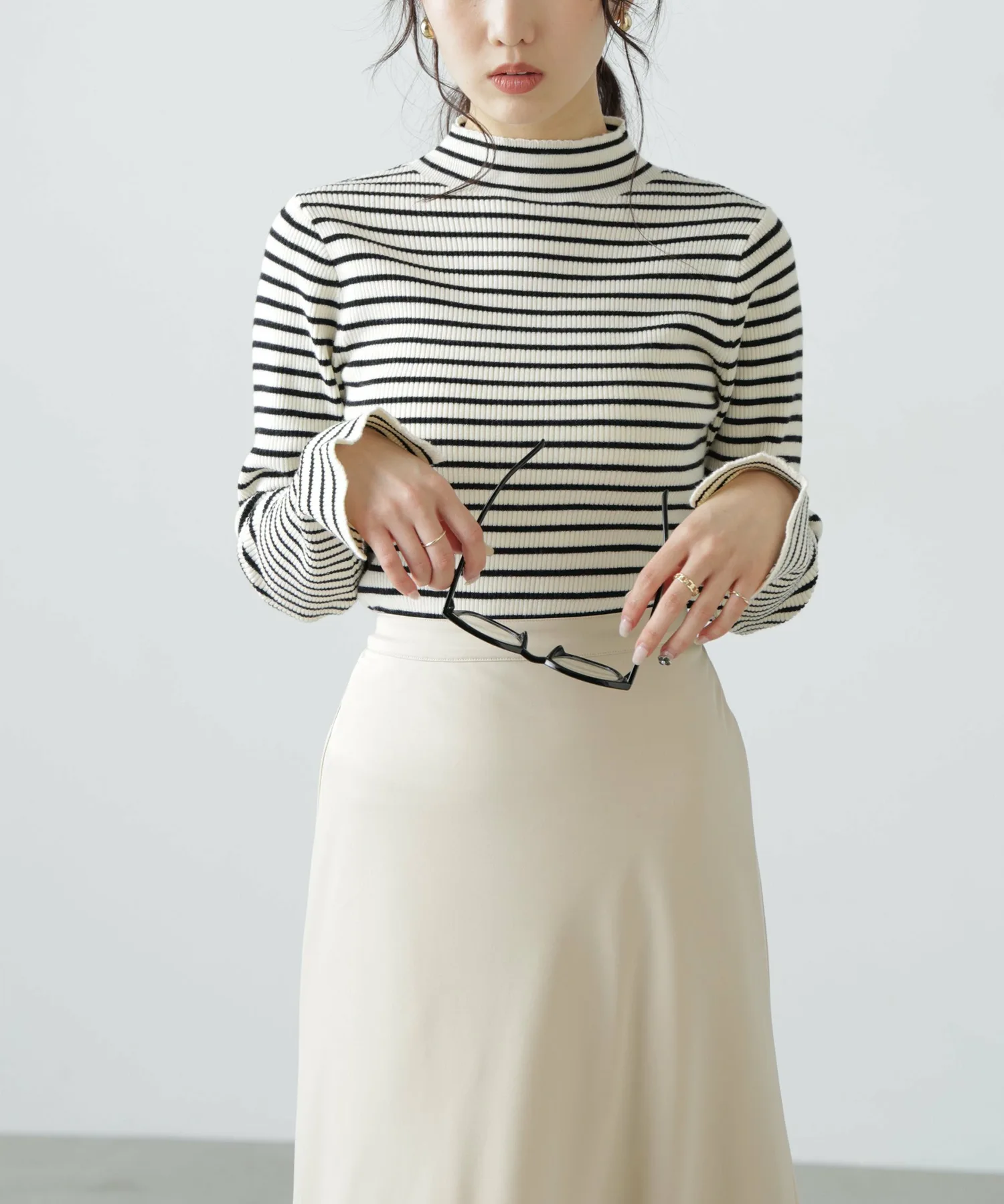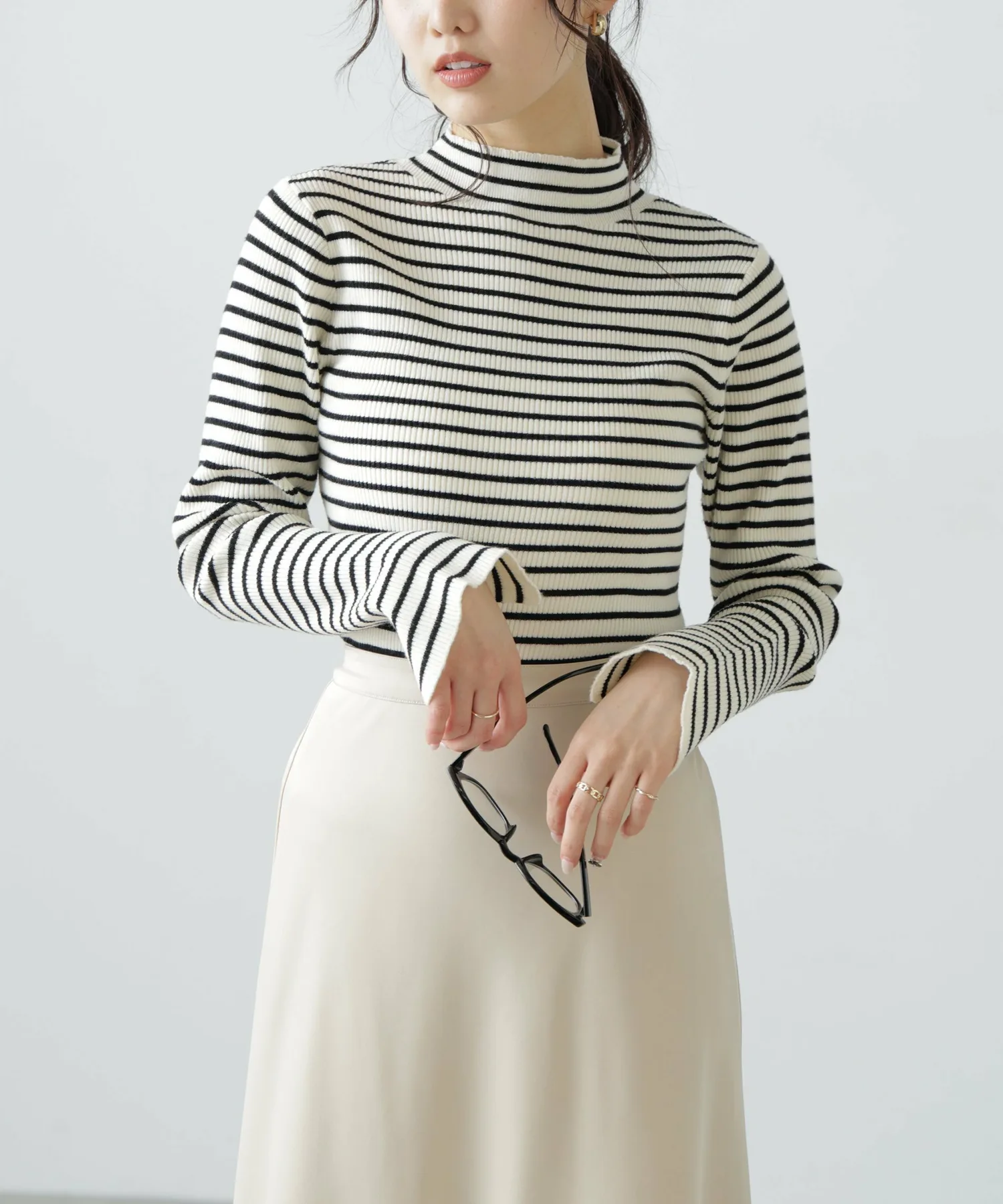 Базовая трикотажная серия, пригодная для машинной стирки. Этот свитер с высоким воротником идеально подходит в качестве нижнего слоя, благодаря простому силуэту, облегающему фигуру. Горловина выполнена из цельной ребристой вязки без швов, а манжеты имеют разрезы для дополнительного стиля. Этот свитер можно носить с платьем-майкой, а также под блузкой или жакетом. *При стирке выбирайте деликатный режим и помещайте изделие в сетку для белья.