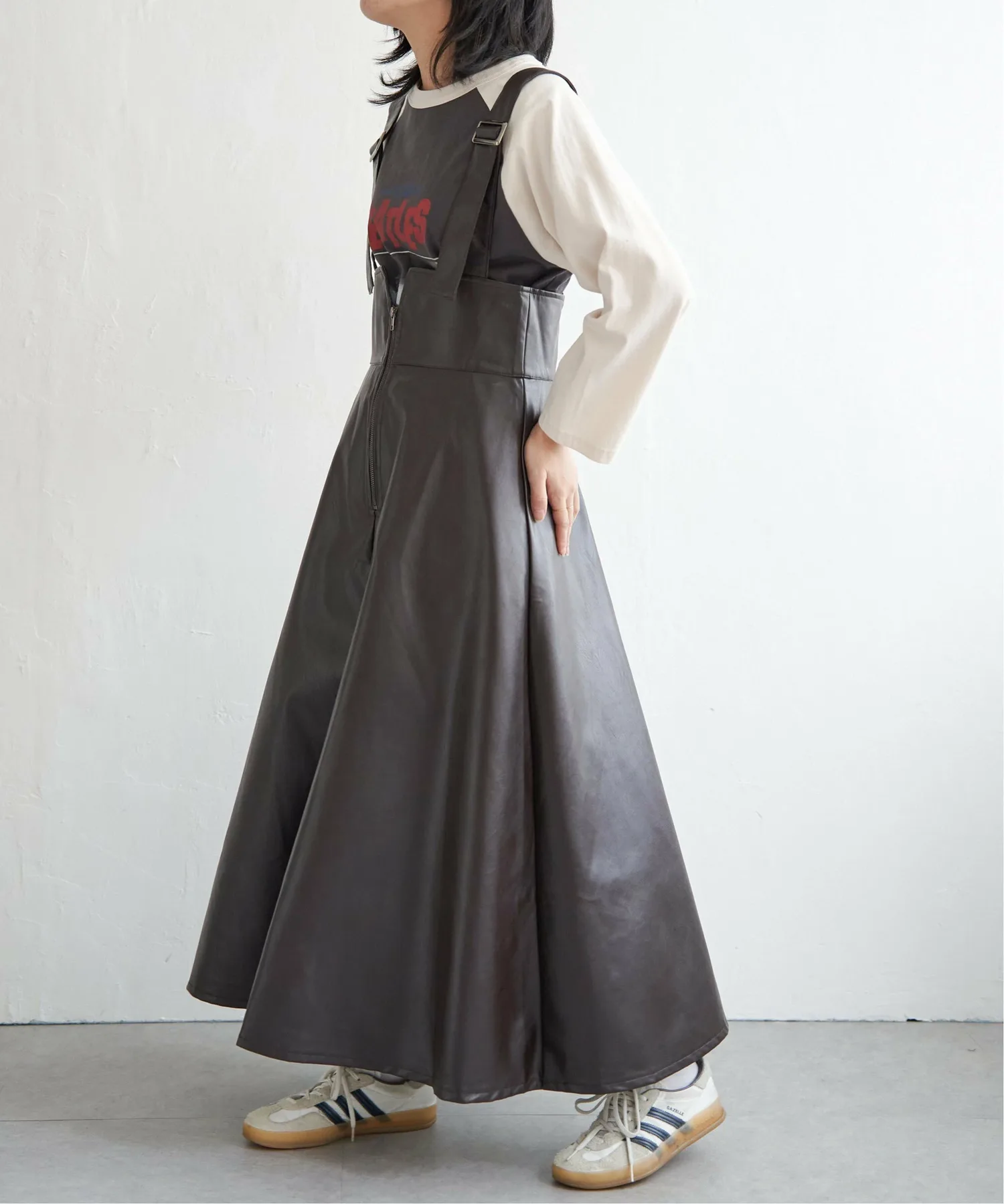 Простая, но эффектная юбка-свитер из искусственной кожи.