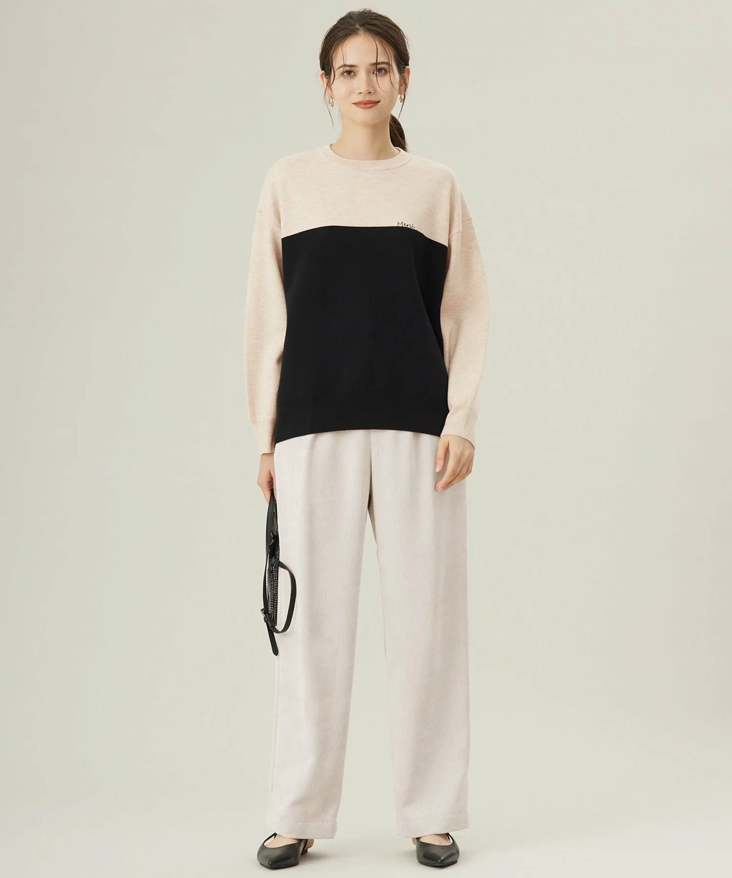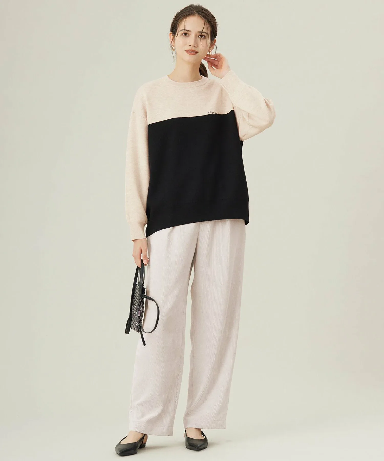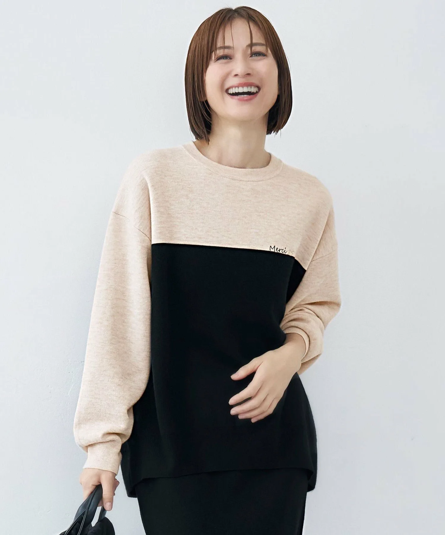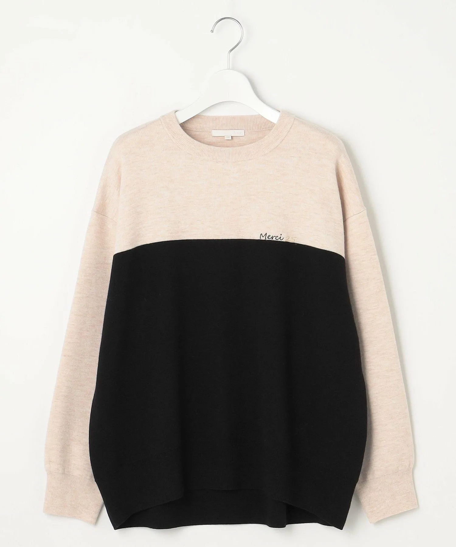 Это трикотажное изделие отличается блокировкой и изящной вышивкой. Дизайн: Этот трикотаж имеет свободный силуэт. Несмотря на то, что он похож на толстовку, трикотажный материал придает ему мягкость и элегантность. Он отличается привлекательной блокировкой и вышивкой на груди в честь 25-летия бренда. Цвет под блокировкой сочетается с юбкой (SKWMGS0151), изготовленной из того же материала, создавая эффект платья при ношении в комплекте. Материал: Полукамвольная пряжа, представляющая собой нечто среднее между камвольной и шерстяной пряжей, не слишком толстая и не слишком тонкая, умеренной толщины. Ее блеск и насыщенность цвета великолепны, а склеенная вязка создает чистый и элегантный вид. Юбка (SKWMGS0151), изготовленная из того же материала: