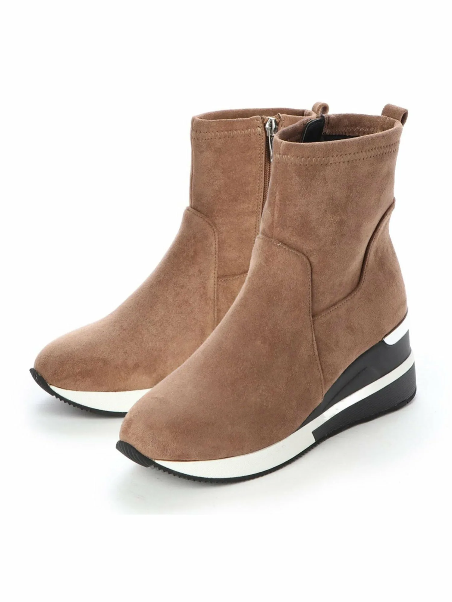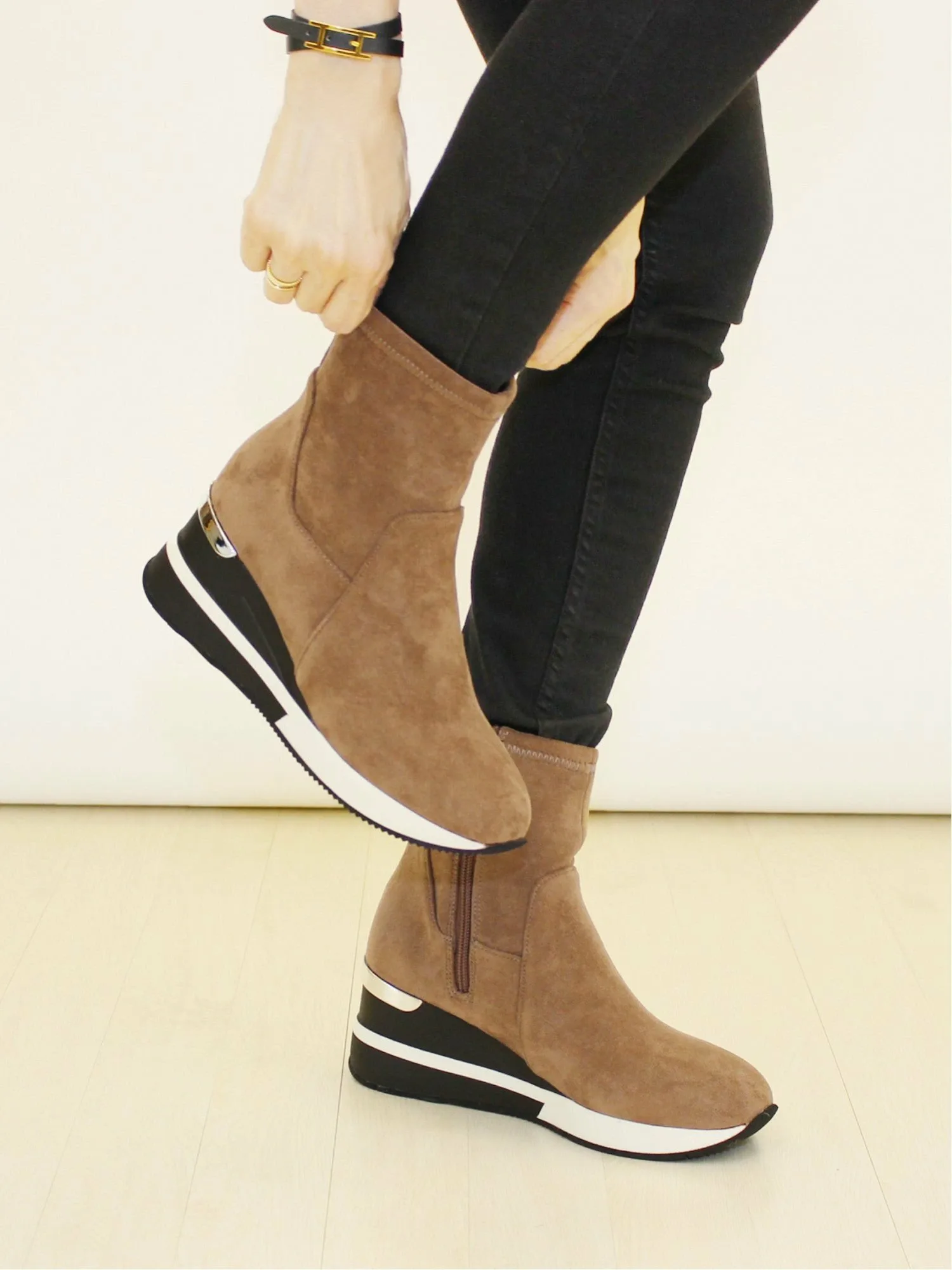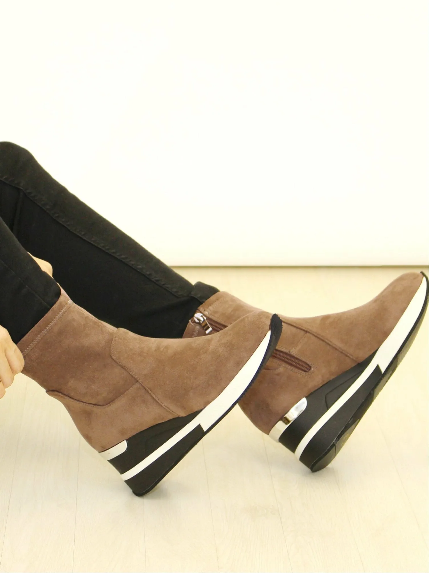 Комментарии: У меня широкие, с высоким сводом стопы, и обычно я ношу размер M, но при ходьбе босиком размер M ощущается идеально. Они совсем не тесные, даже с носками или колготками. Молния позволяет легко надевать и снимать их, а эластичный материал из искусственной замши мягкий на ощупь, что делает их очень удобными. Подошва толщиной 7,3 см очень легкая, поэтому в них легко ходить, и они не утомляют даже при длительных прогулках.