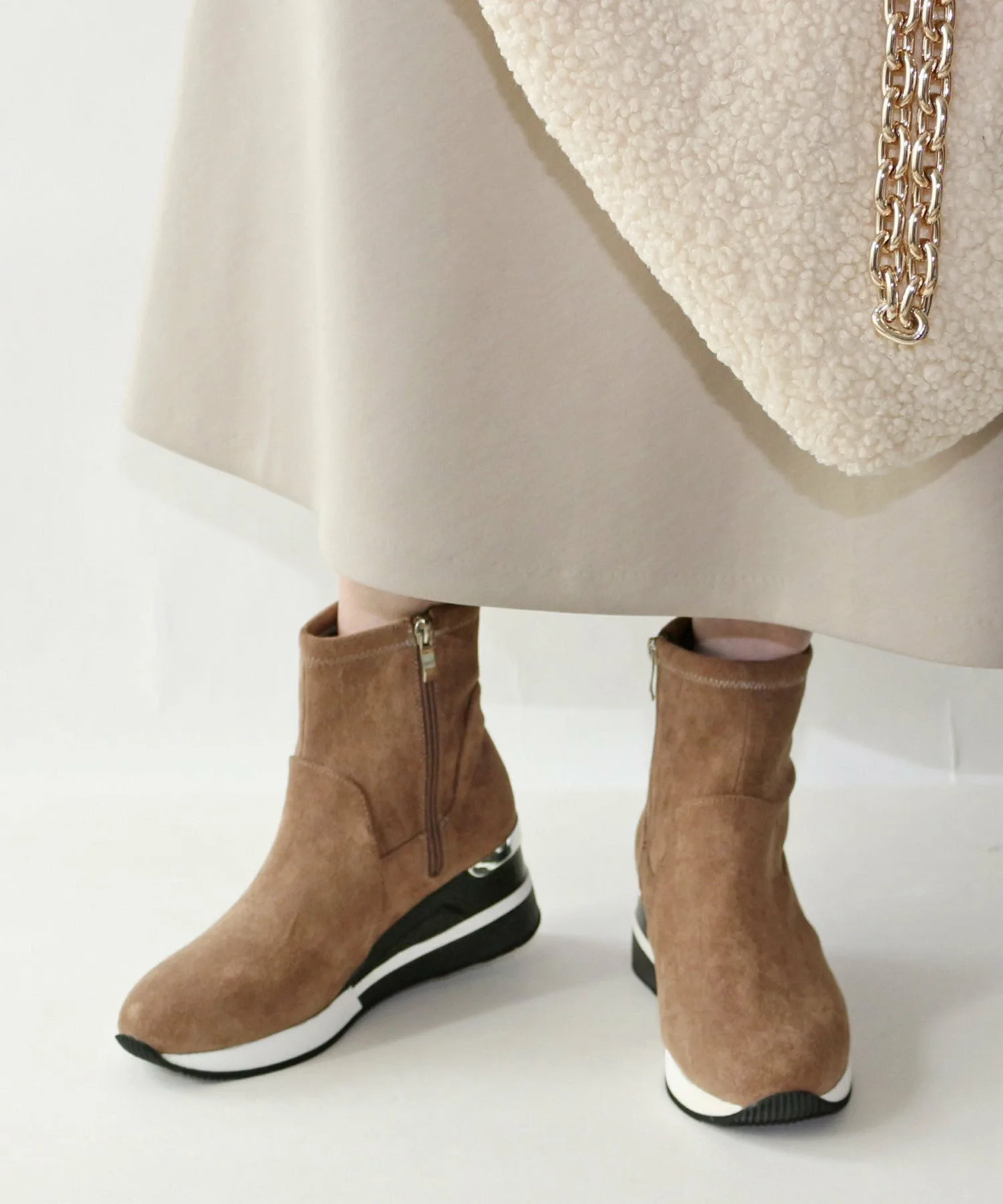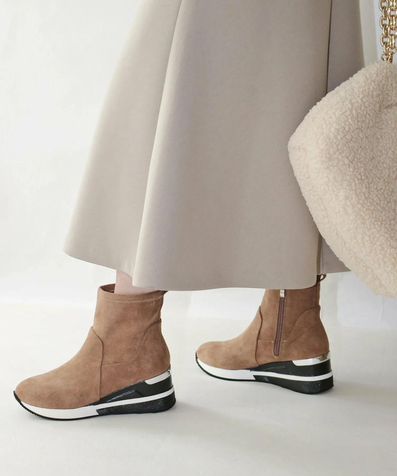 Кроссовки-ботинки Fin с эластичной подошвой и гладкой замшевой текстурой идеально подходят для этого сезона. Изящный силуэт и объемная толстая подошва создают женственный, повседневный образ. Подошва толщиной 7,3 см удобна и подчеркнет ваш стиль.