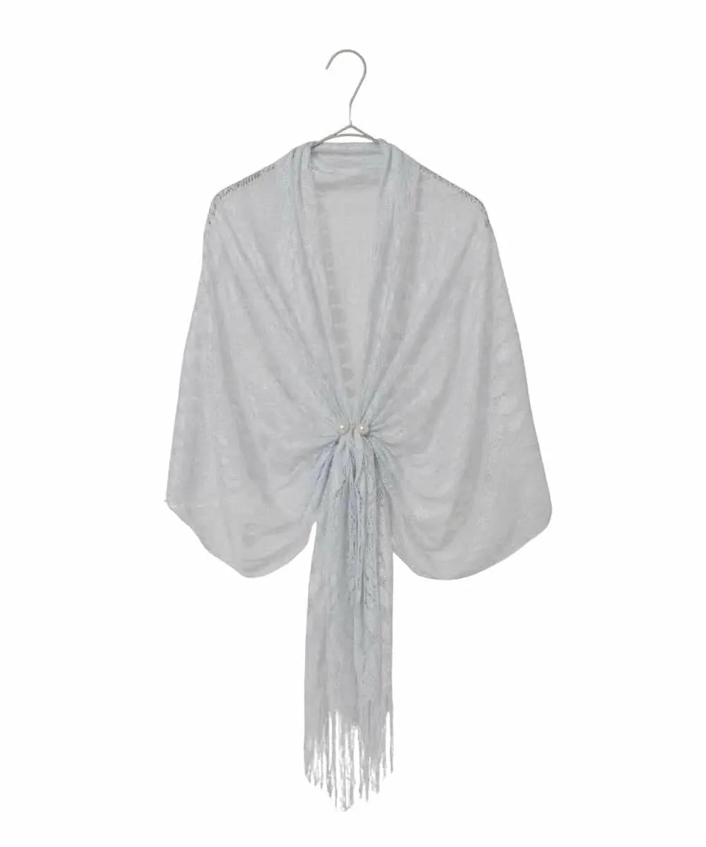 Шаль с нежным кружевным узором, которая элегантно переливается на свету. Она плотно прилегает к телу и изящно прикрывает плечи и предплечья. Крупный жемчужный мотив спереди добавляет акцента. Это рекомендуемая вещь, которая добавит нотку гламура к простому платью или комплекту из платья и платья.