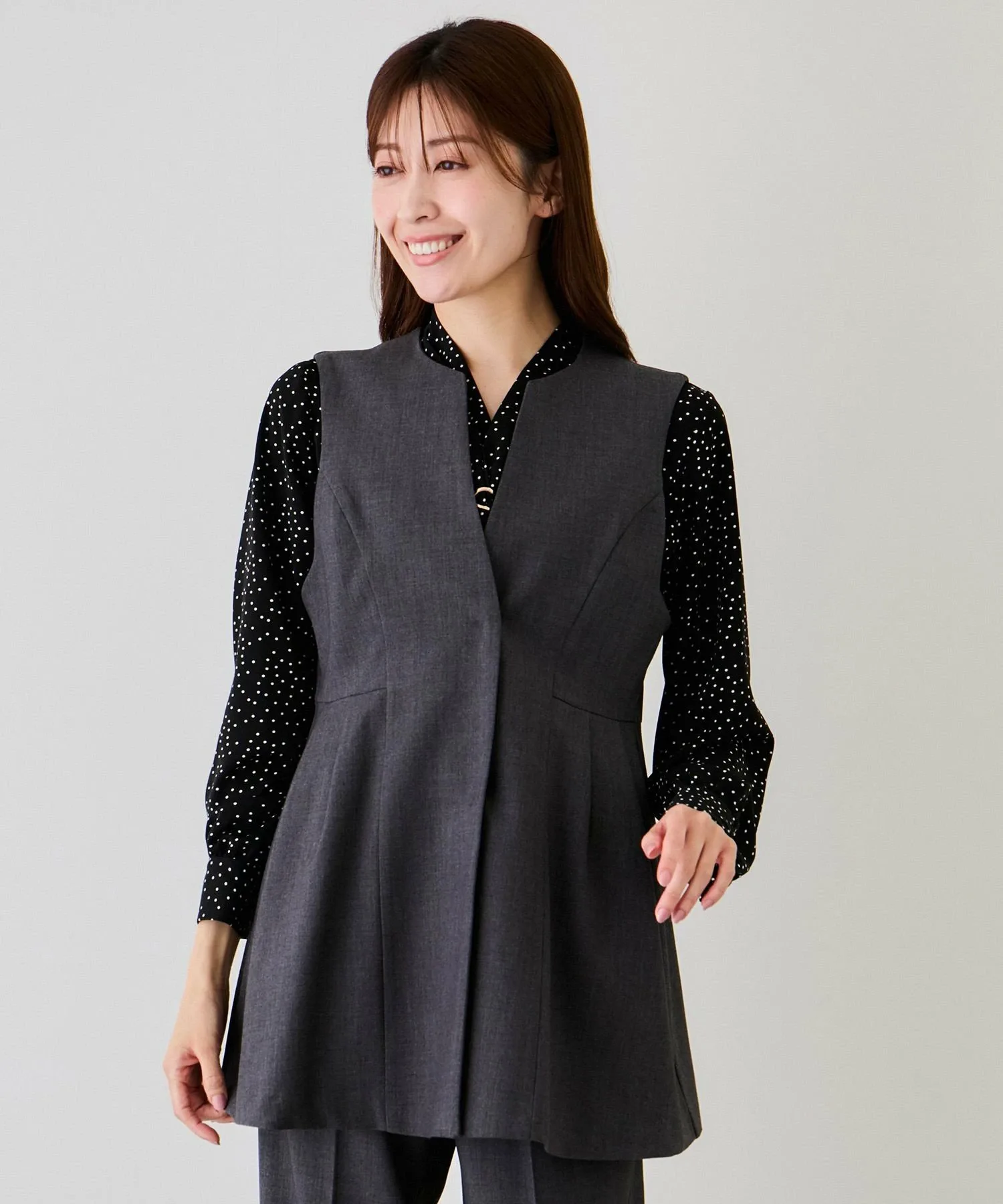 Красивый, универсальный жилет с баской, который можно носить поверх повседневной одежды, просто накинув его. [Дизайн/Силуэт]