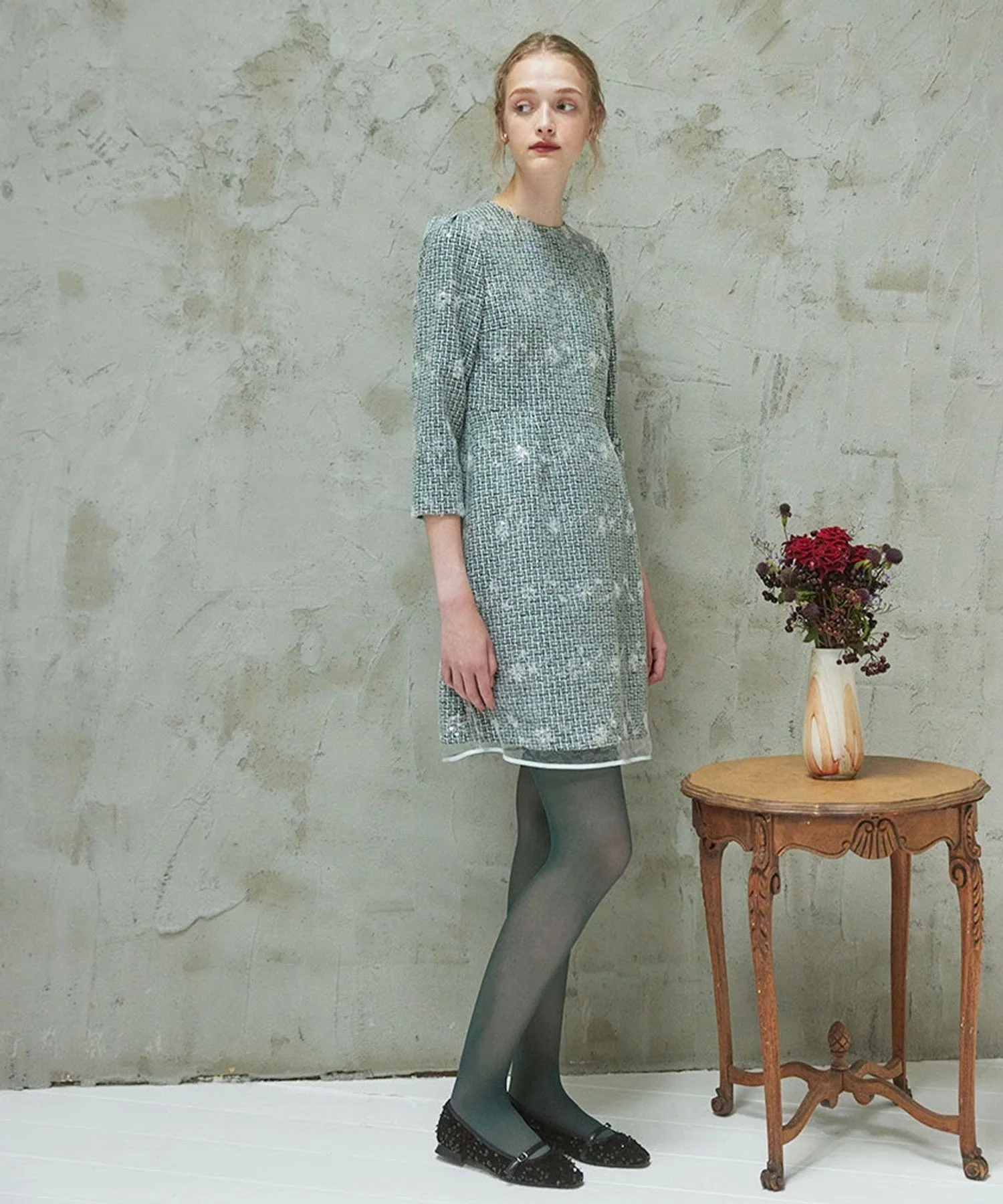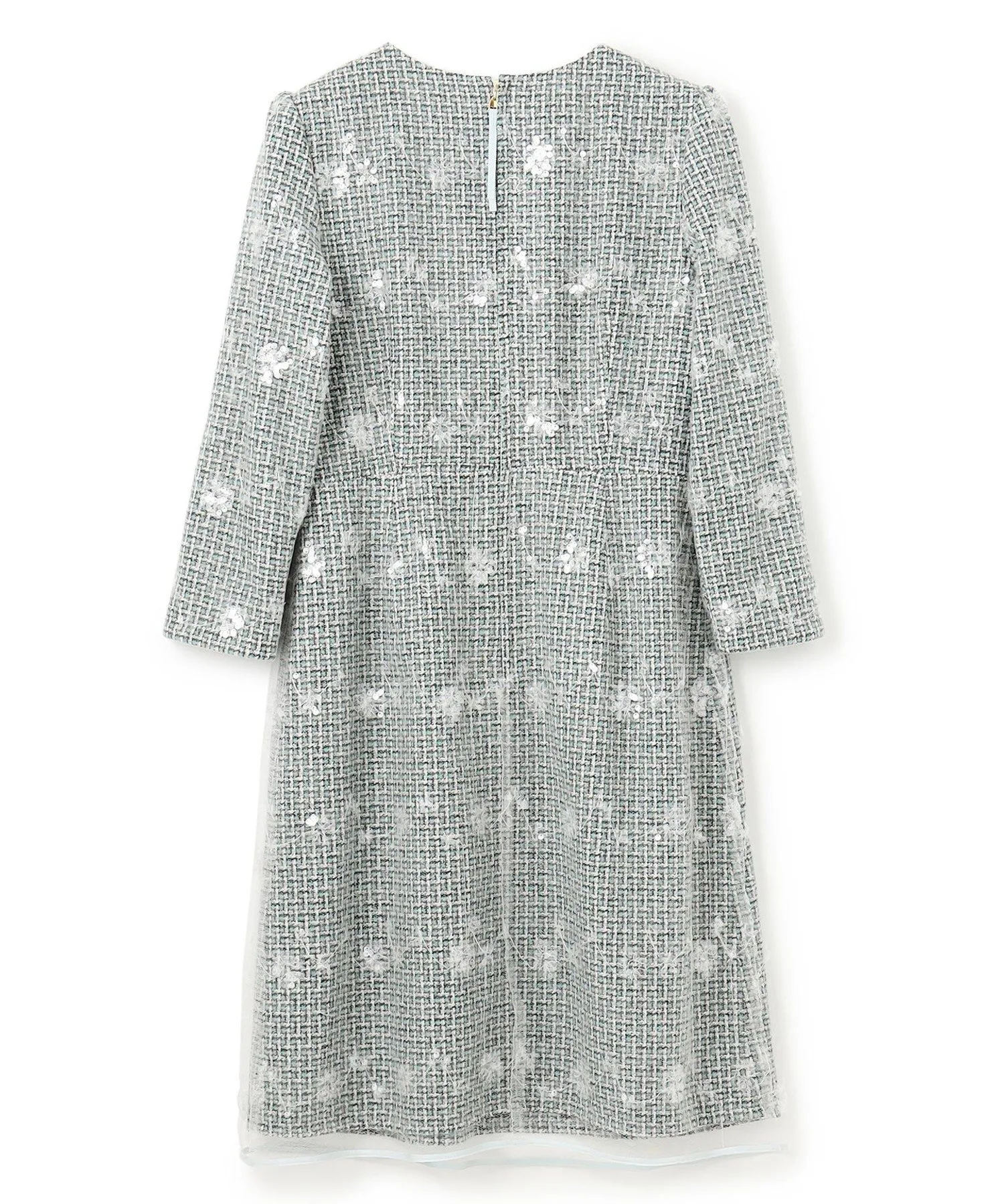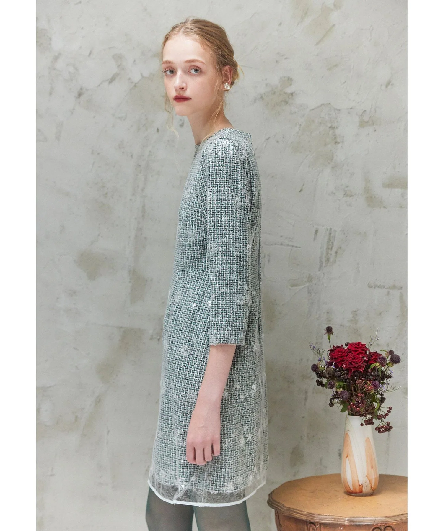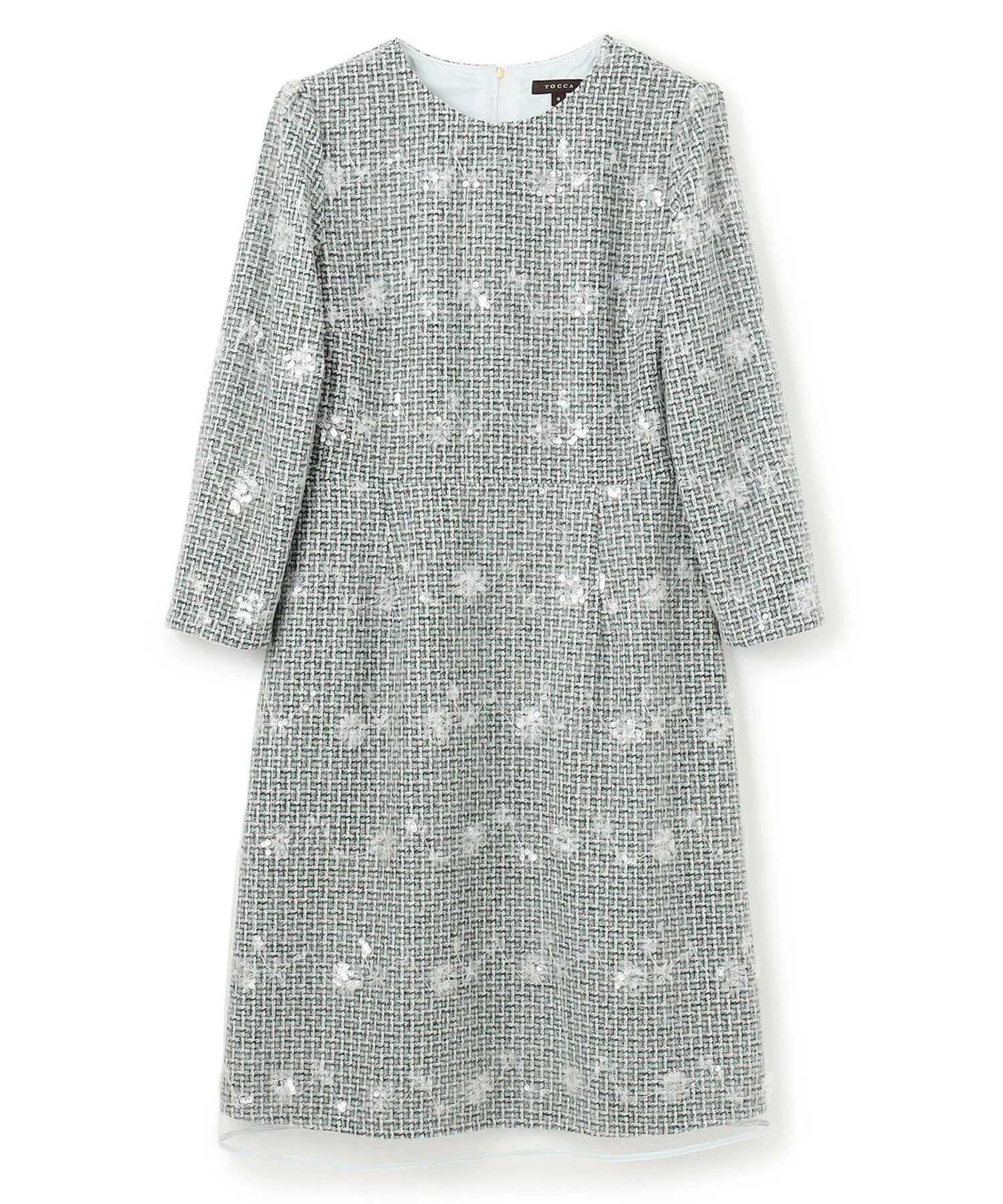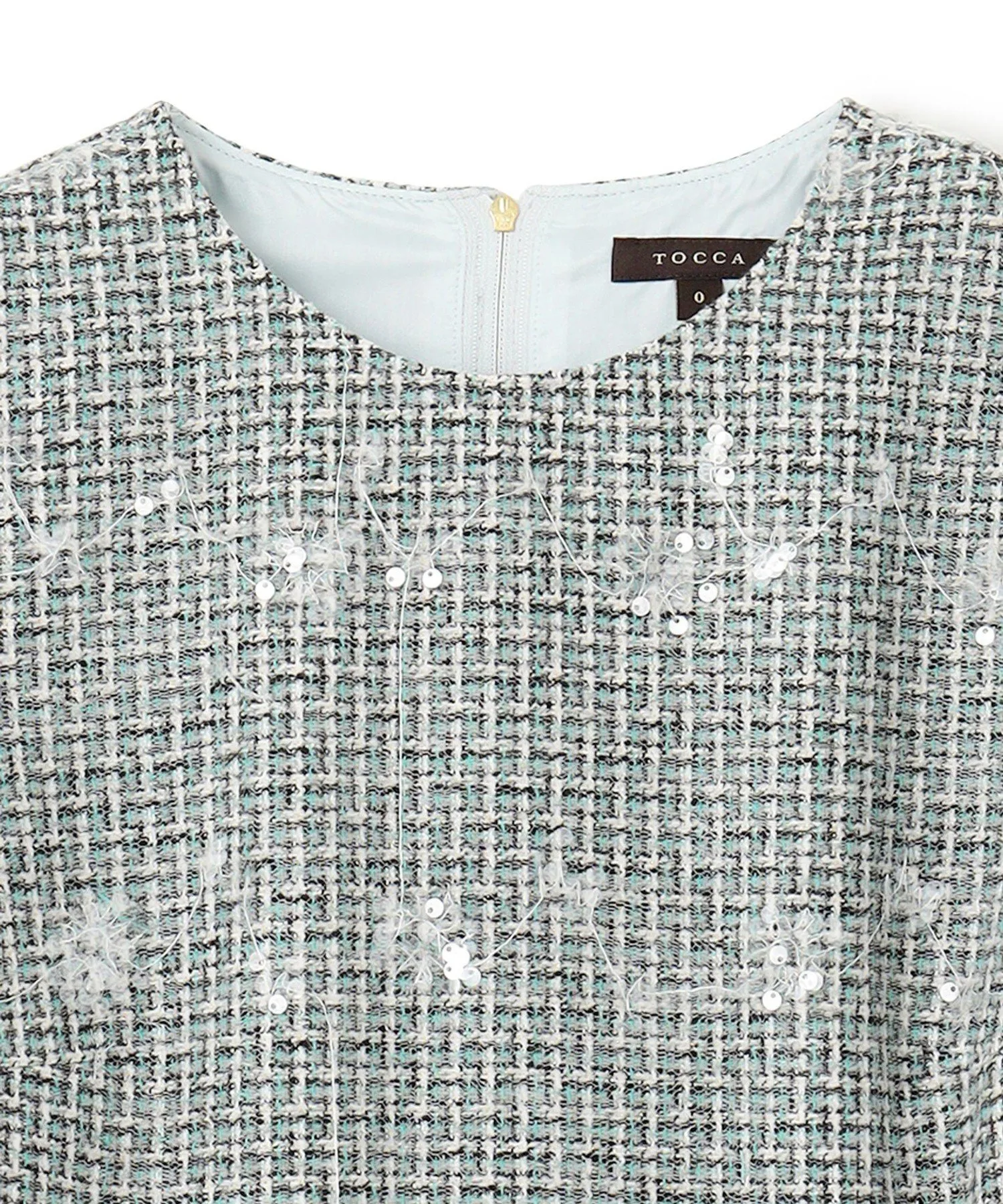 Сочетая твидовую ткань с кружевом и вышивкой пайетками, мы создали уникальное платье TOCCA, которое сочетает в себе модные тенденции и элегантность.