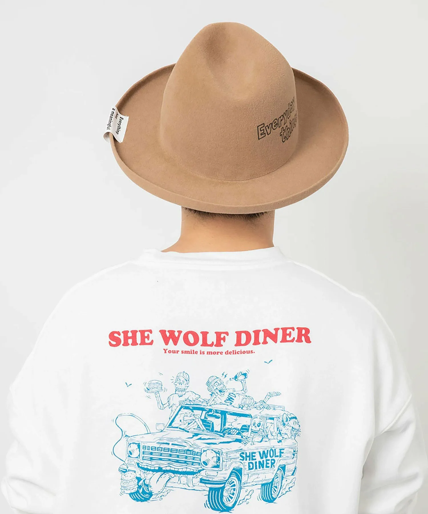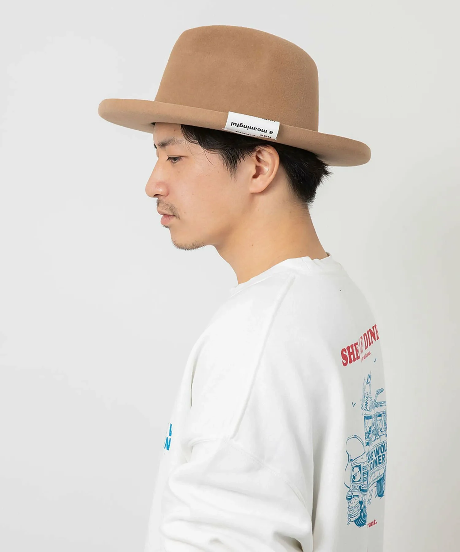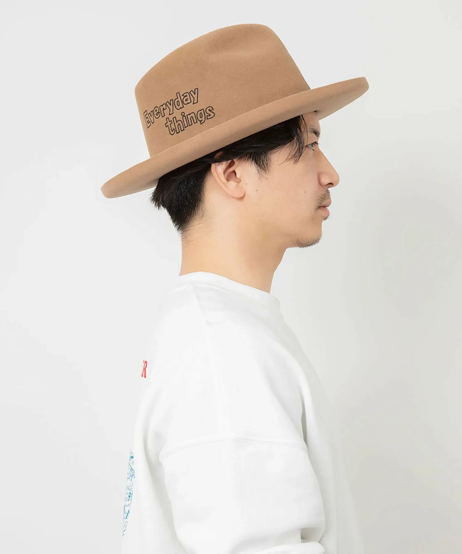 Высокая тулья и эффектные изогнутые поля создают уникальный силуэт в стиле хомбург. Поля намеренно оставлены без окантовки, что придает ей элегантный вид. Тема сезона, «Повседневные вещи», выполнена в стиле граффити и напечатана сбоку. Текстура кроличьего меха придает ей солидный вид, добавляя элегантности любому наряду.