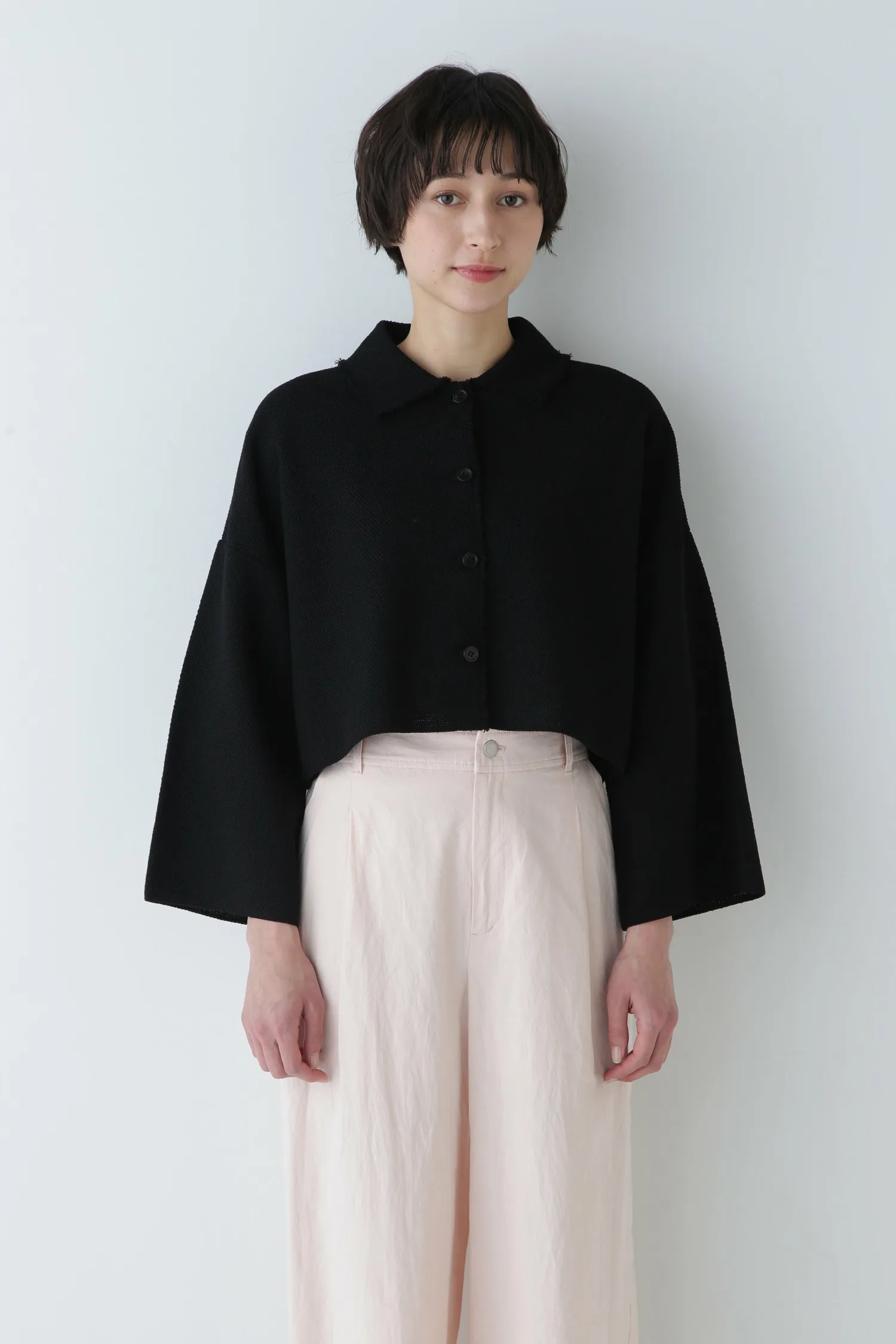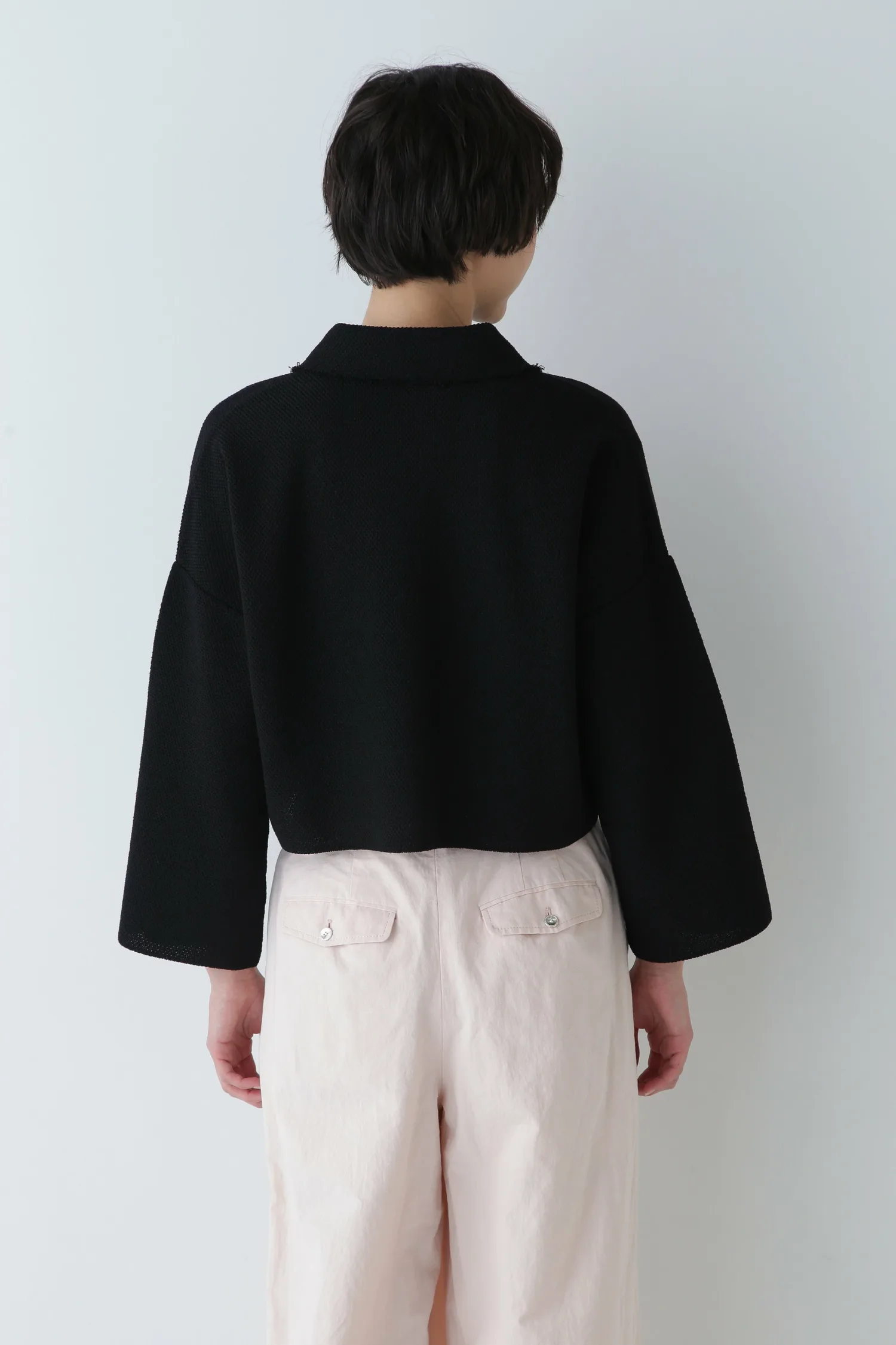 Этот вязаный жакет в стиле твид имеет короткую длину и объемные рукава для создания нового баланса. Бахрома с необработанными краями от передней части до воротника создает легкий и утонченный образ.