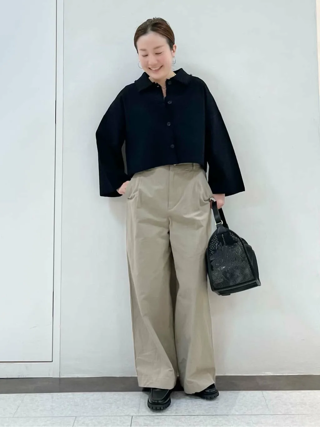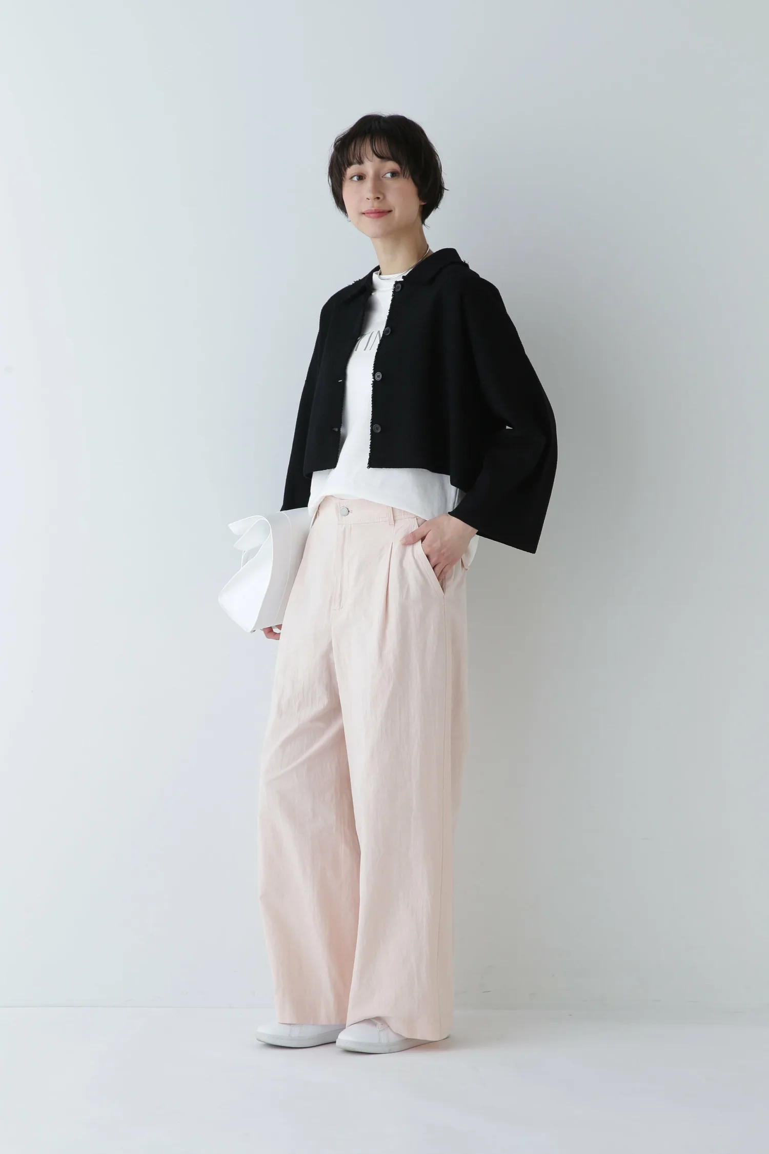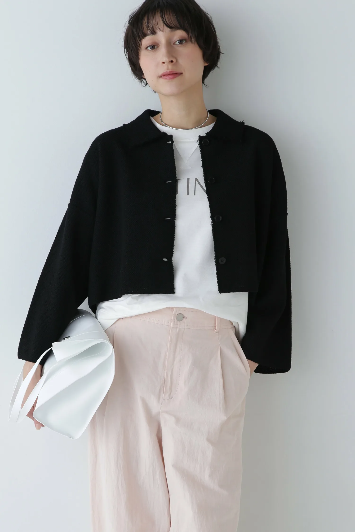 Его можно носить как самостоятельно, так и поверх футболки с логотипом для создания повседневного образа. Короткая длина также создает сбалансированный образ при ношении поверх платья.