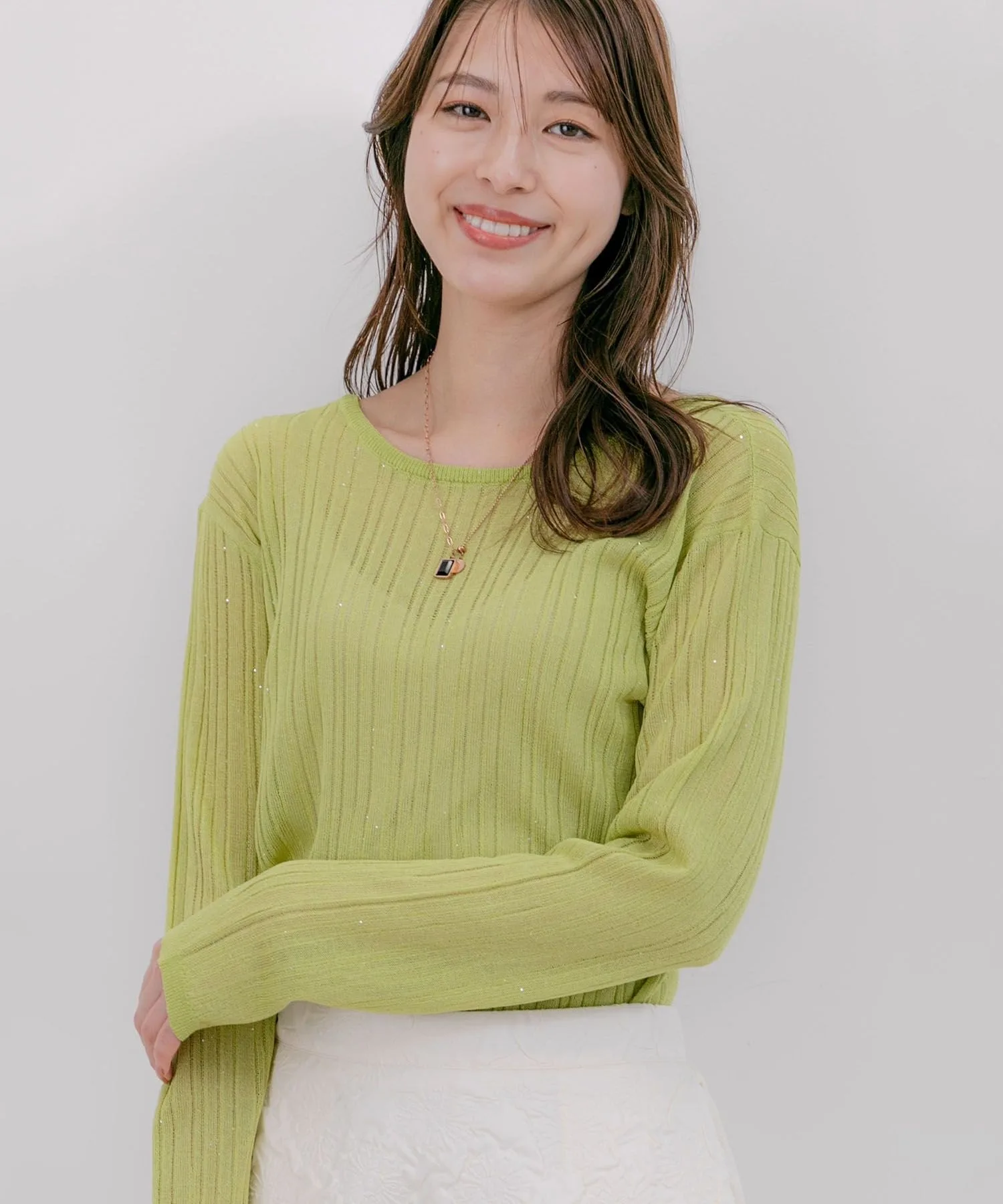 Этот прозрачный трикотажный пуловер непринужденно демонстрирует немного кожи, создавая стильный образ.