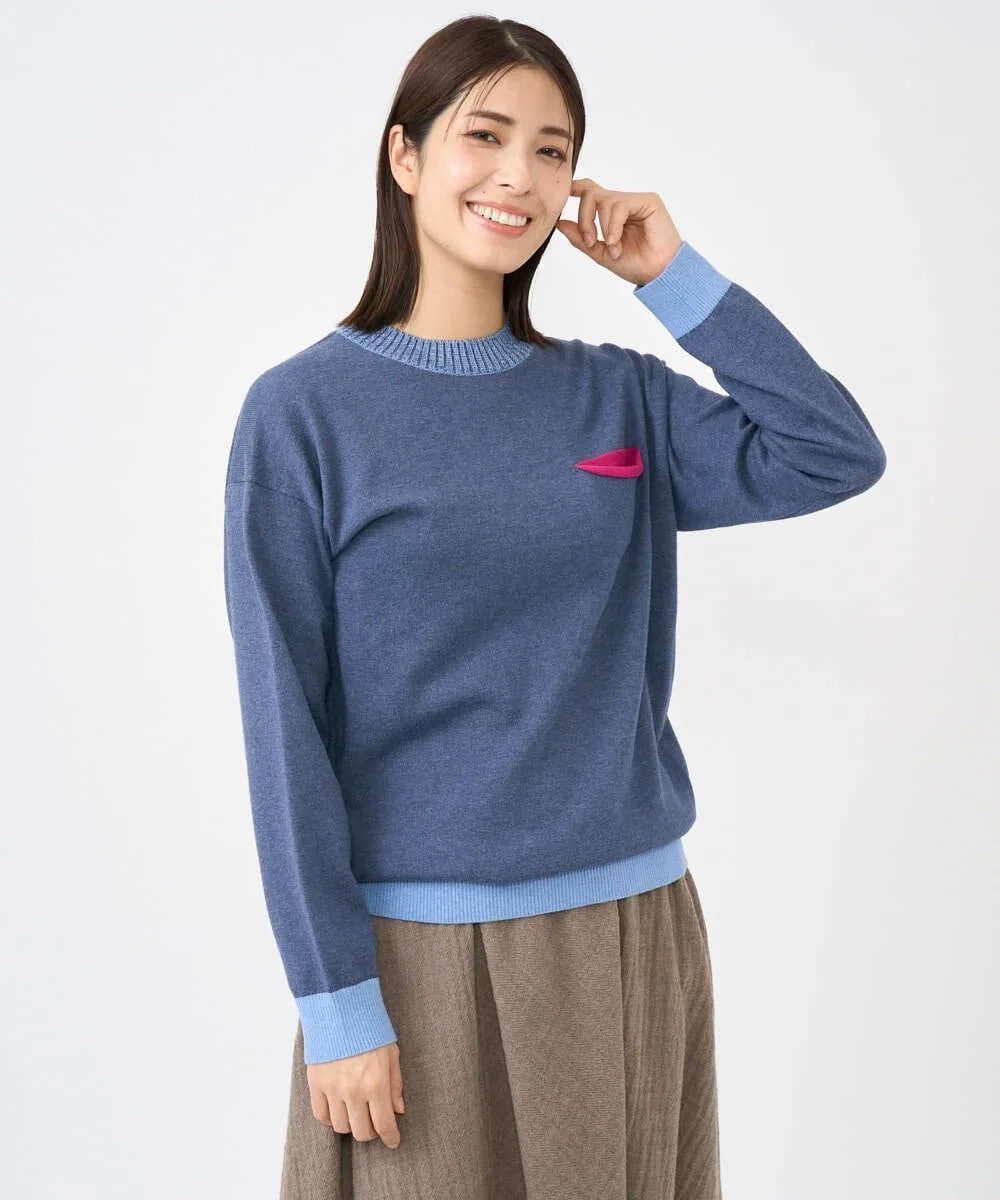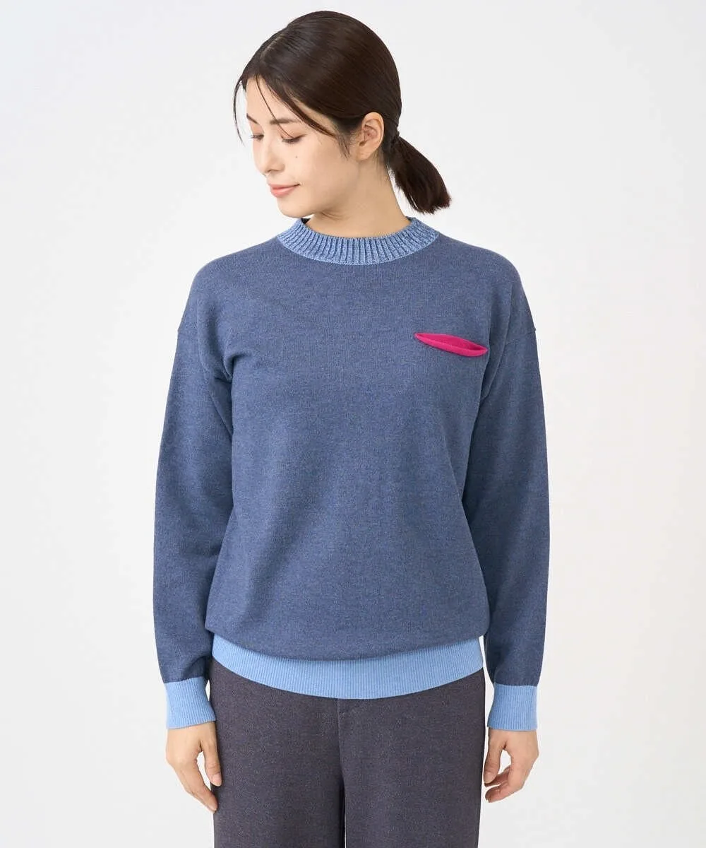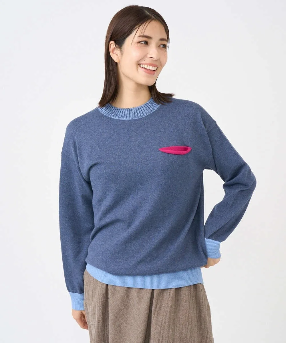 Этот дизайнерский трикотаж отличается свободным силуэтом. Основная часть выполнена из простого трикотажа, а воротник, низ и манжеты — из ребристого материала с акцентом контрастного цвета. Передняя часть изделия добавляет игривую деталь — виднеющийся карман в той же цветовой гамме. Задний воротник выполнен из тонкого трикотажа пике для стильного акцента.