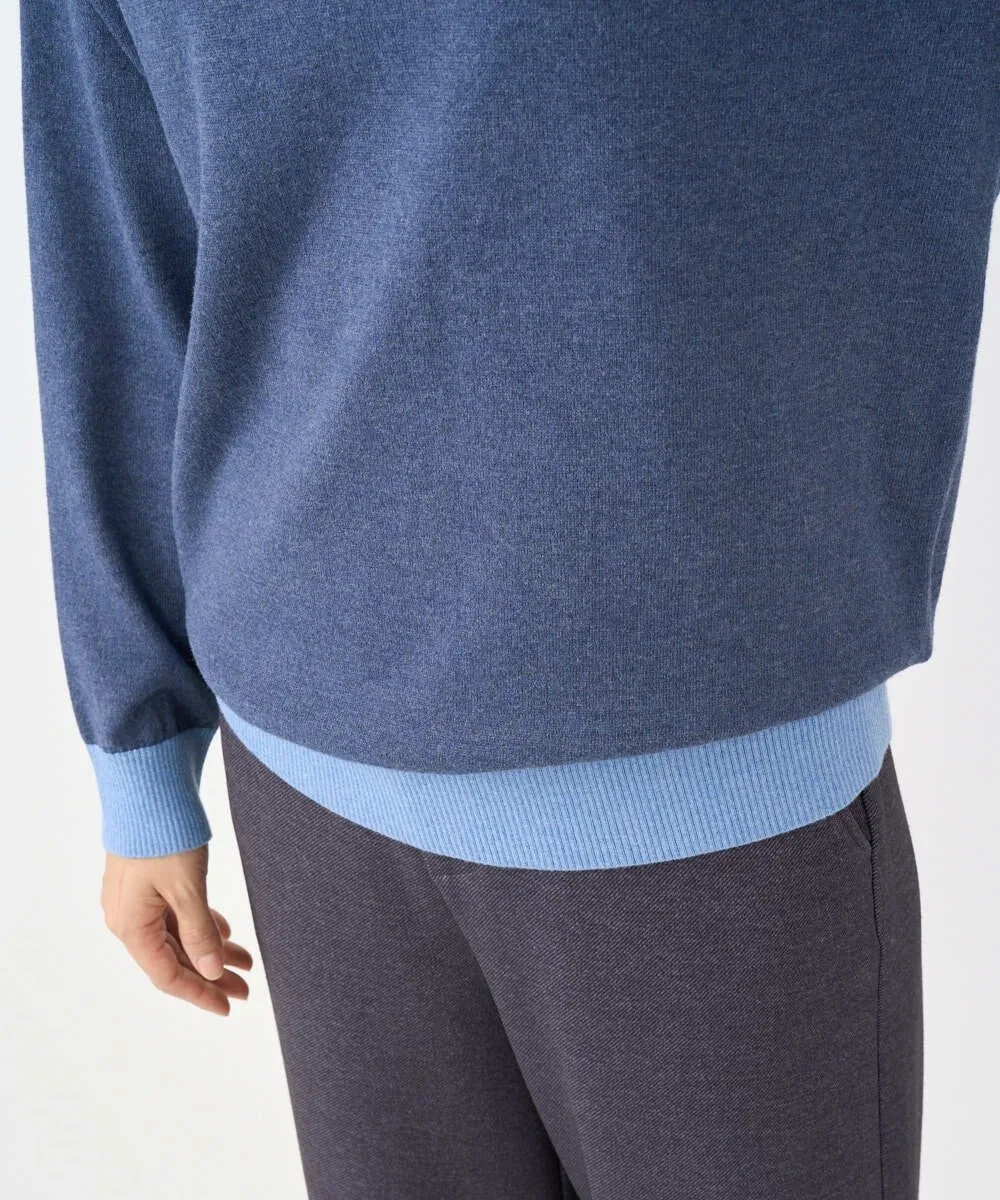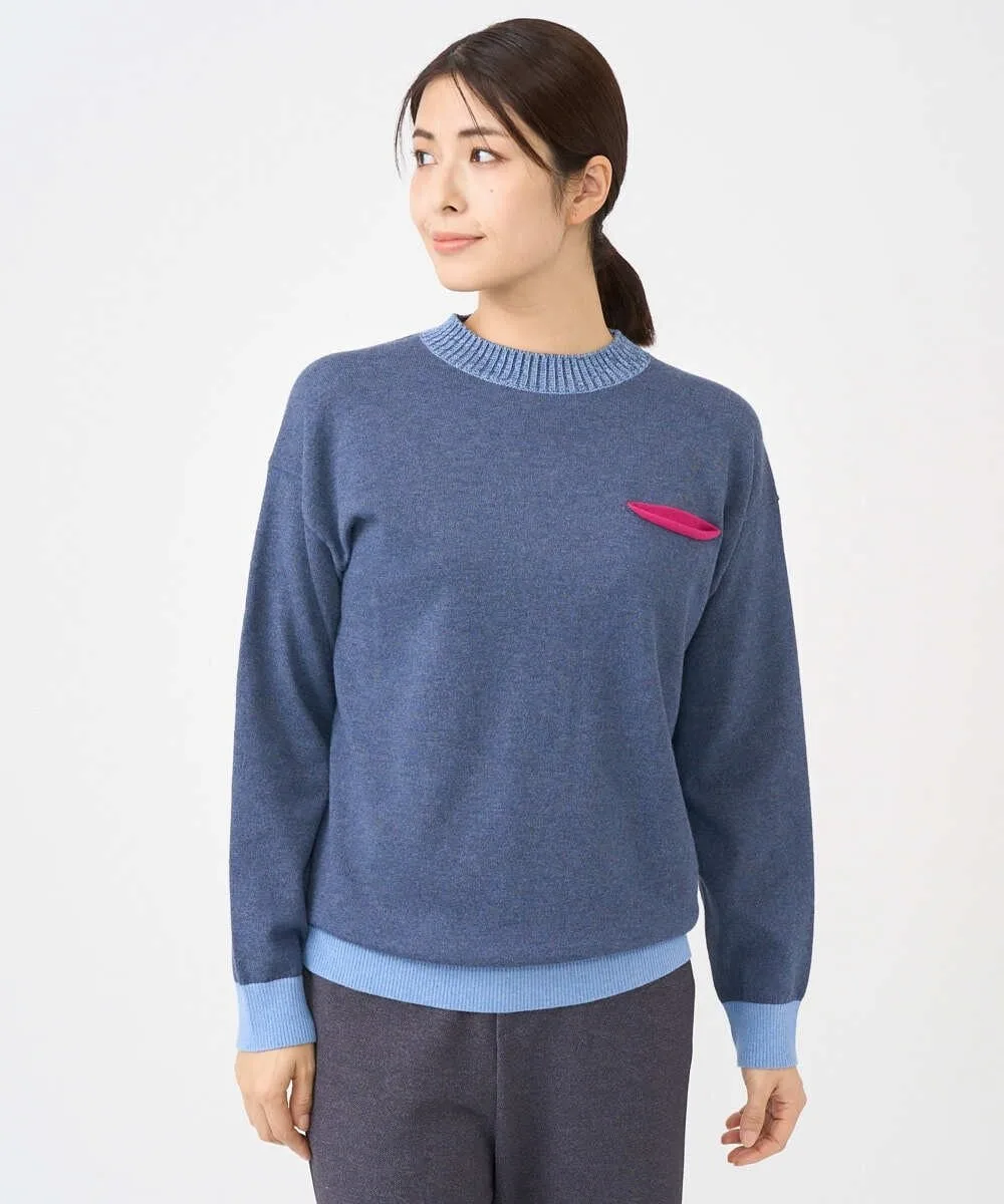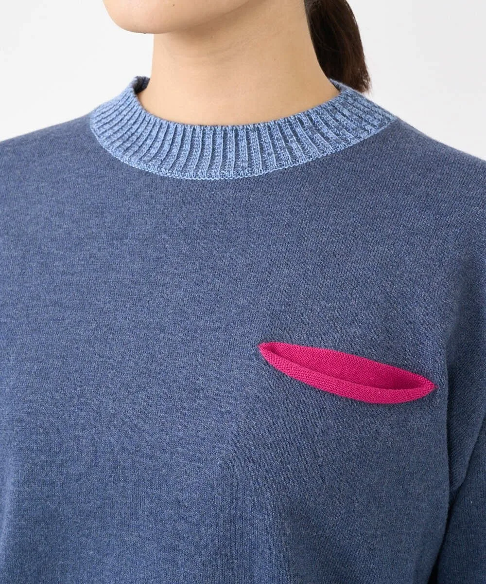 Этот дизайнерский трикотаж отличается свободным силуэтом. Основная часть выполнена из простого трикотажа, а воротник, низ и манжеты — из ребристого материала с акцентом контрастного цвета. Передняя часть изделия добавляет игривую деталь — виднеющийся карман в той же цветовой гамме. Задний воротник выполнен из тонкого трикотажа пике для стильного акцента.