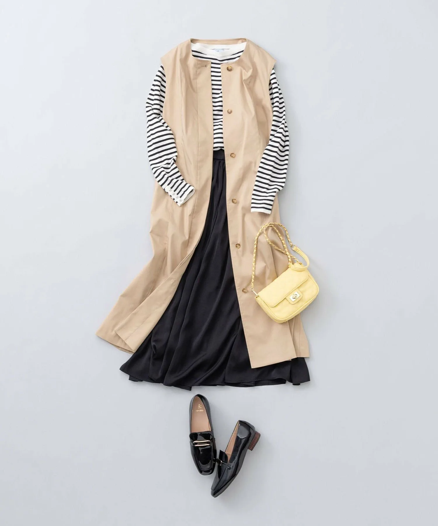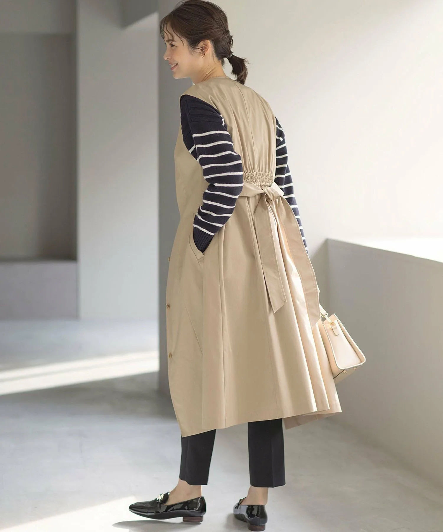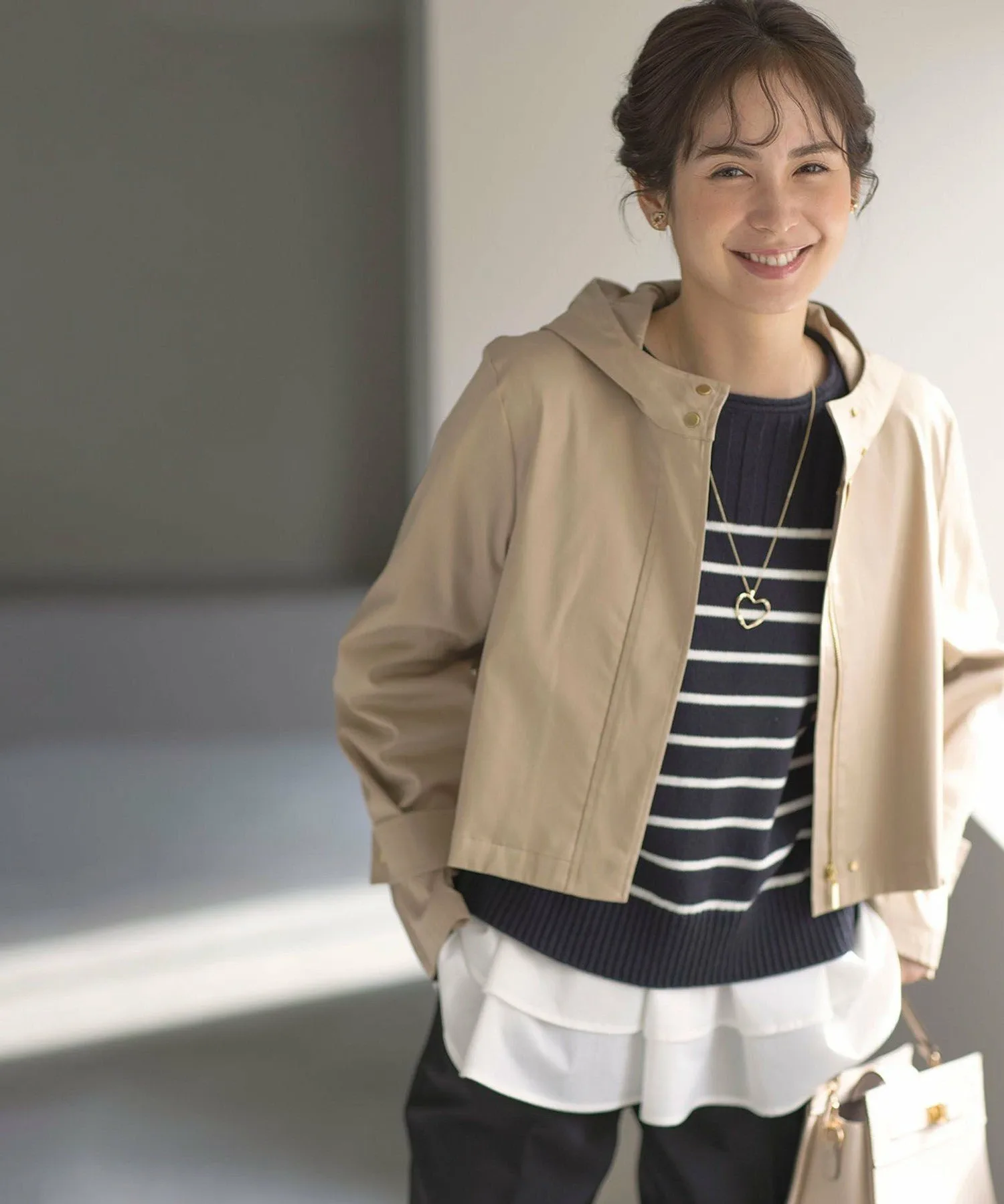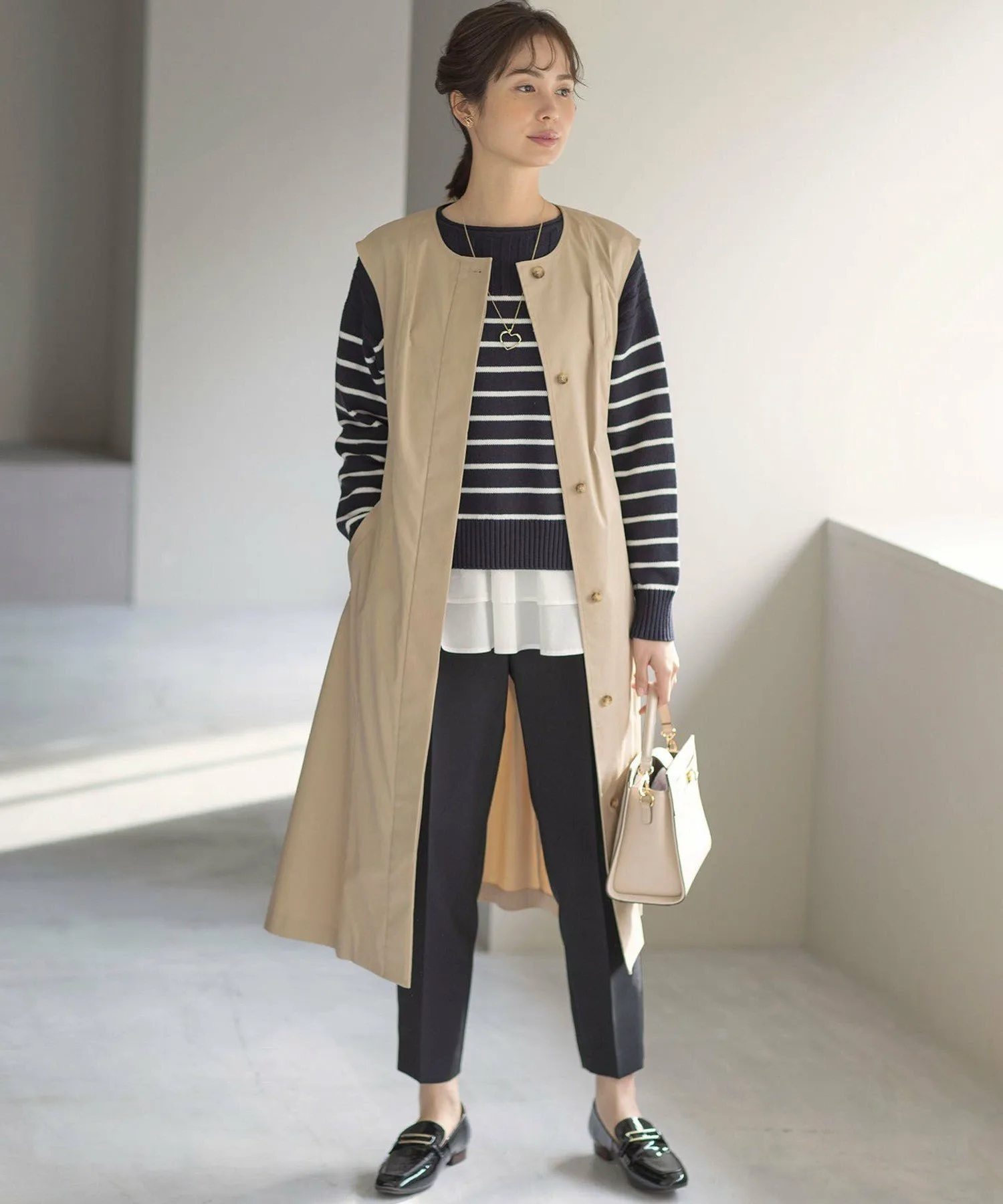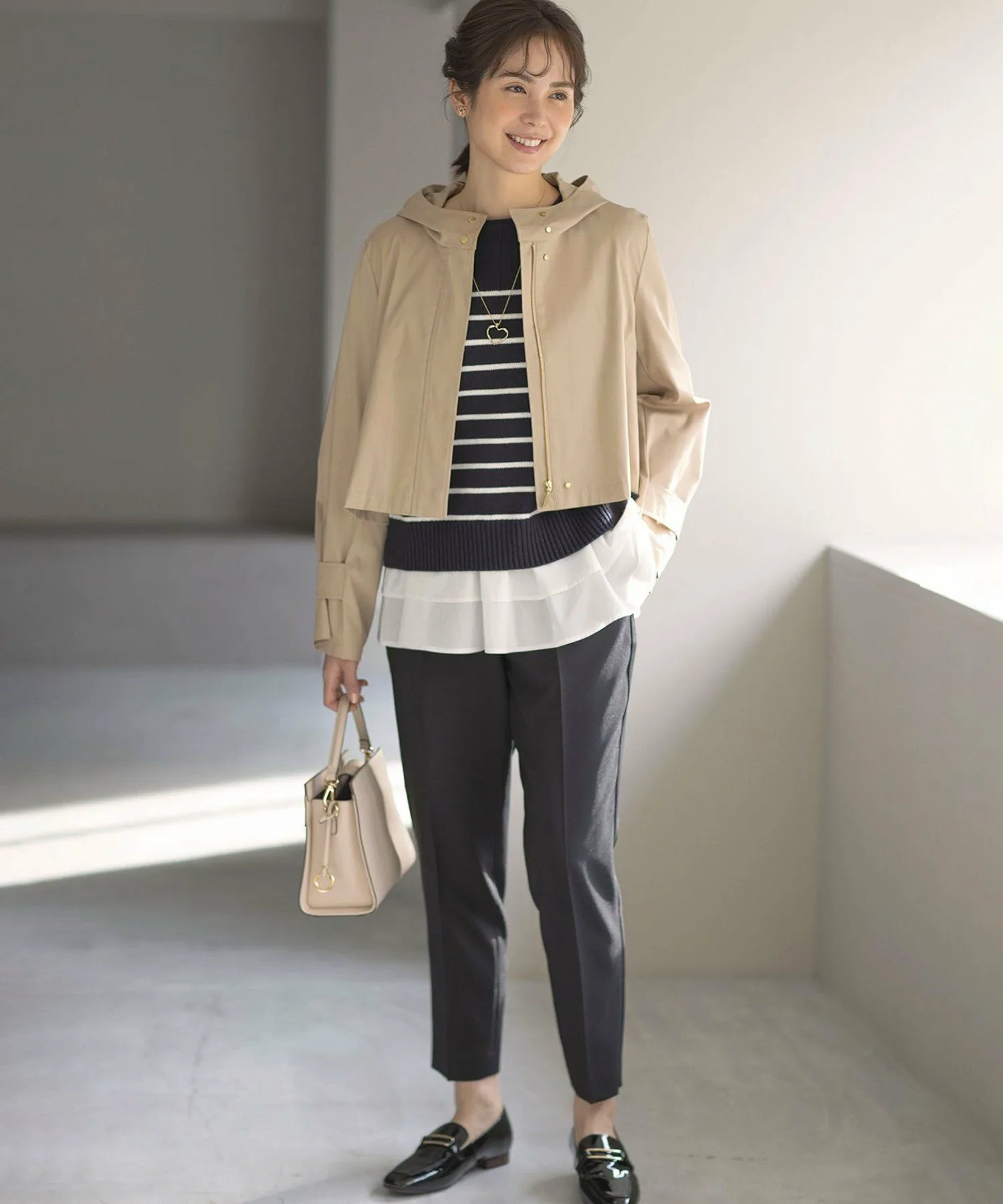 Этот комплект верхней одежды, состоящий из жилета и укороченной куртки, можно носить тремя способами. Его изысканный силуэт и дизайн, адаптирующийся к перепадам температуры, очень привлекательны. Дизайн: 3 способа ношения! Это удобная вещь для повседневной носки, а также для путешествий и деловых поездок. 1. Наденьте длинный жилет с укороченной курткой, чтобы создать длинное пальто. 2. Носите укороченную куртку с капюшоном отдельно для создания изысканного, элегантного повседневного образа. Слегка свободный силуэт с удлиненной спинкой и модной укороченной длиной создают утонченный образ. Складки на спине добавляют объем, что делает его идеальным сочетанием с широкими брюками и длинными юбками. Рукава достаточно широкие, чтобы носить их с свободной внутренней одеждой, но манжеты можно затянуть с помощью застежек для свободы движений и женственного вида. 3. Длинный жилет имеет простую застежку на пуговицах и скрытую планку, что позволяет создавать разнообразные образы, надевая его поверх трикотажа, длинной футболки или блузки. Сборки на талии сзади создают лаконичный вид даже в расстегнутом виде. Мы также рекомендуем носить его со всеми застегнутыми пуговицами и затянутым поясом для создания образа юбки-свитера. Жилет также имеет удобный карман.