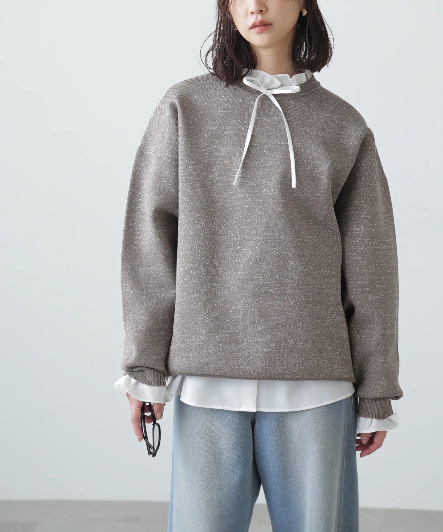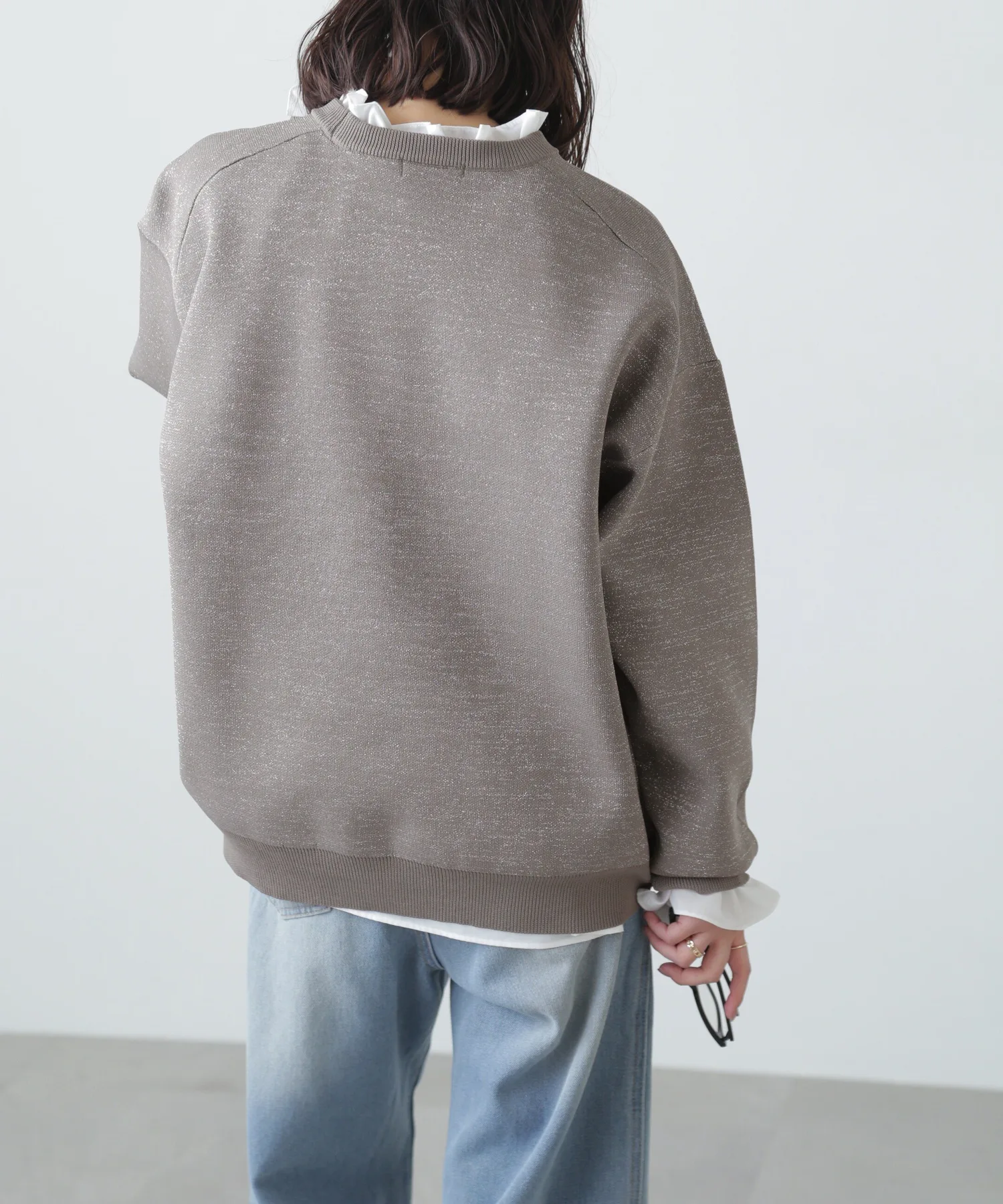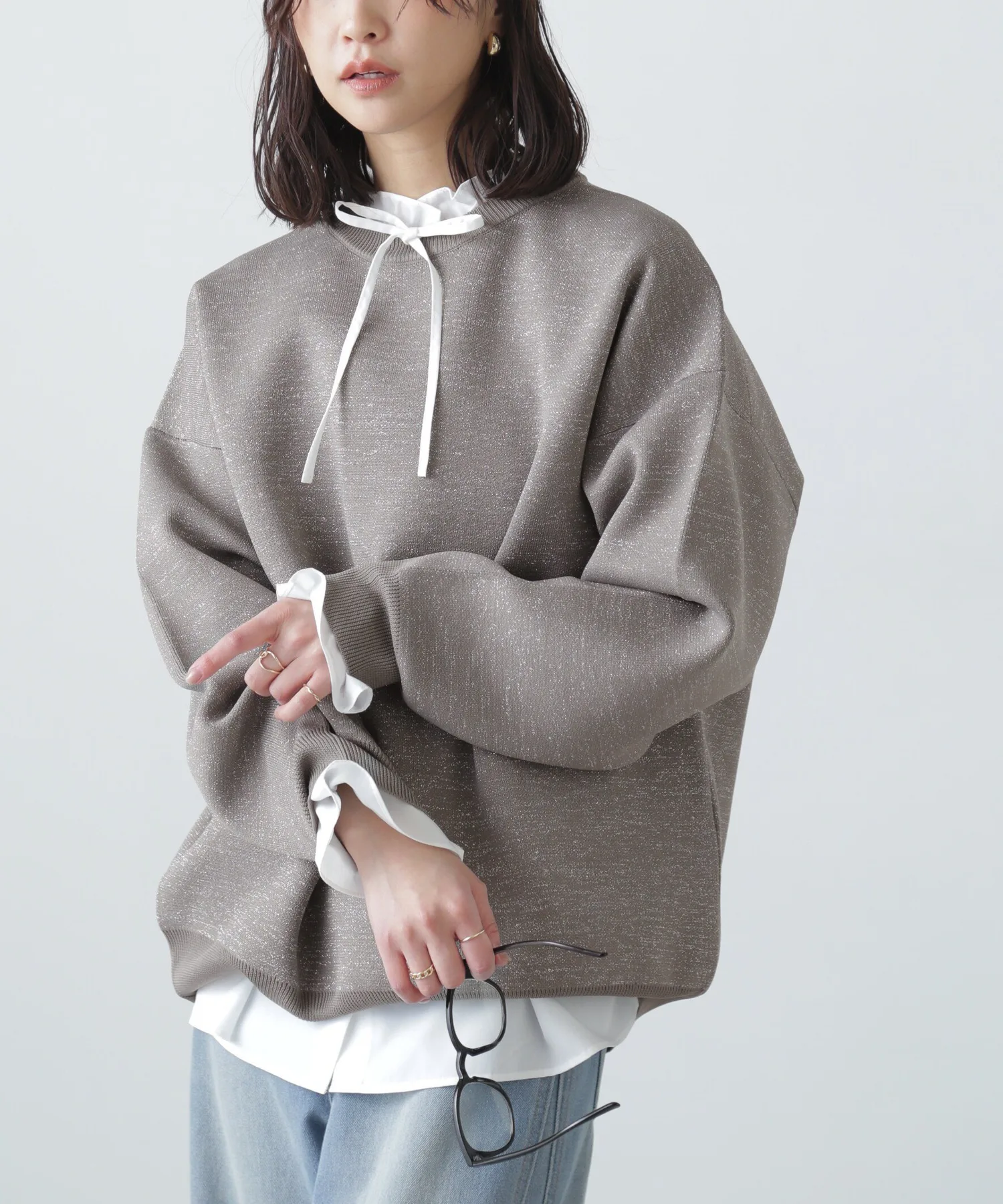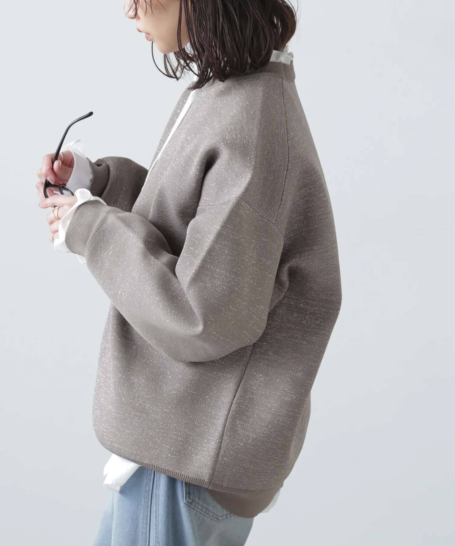 Трикотажная вещь с блестками, похожая на толстовку, идеально подходит для повседневного стиля для взрослых Простая, но свободная трикотажная вещь, напоминающая толстовку, с объемными рукавами. Изготовлена из блестящего материала, поэтому вы можете наслаждаться модным повседневным образом с гламурным оттенком. Блестящий материал приятен на ощупь. Благодаря трикотажной ткани, вещь не тяжелая даже при объемном силуэте. Сочетайте ее с шортами или, поскольку она имеет объемный силуэт, с узкой юбкой для аккуратного образа.
