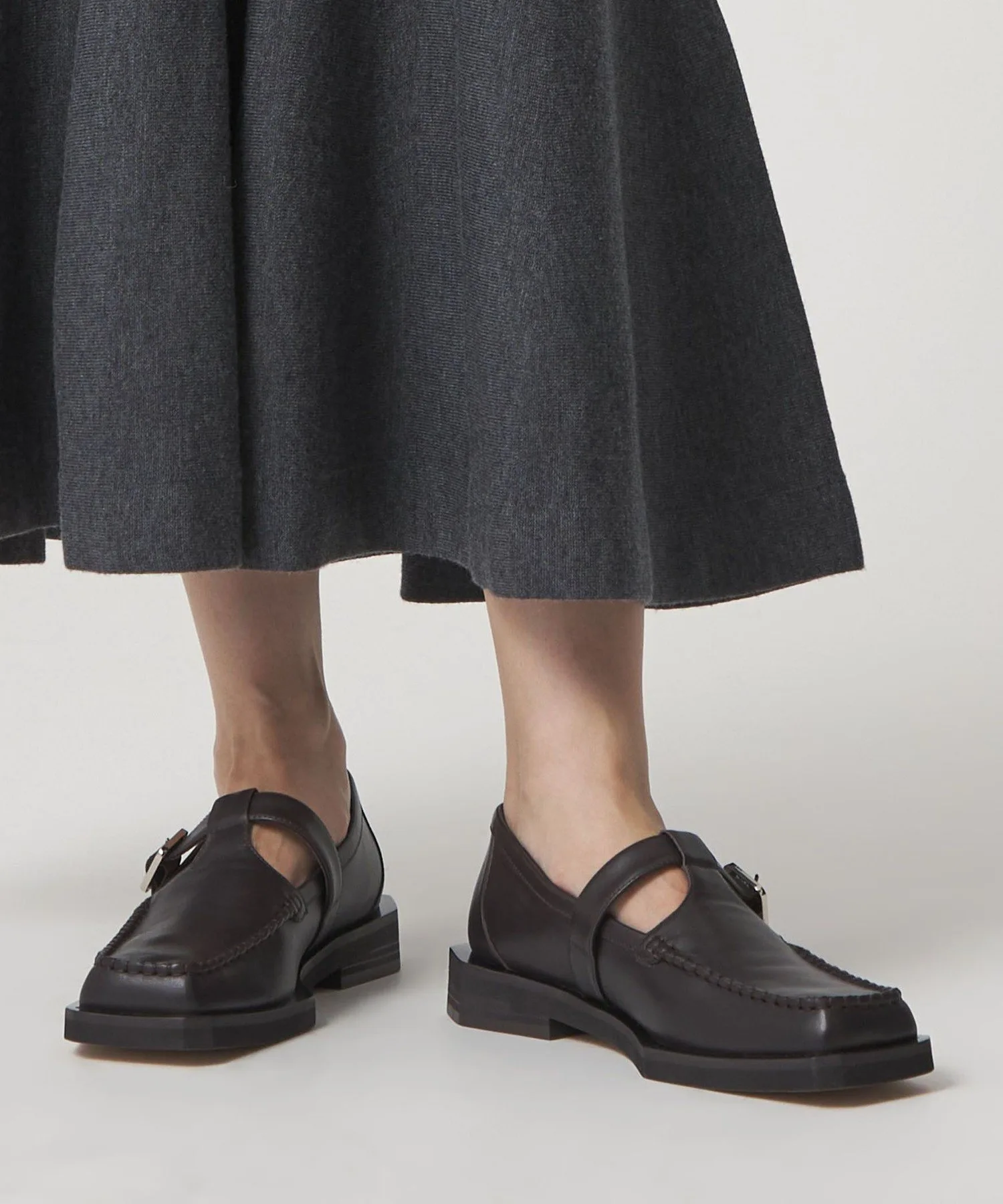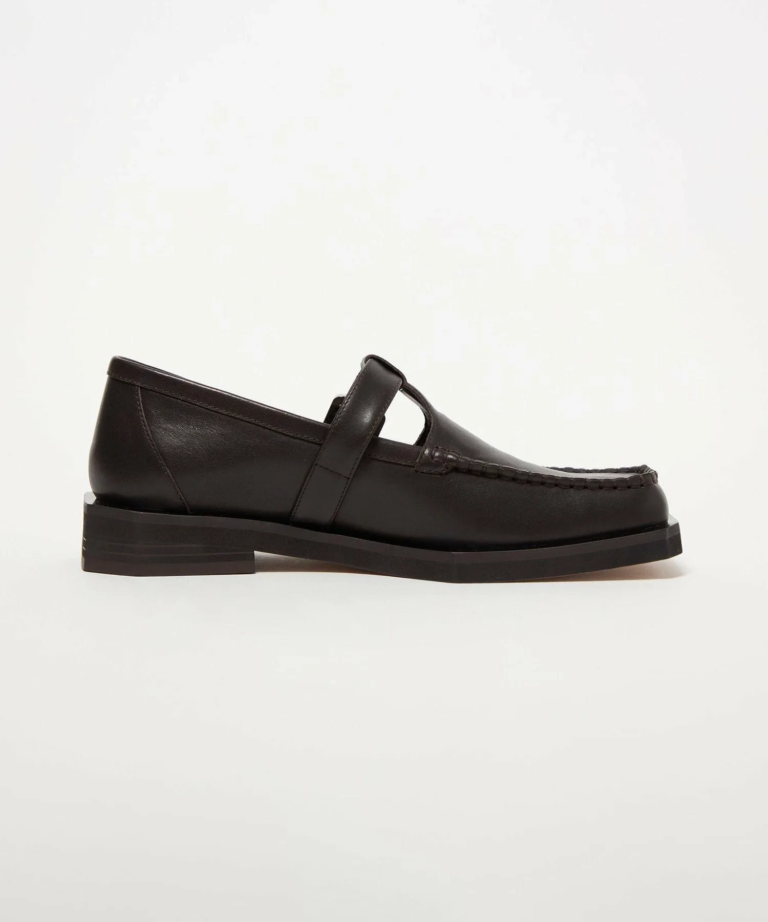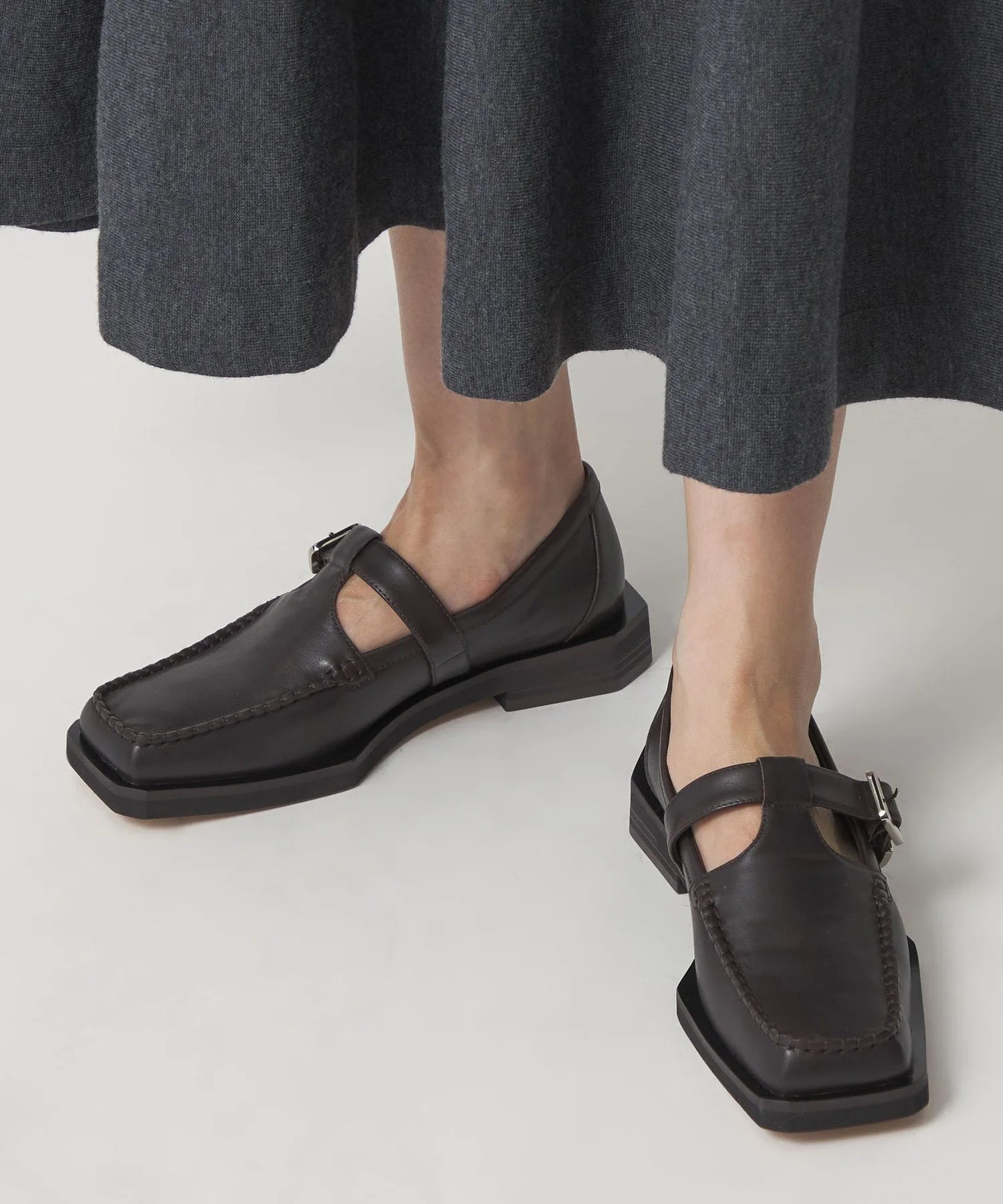 Туфли цвета мокко с Т-образным ремешком имеют квадратный носок и расклешенный край.