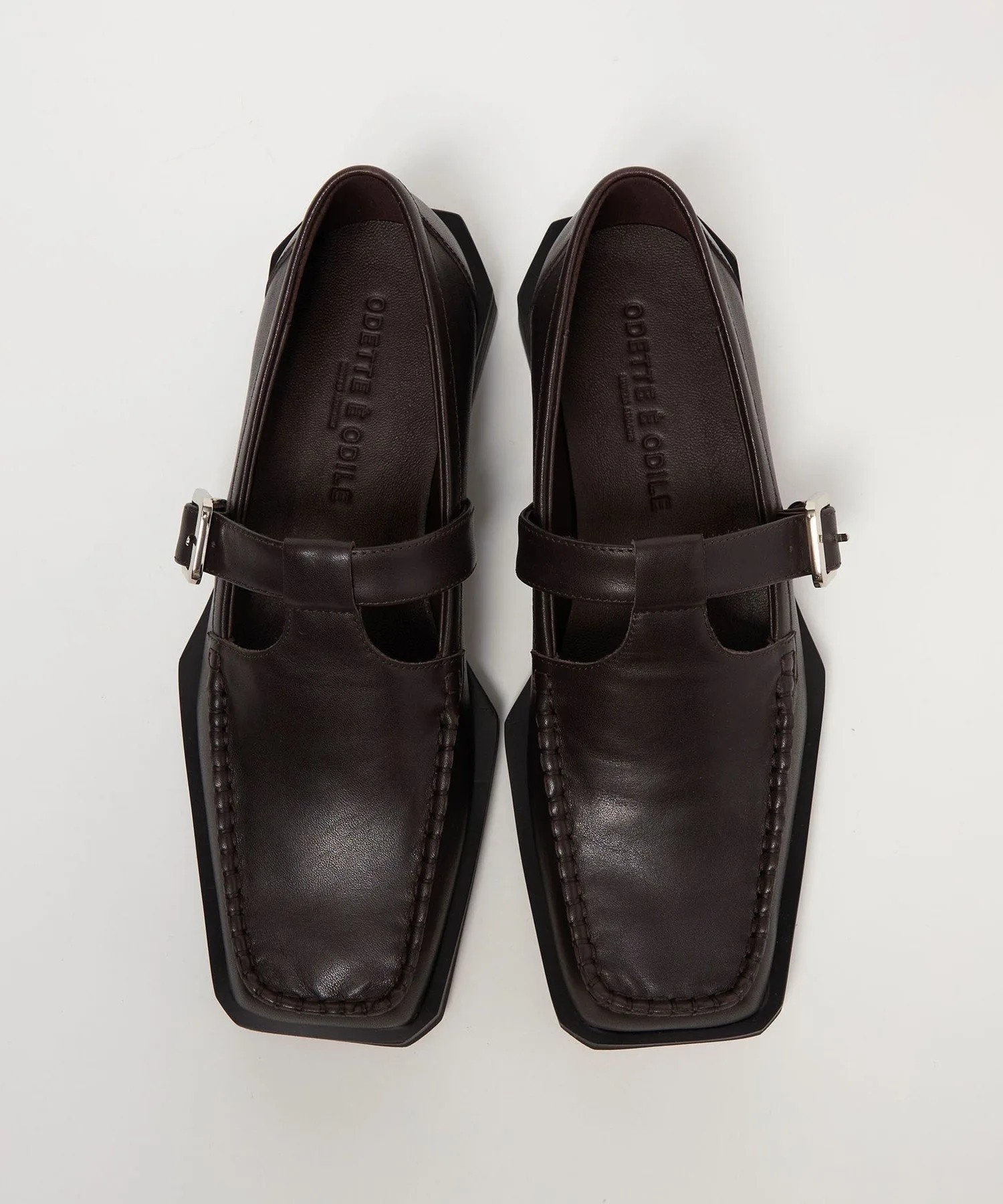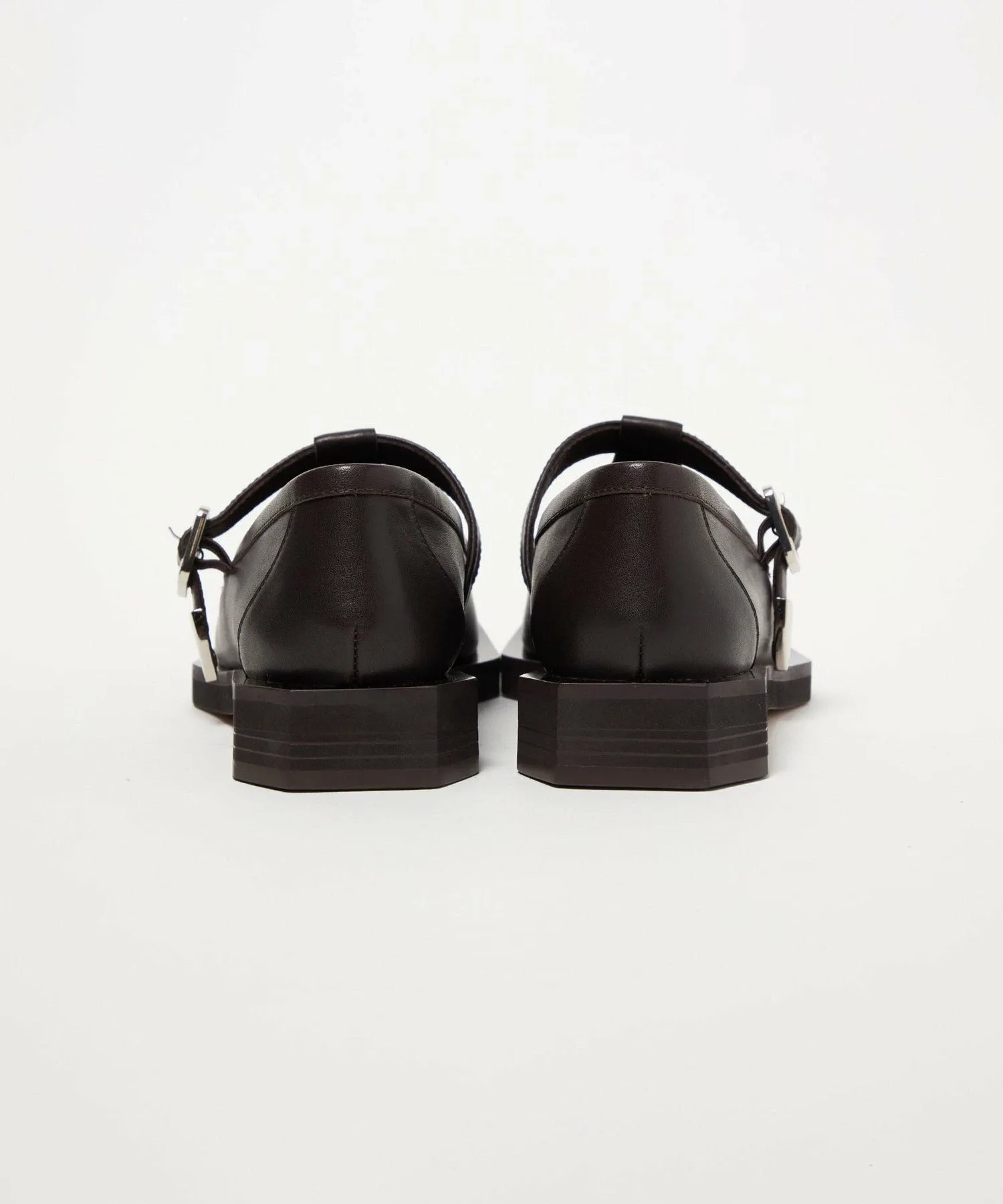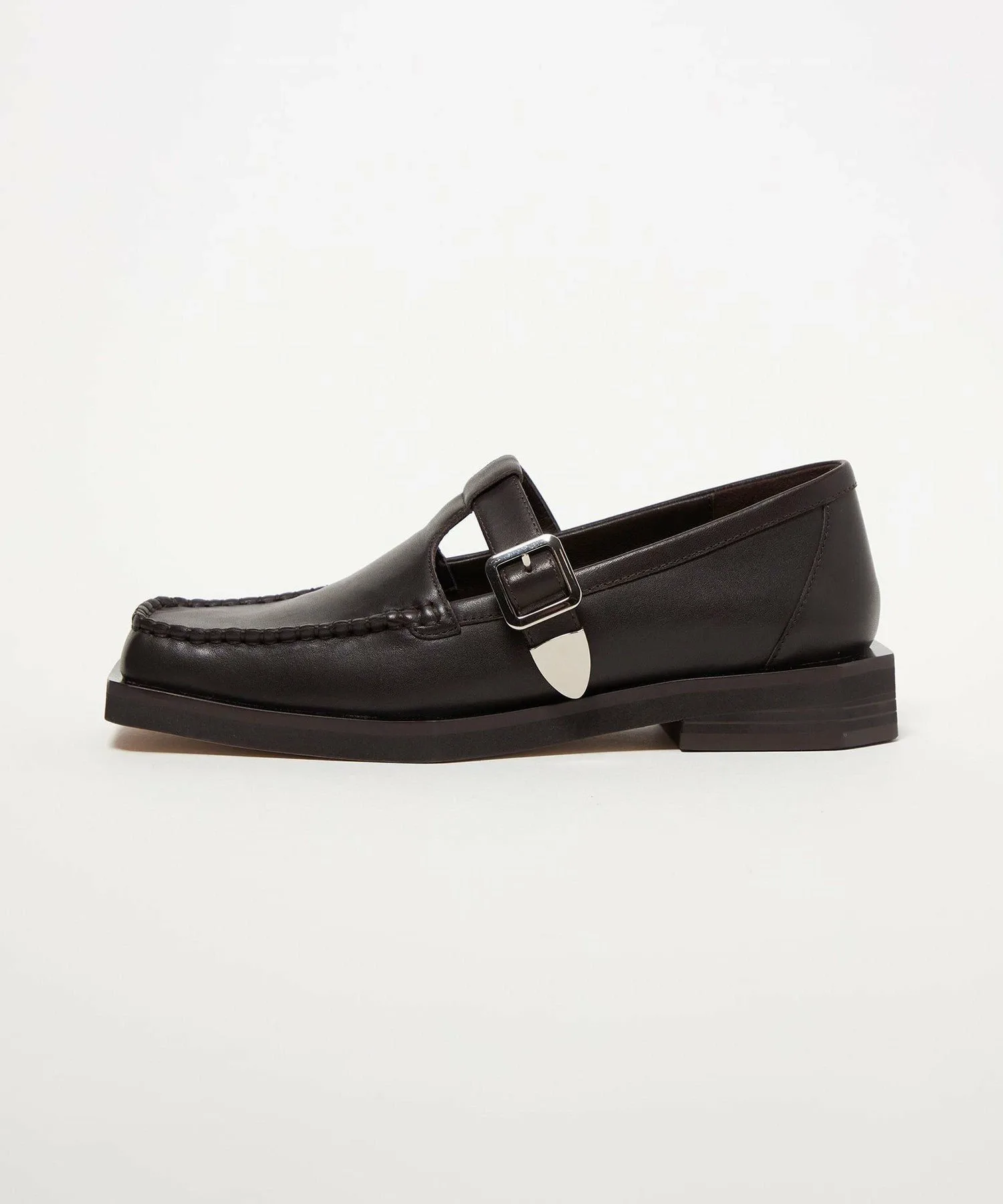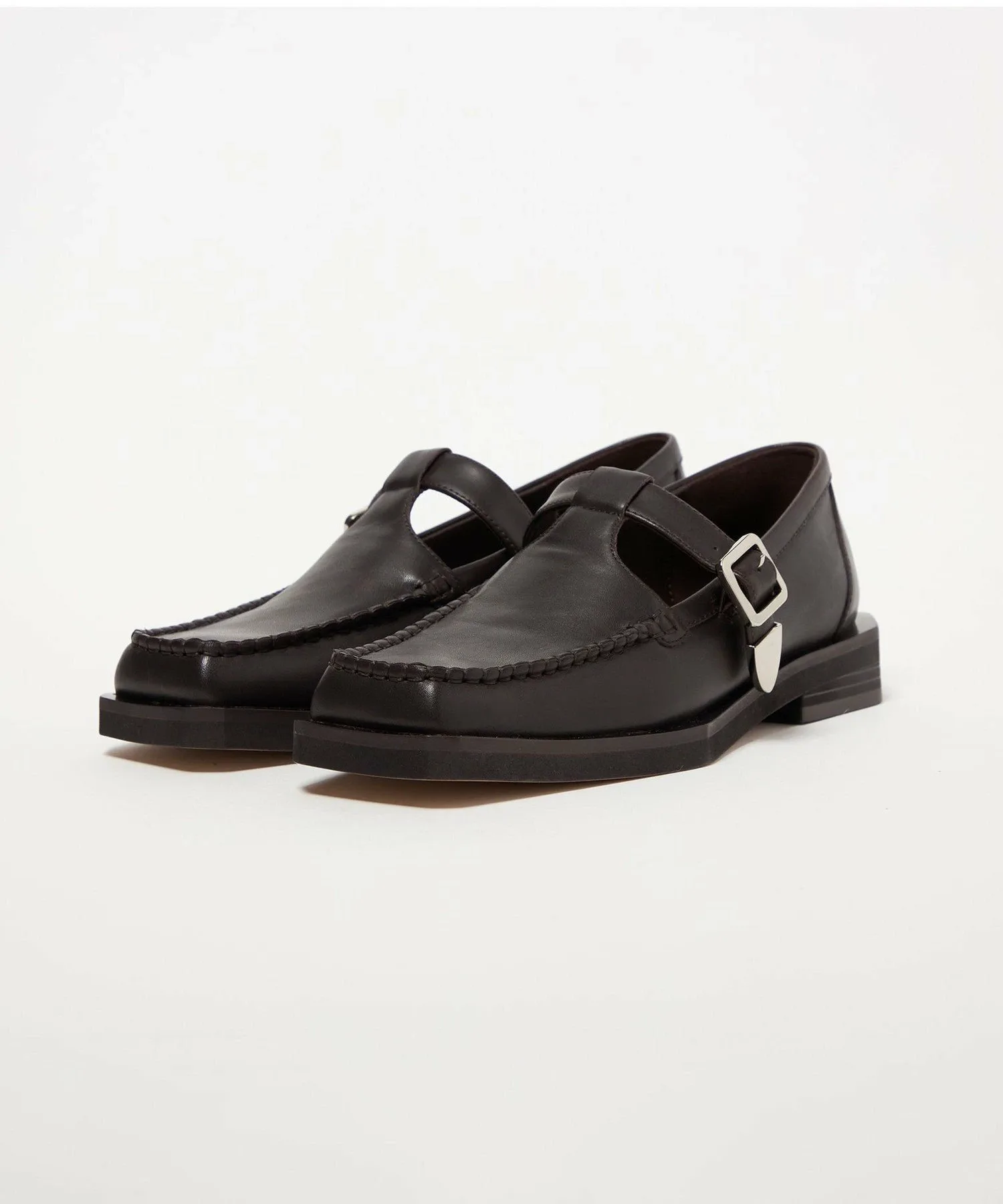 Туфли цвета мокко с Т-образным ремешком имеют квадратный носок и расклешенный край.
