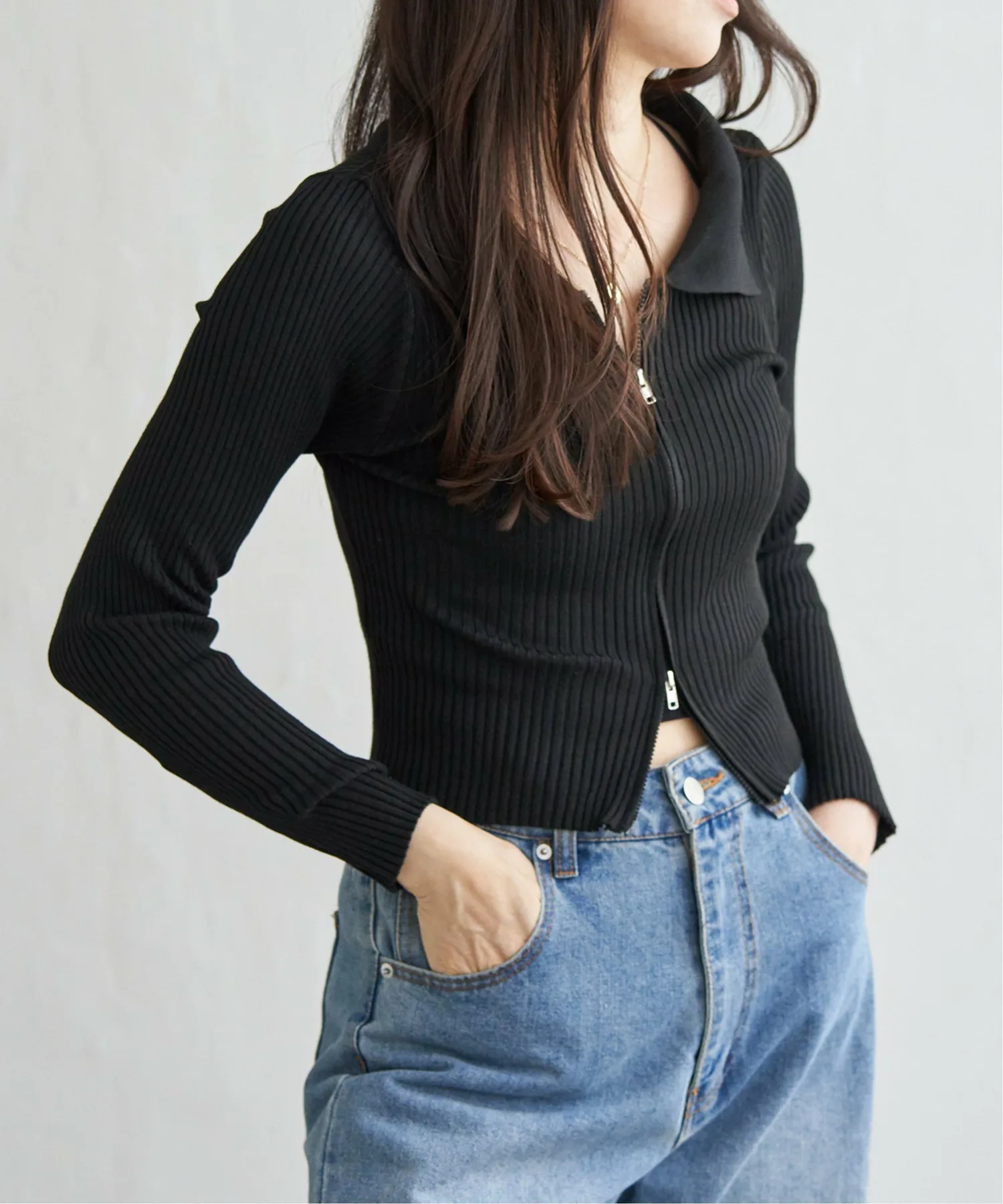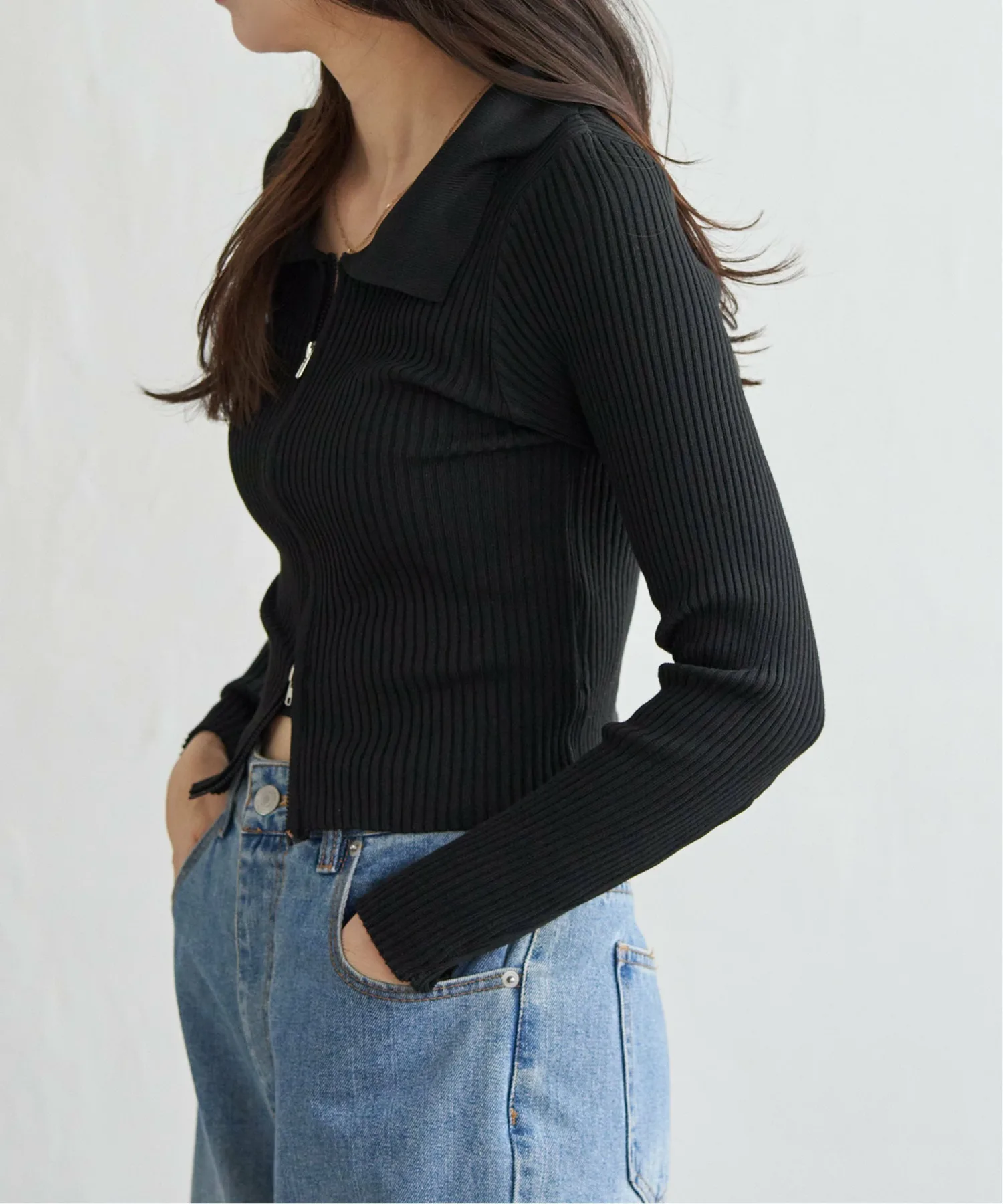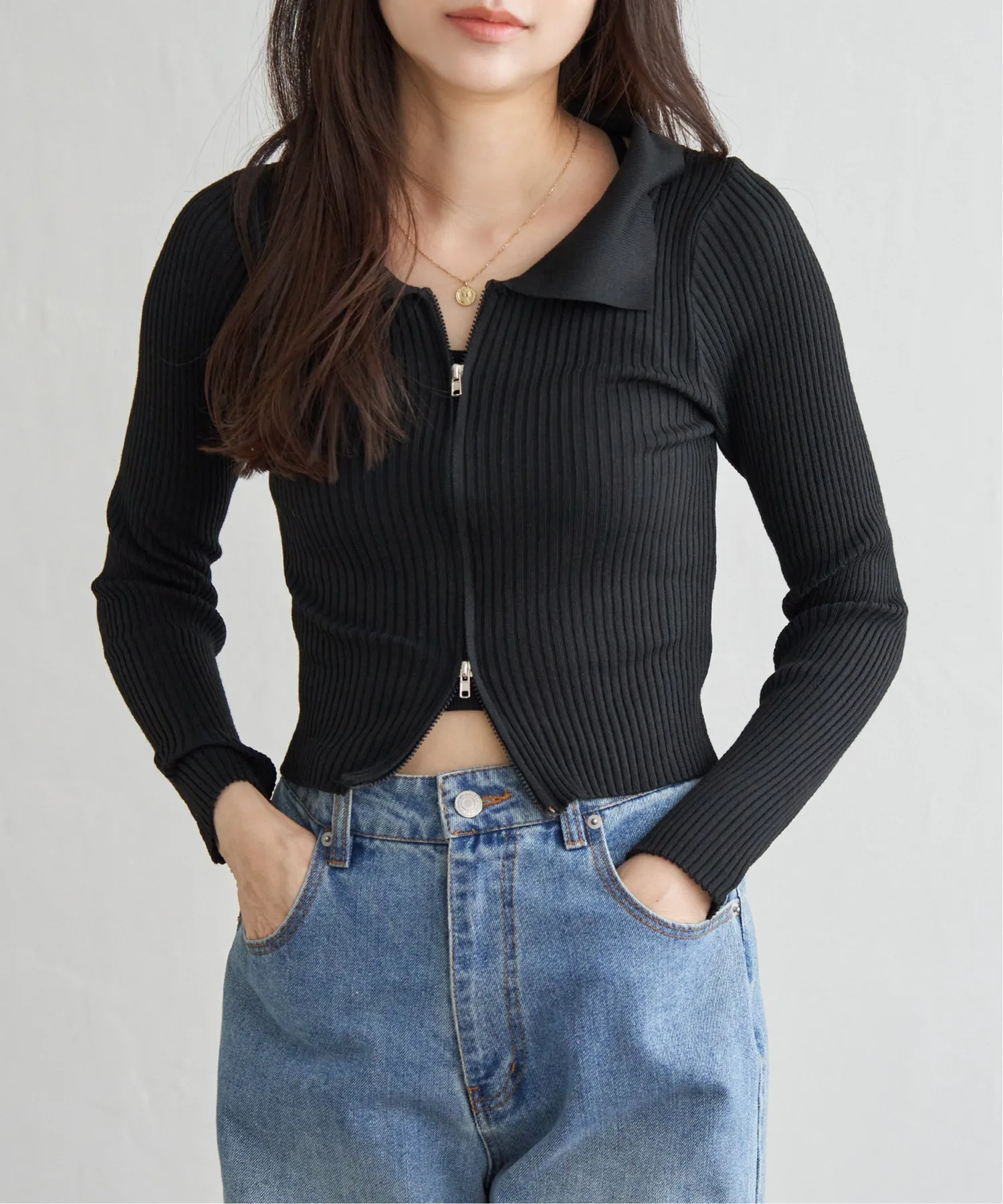 Трикотажная блузка в рубчик короткой длины с двойной молнией, позволяющая создавать самые разнообразные образы.