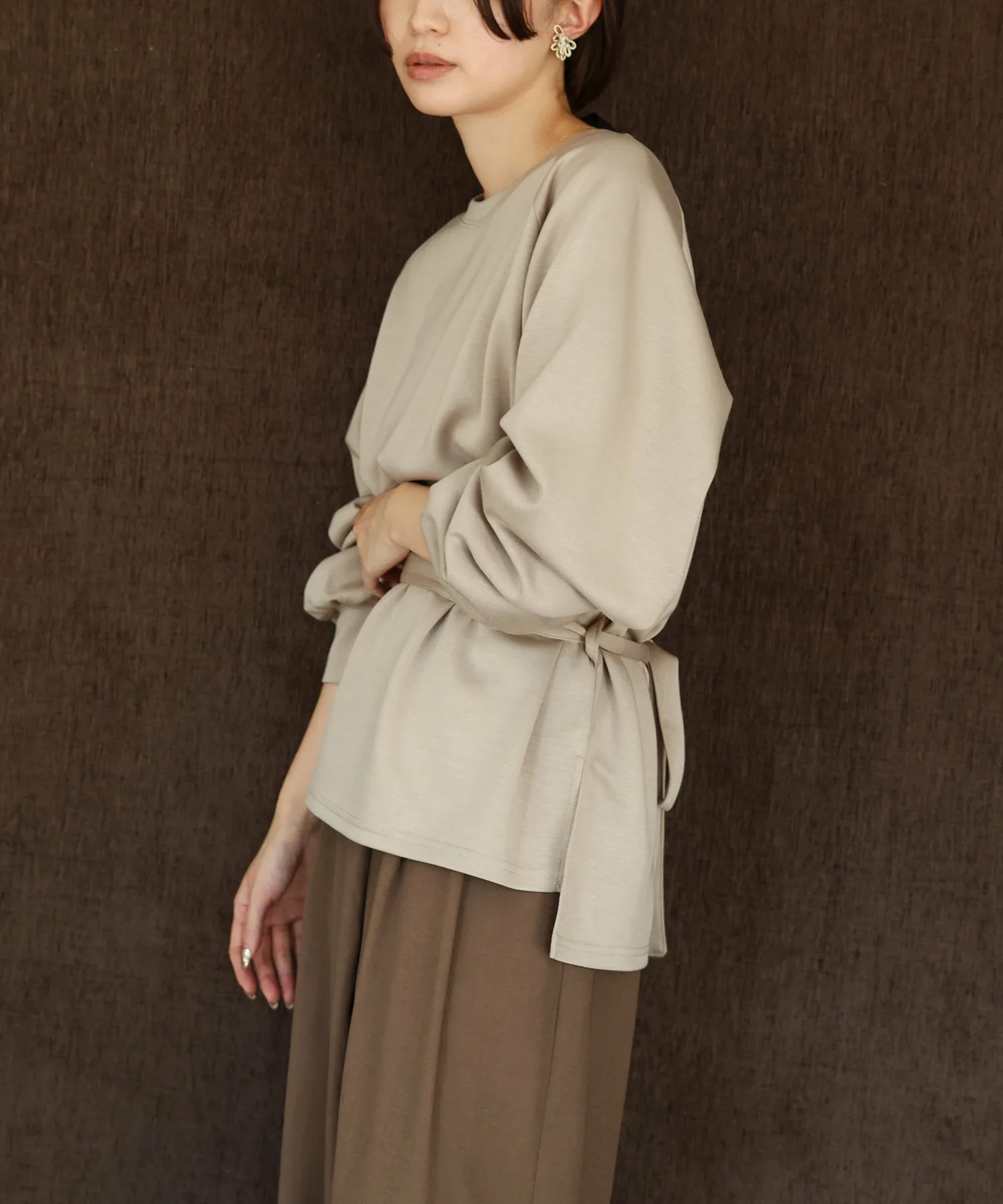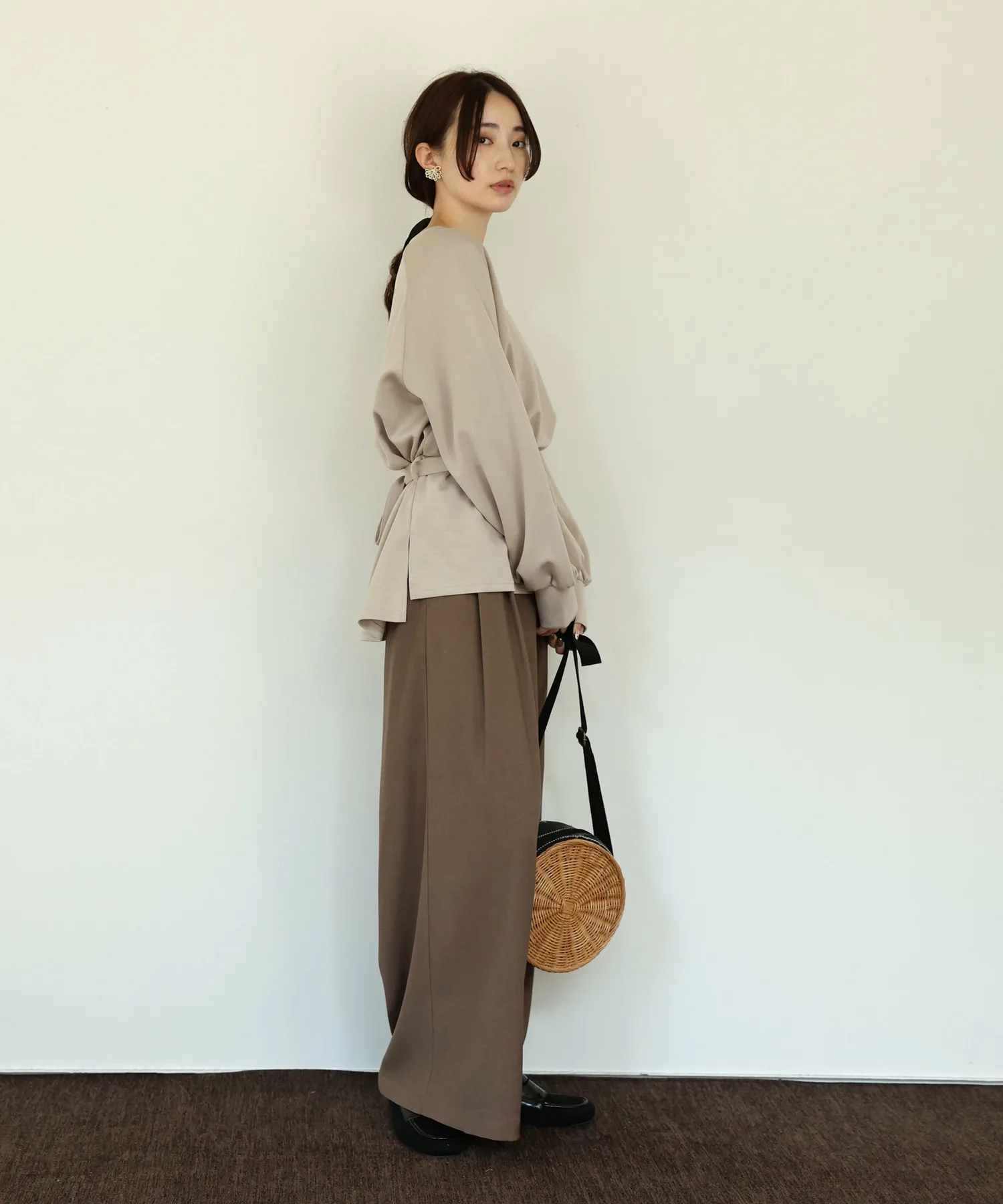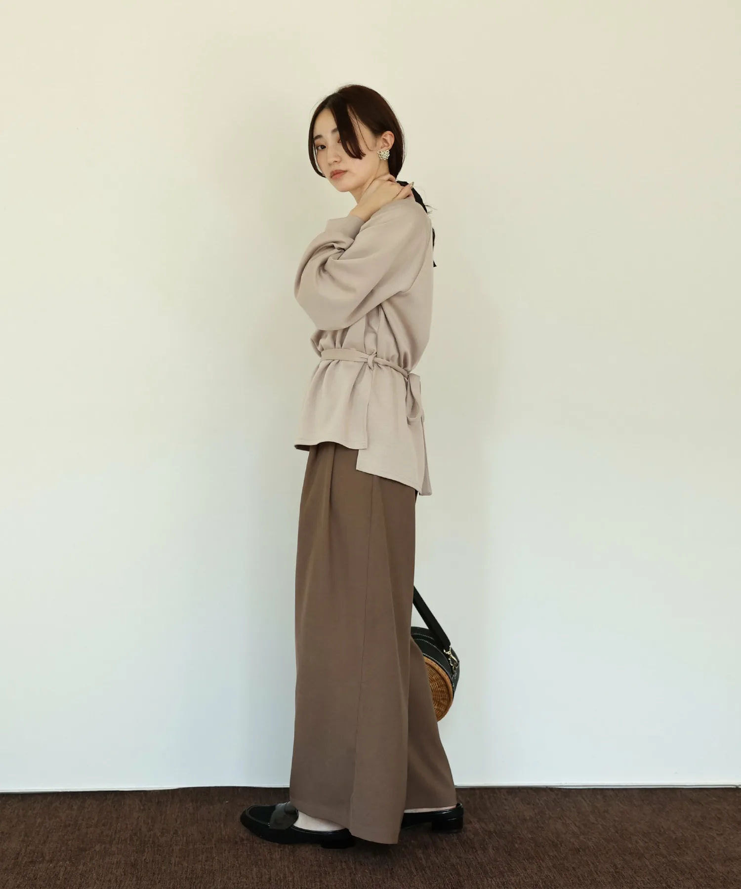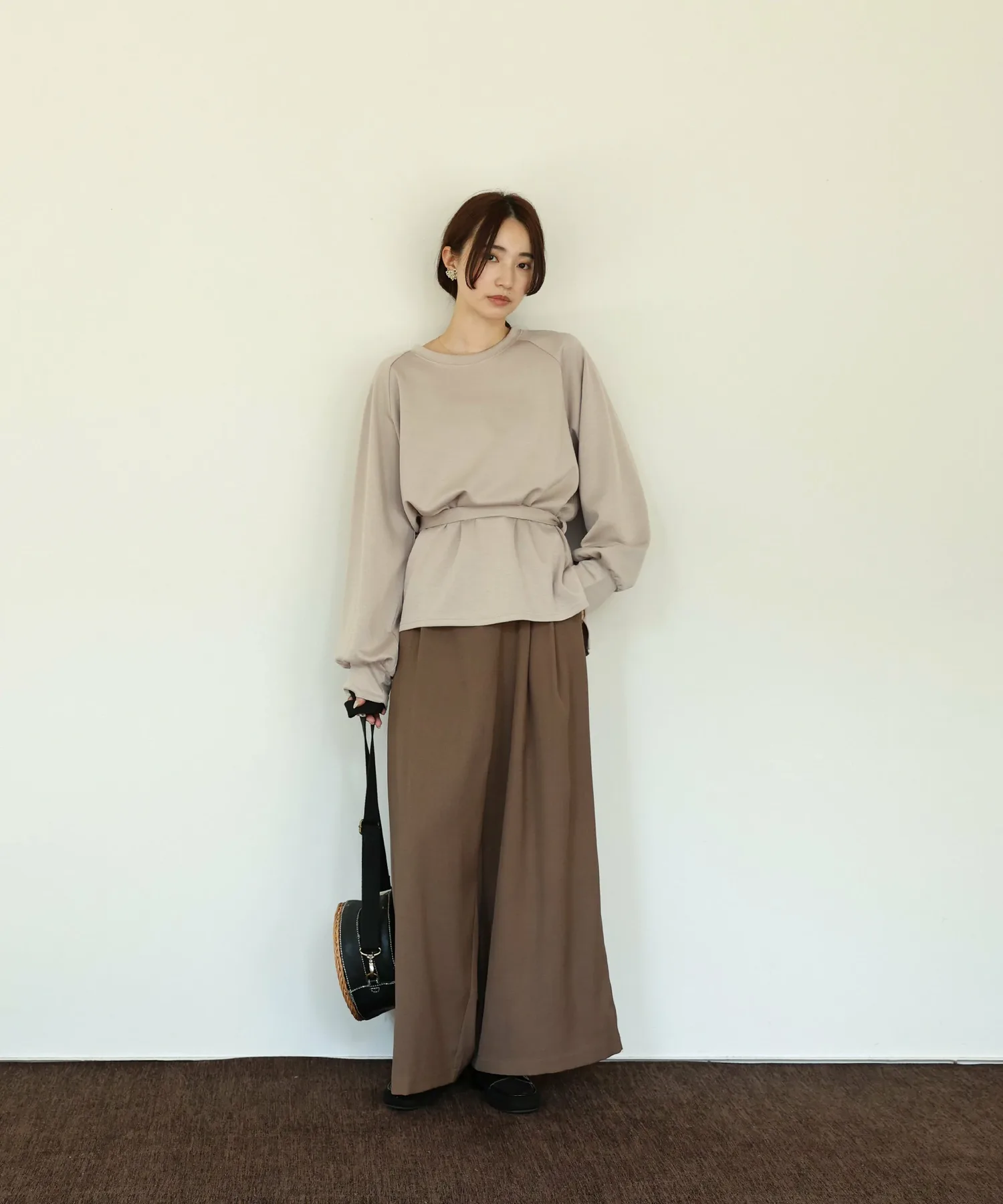 У него есть завязка на талии, поэтому в сочетании с объемными брюками вы можете создать четкий силуэт, отметив талию,