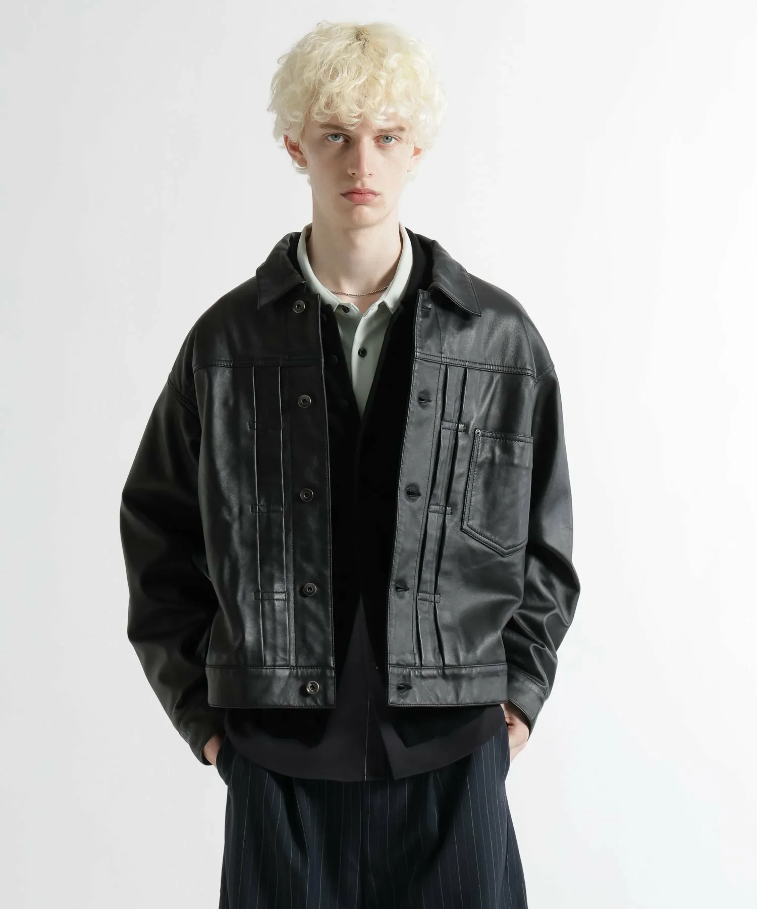 Основанная на дизайне классической куртки-тракера, она выполнена из натуральной кожи, что придает ей шикарный городской вид без излишней грубости.