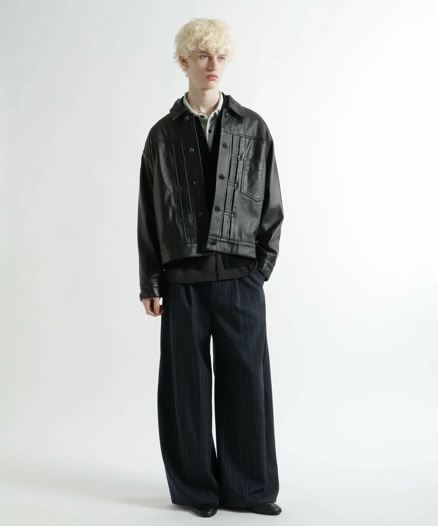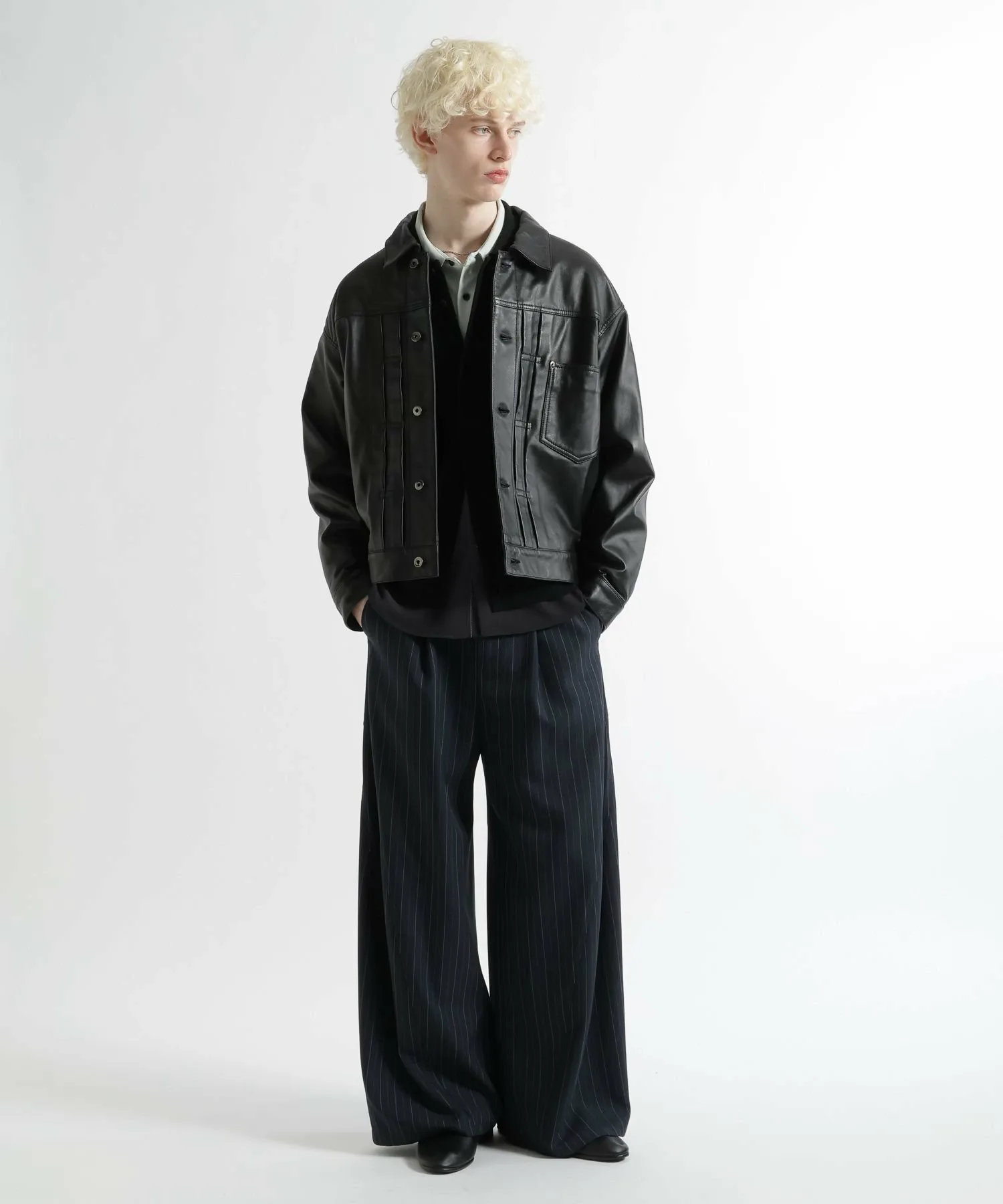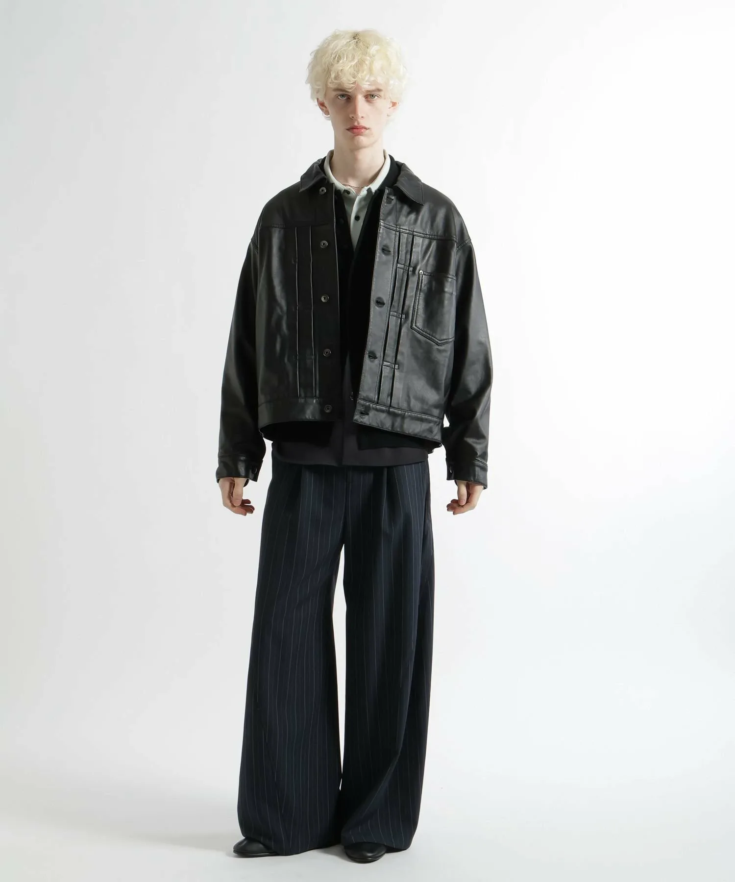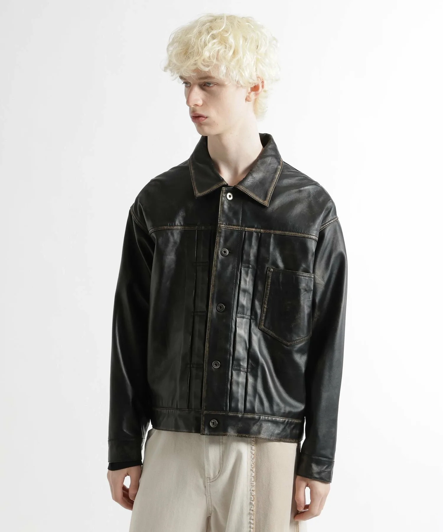 Основанная на дизайне классической куртки-тракера, она выполнена из натуральной кожи, что придает ей шикарный городской вид без излишней грубости.