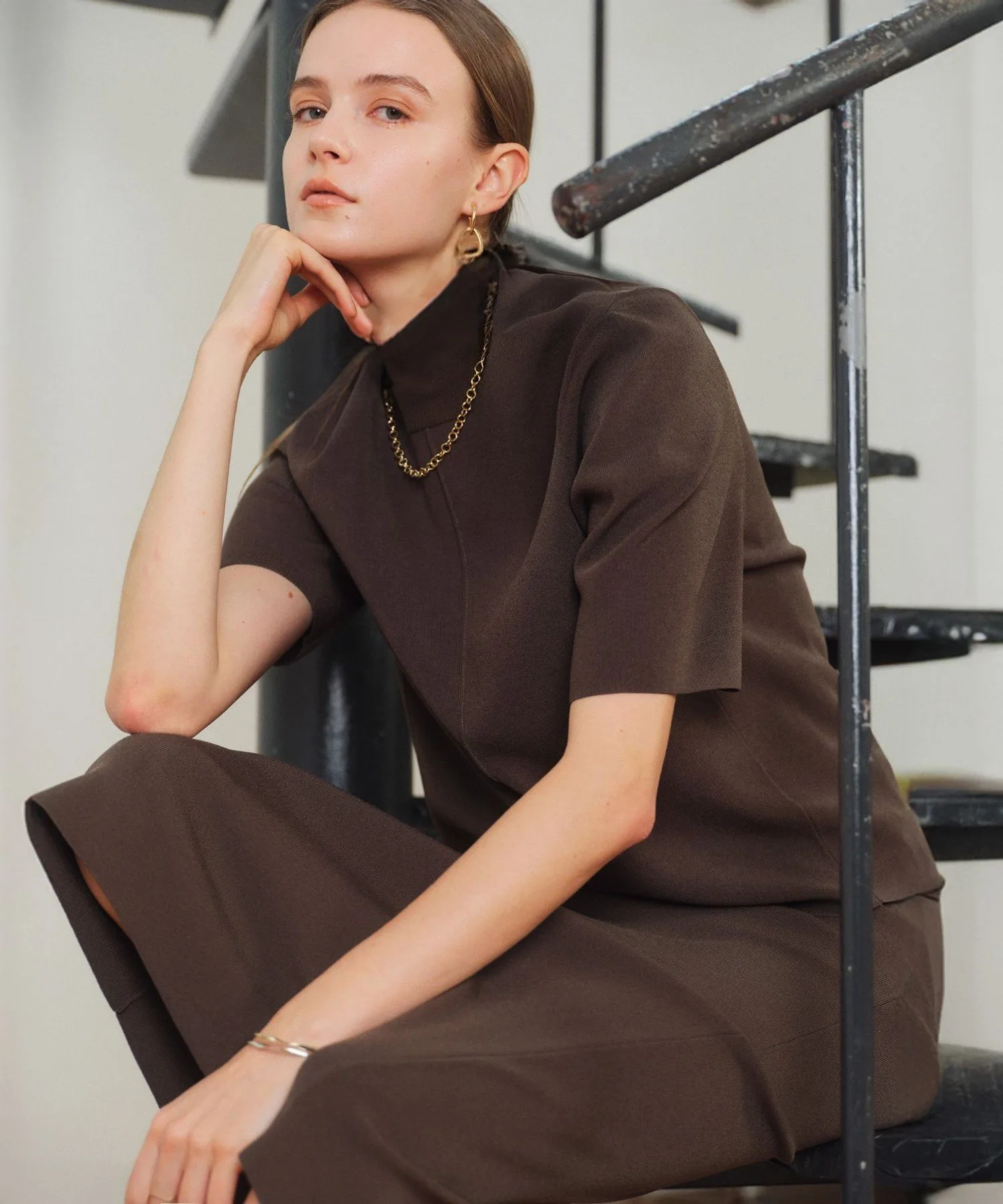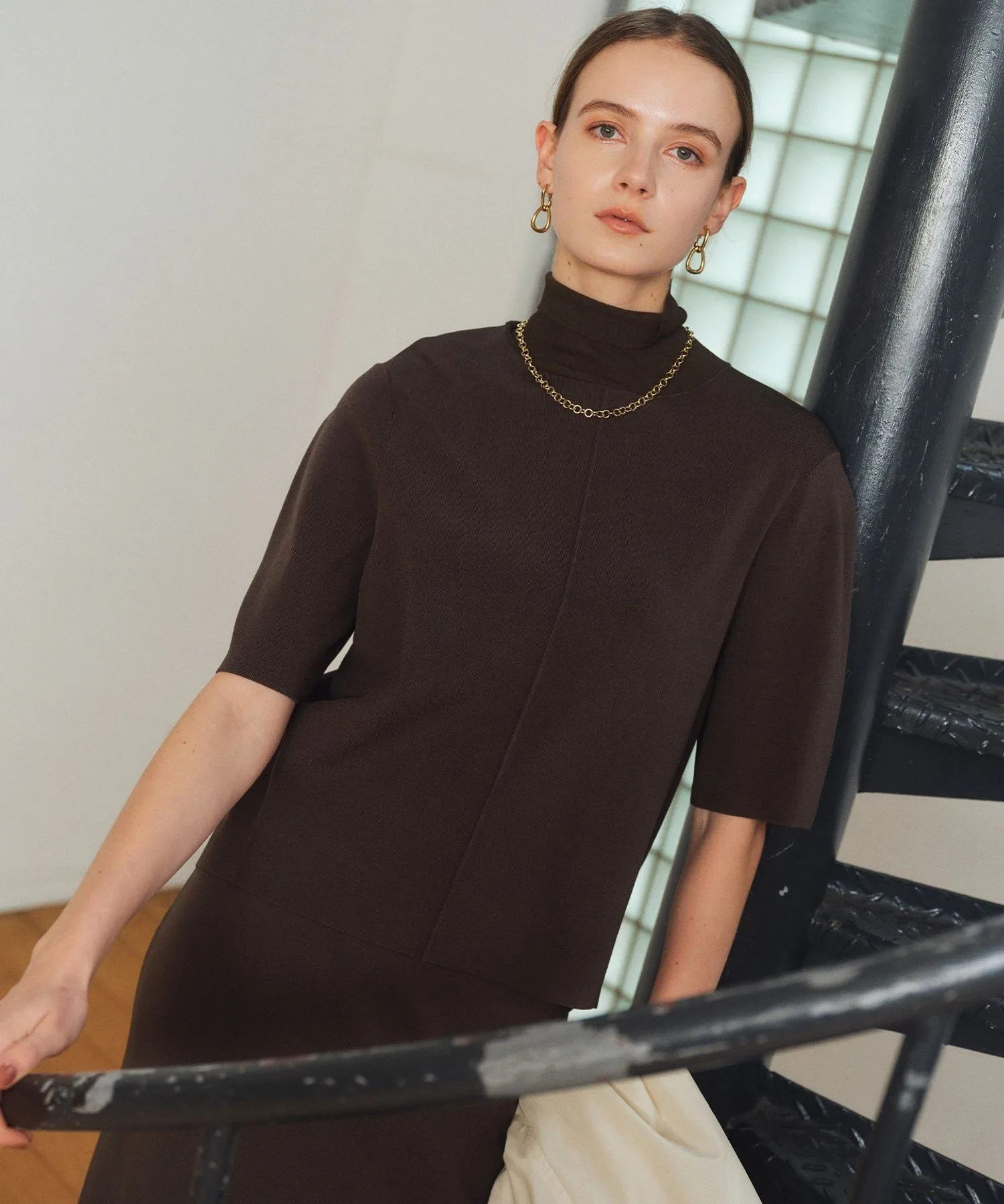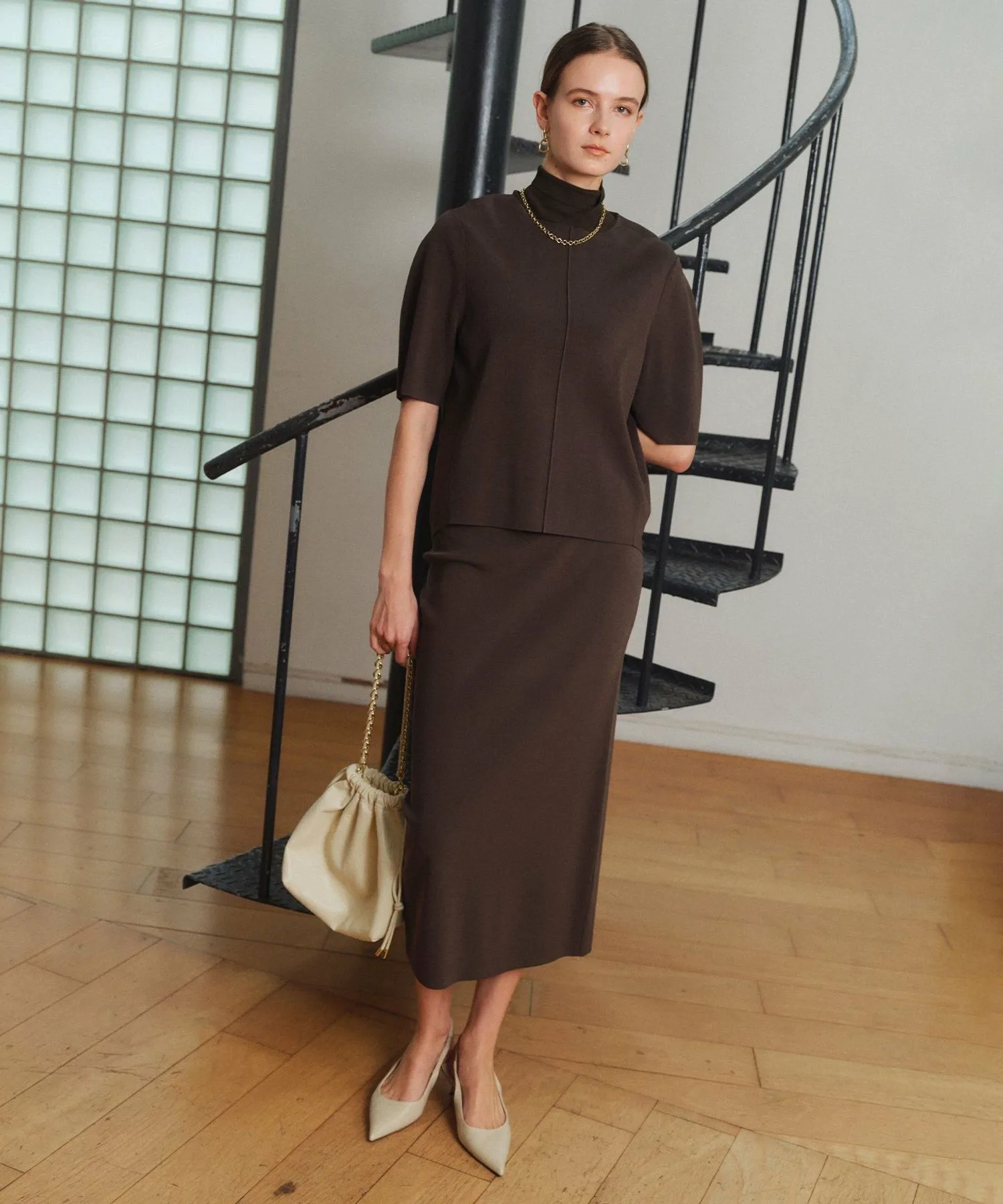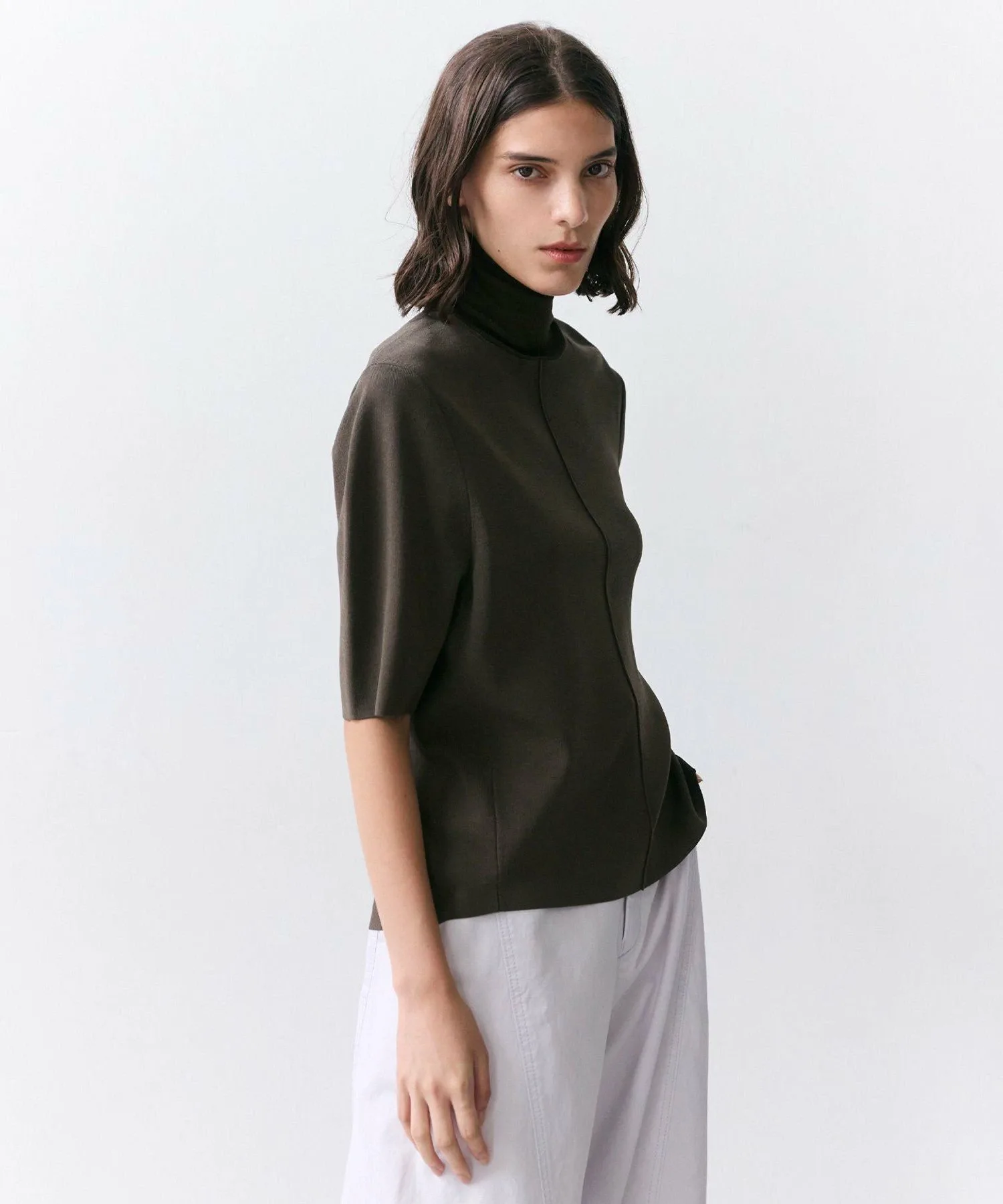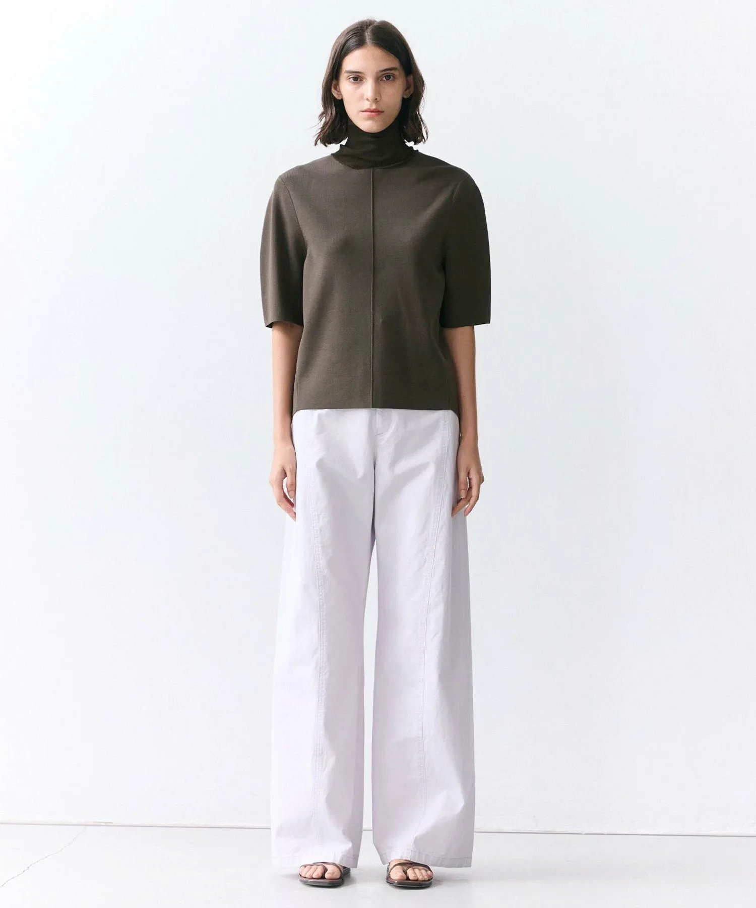 ・Свободный образ с широкими брюками: трехмерная форма трикотажа подчеркивается для создания сбалансированного образа.