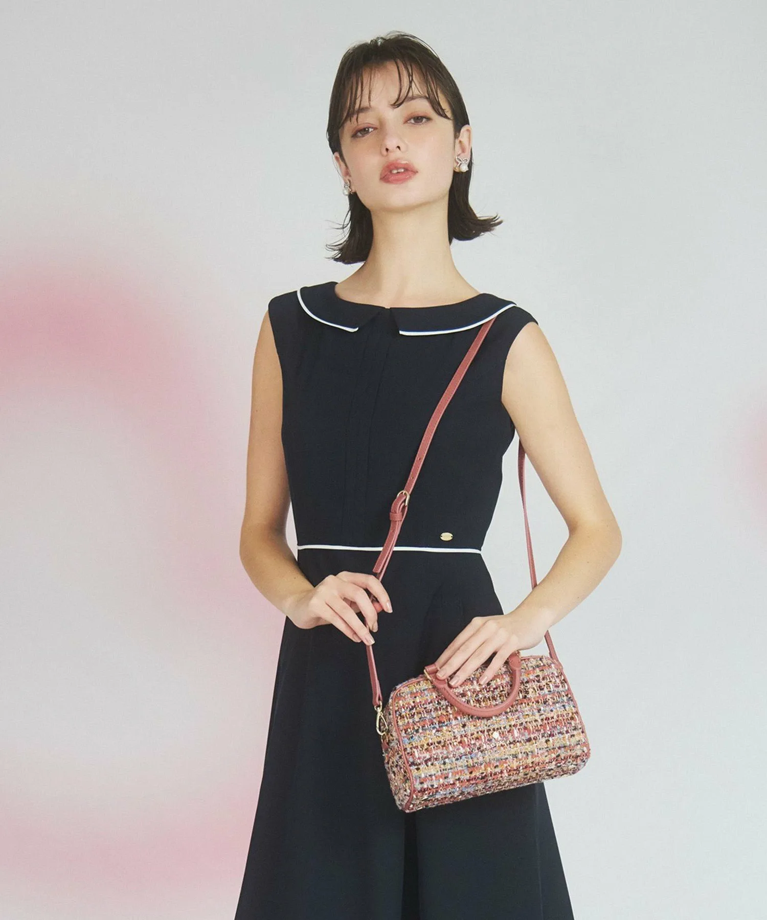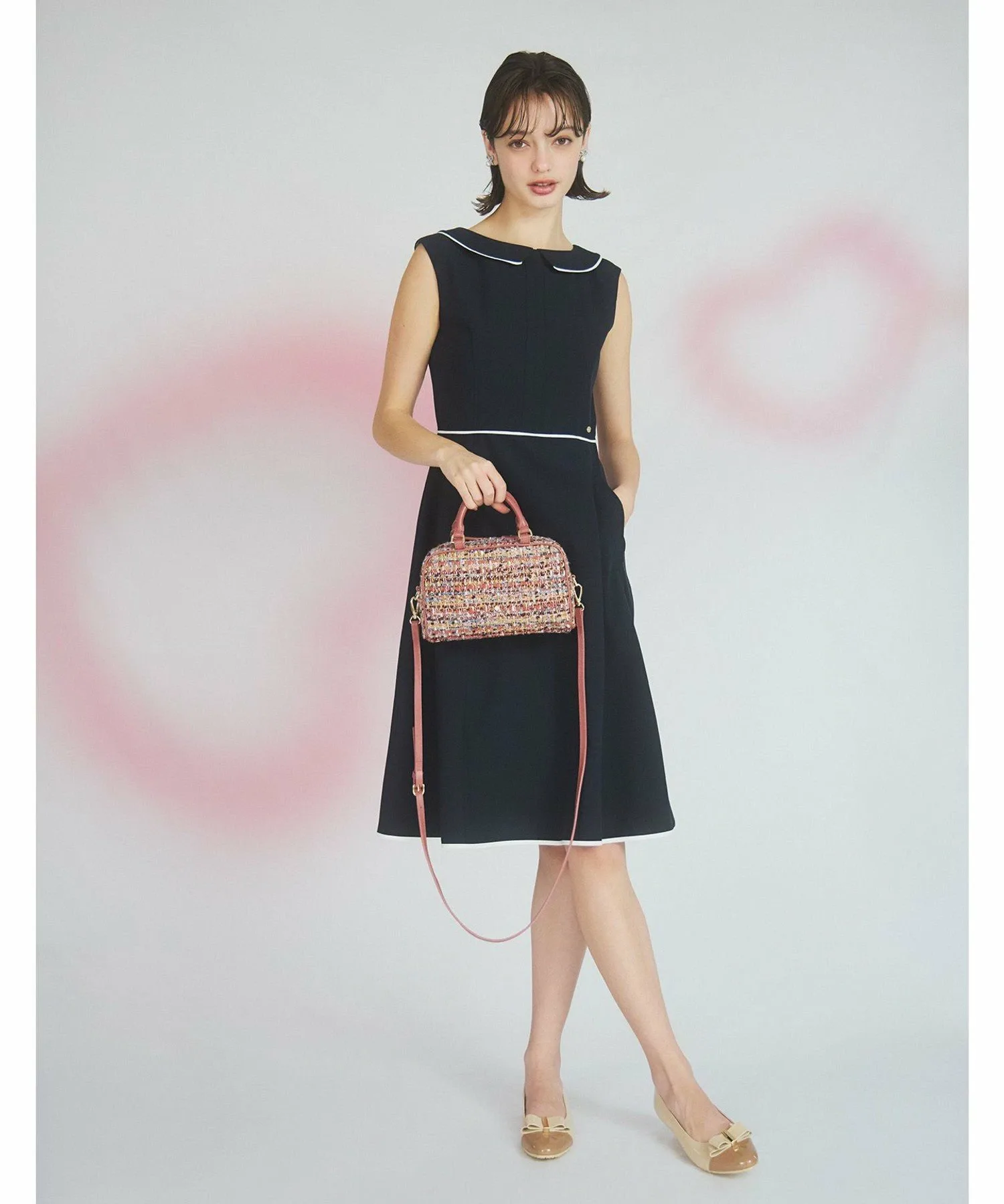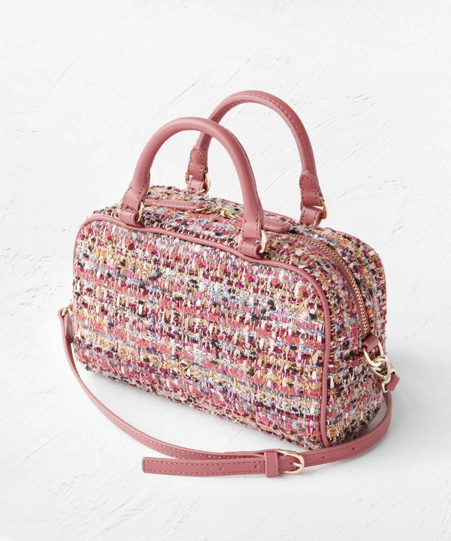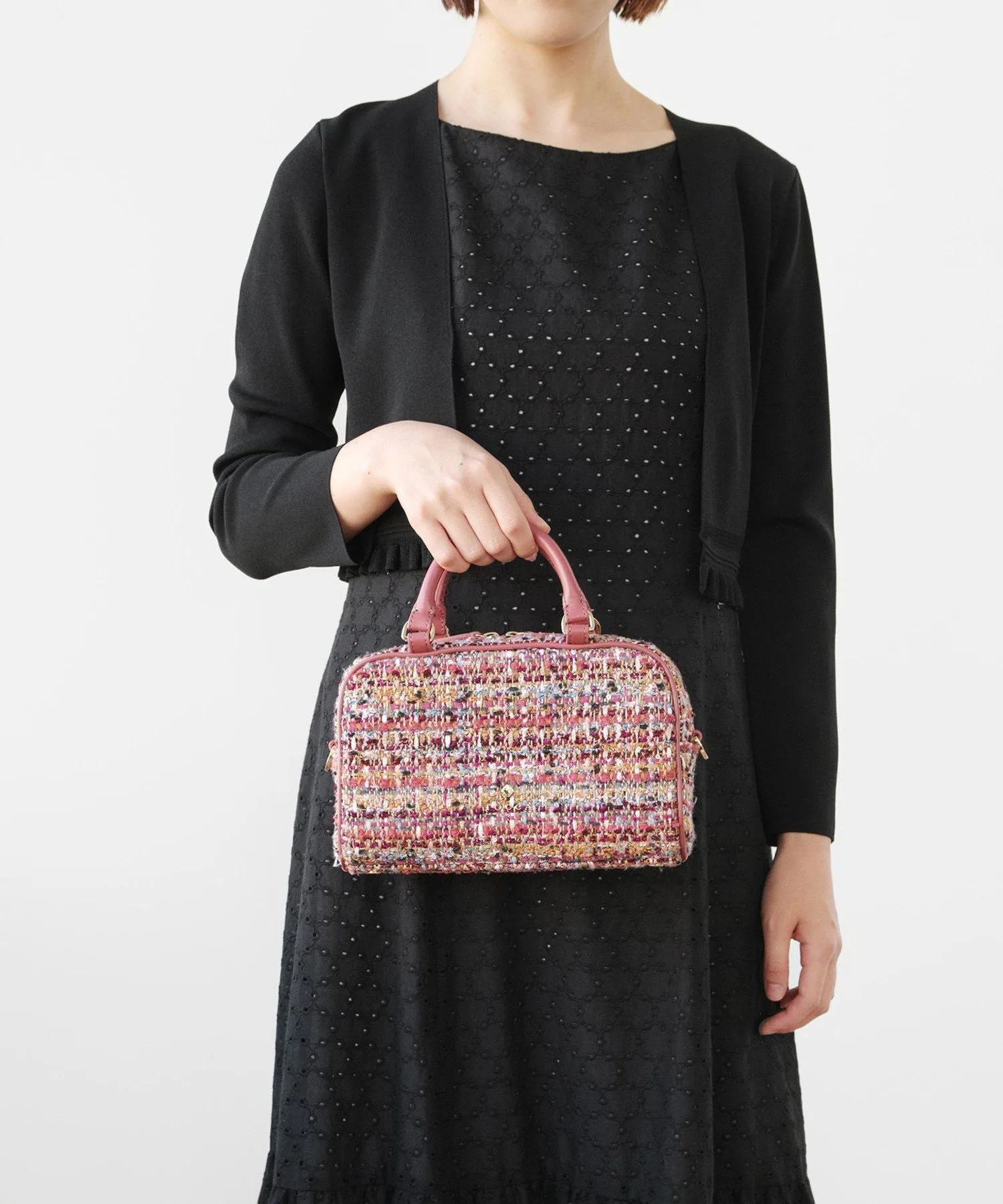 Черный и лососево-розовый твид, сотканный из смеси нитей и лент с различными оттенками, излучает женственность и утонченность. Дизайн добавляет нотку гламура любому образу, подобно ношению аксессуара.