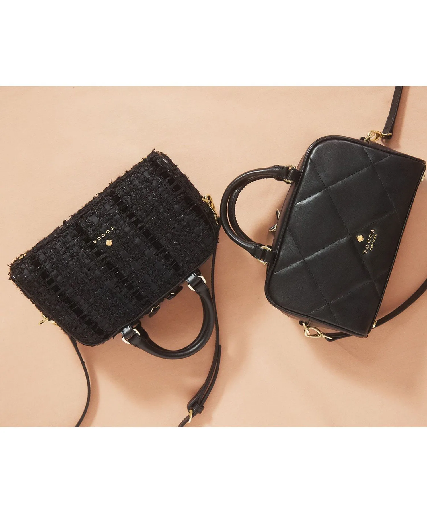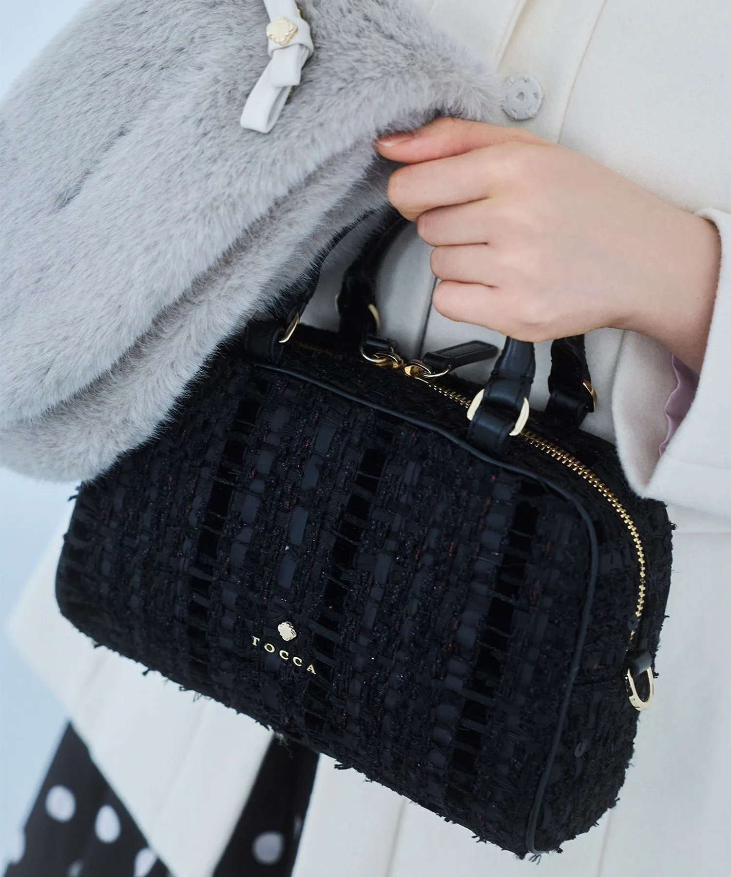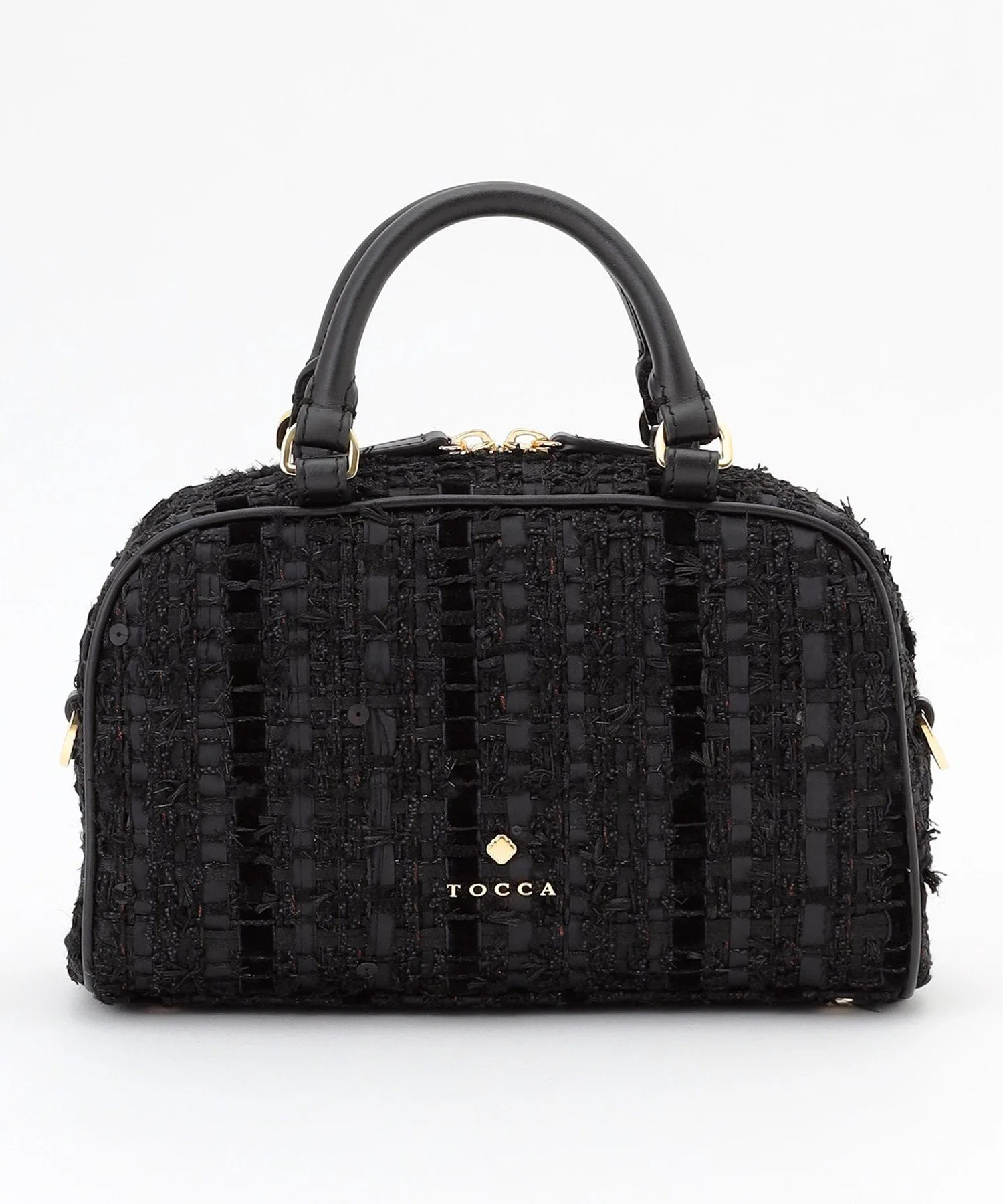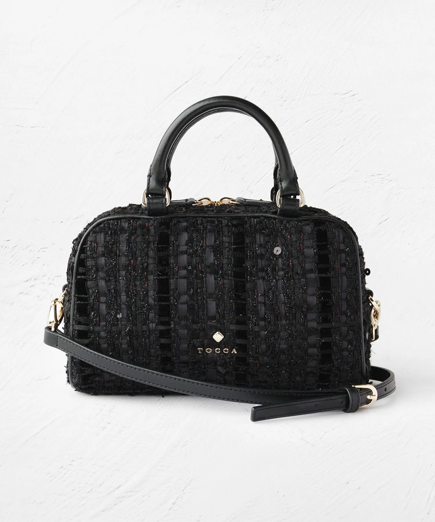 Черный и лососево-розовый твид, сотканный из смеси нитей и лент с различными оттенками, излучает женственность и утонченность. Дизайн добавляет нотку гламура любому образу, подобно ношению аксессуара.