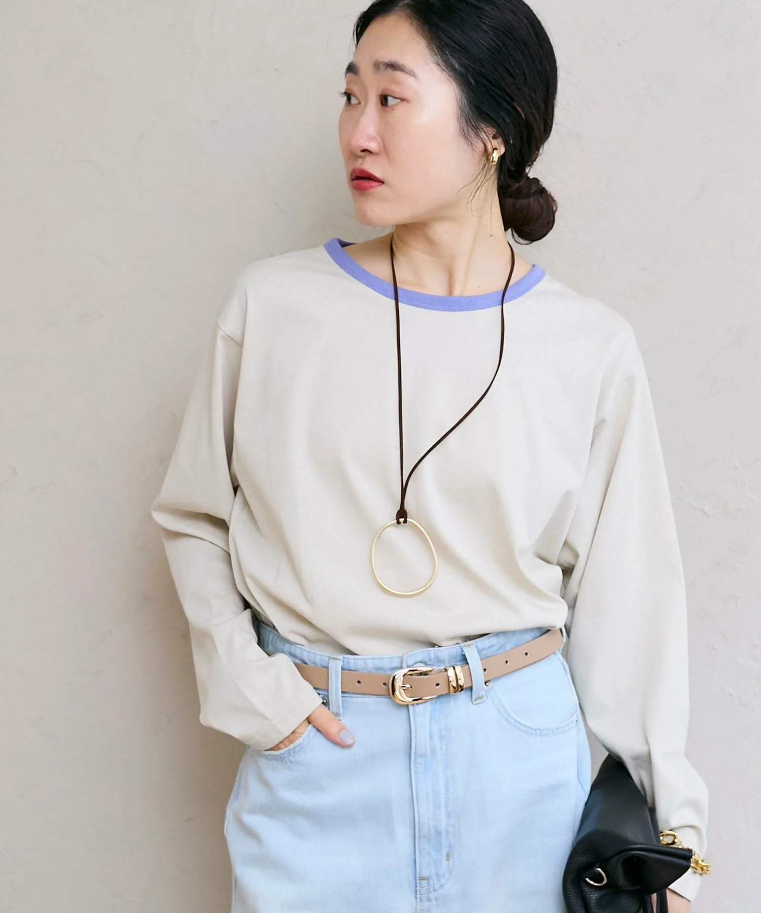 Эта длинная футболка сшита из двухцветного материала, что добавляет игривости простому образу.