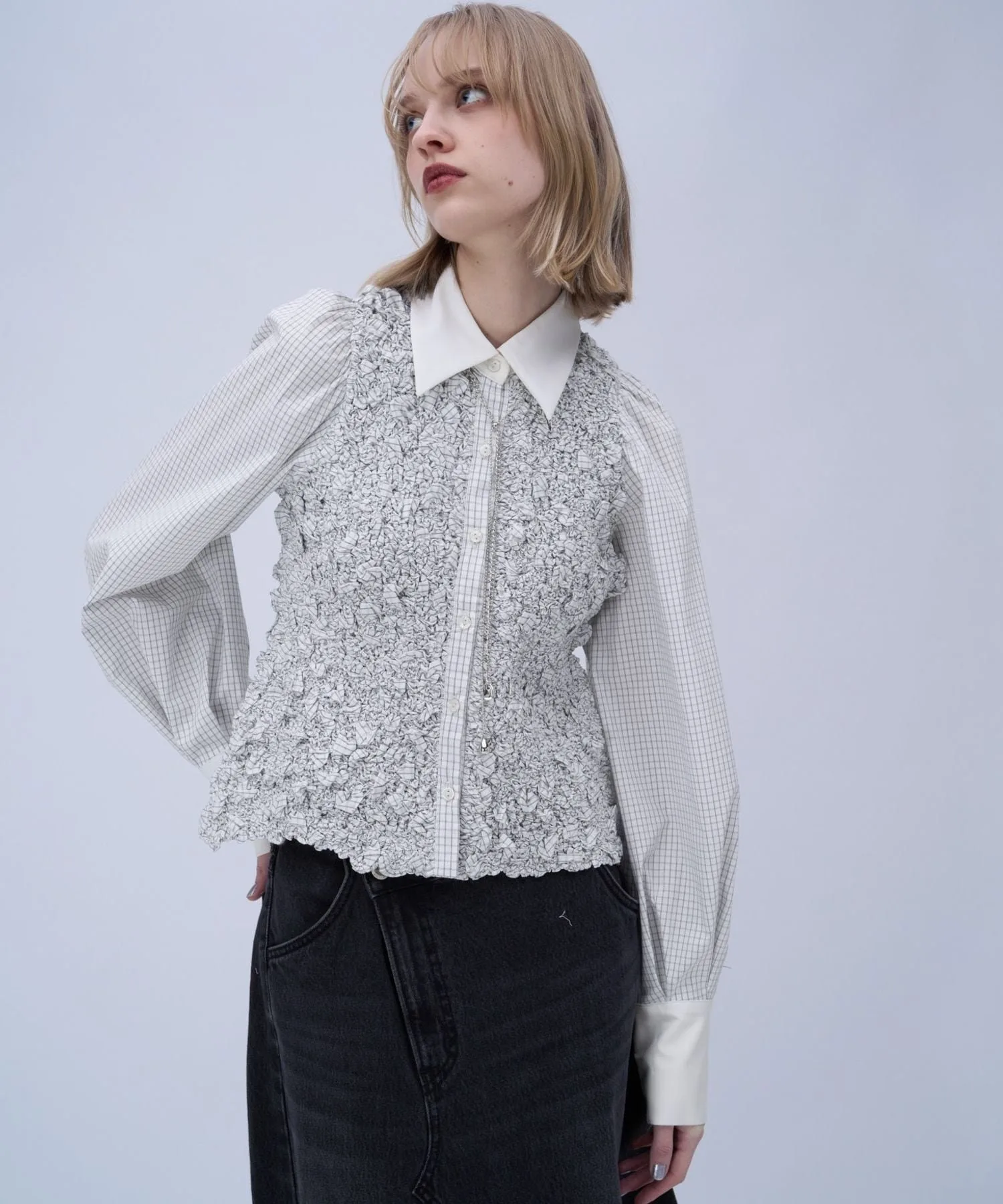Рубашка с клетчатым узором и сборками в качестве центрального элемента.