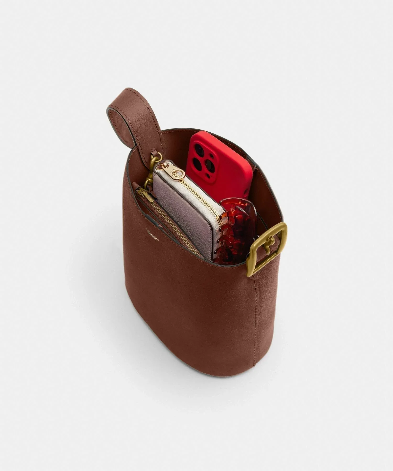 Сумка-ведро Bleecker отличается минималистичным и элегантным дизайном. Ее стиль излучает нью-йоркскую изысканность и идеально подходит для повседневной носки. Изготовленная из бархатистой замши, эта миниатюрная модель 21 имеет застежку-пряжку для собачьего поводка, чтобы содержимое оставалось в безопасности.
