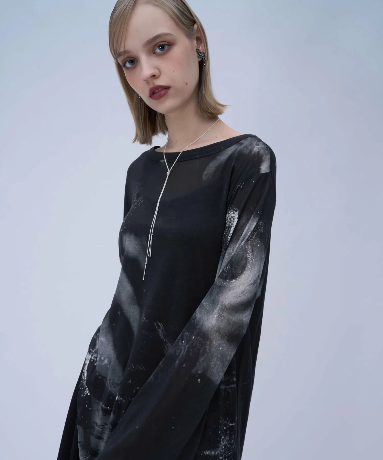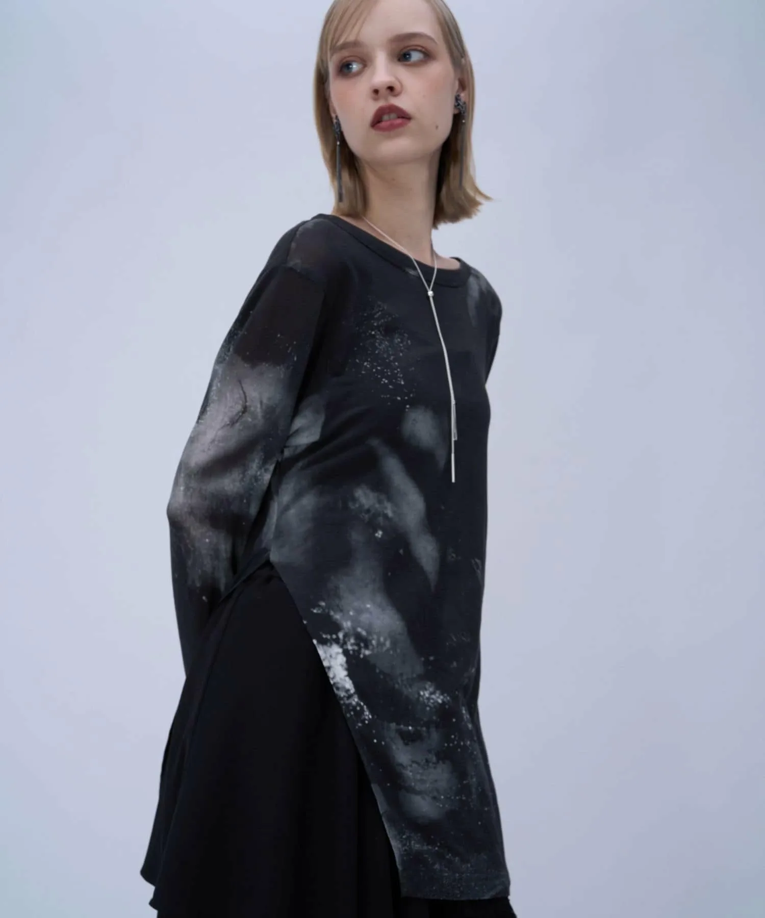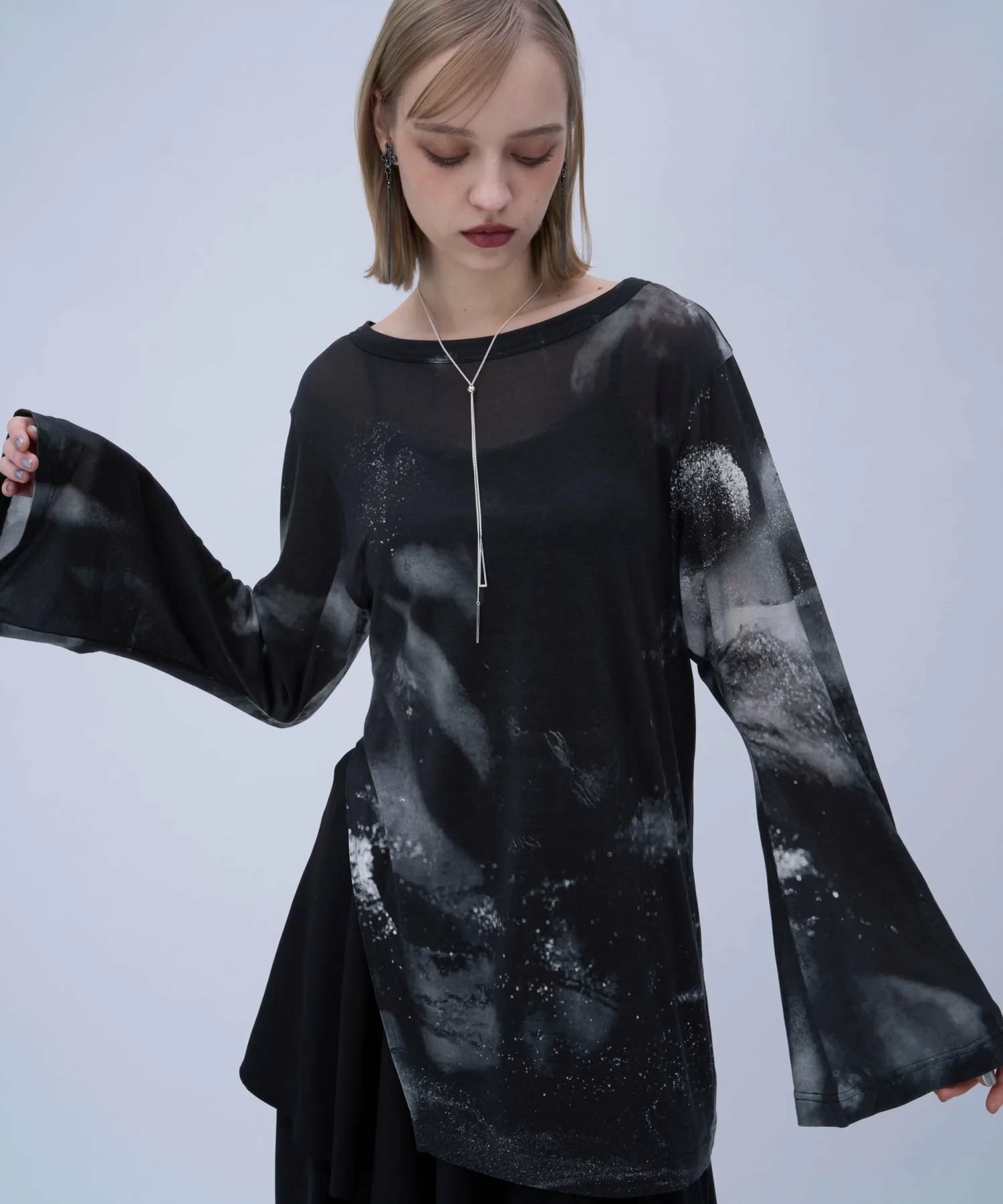 Полупрозрачный топ с боковым разрезом и графическим рисунком для современного образа