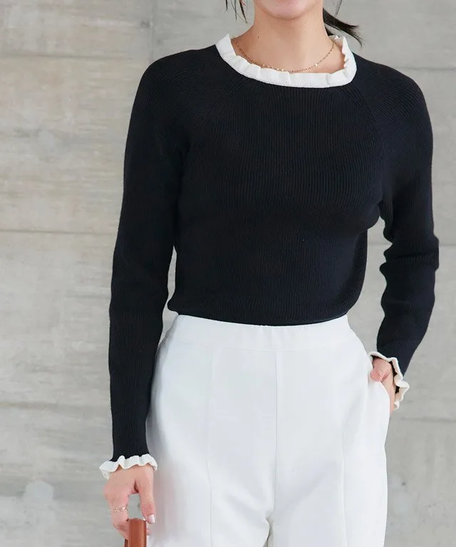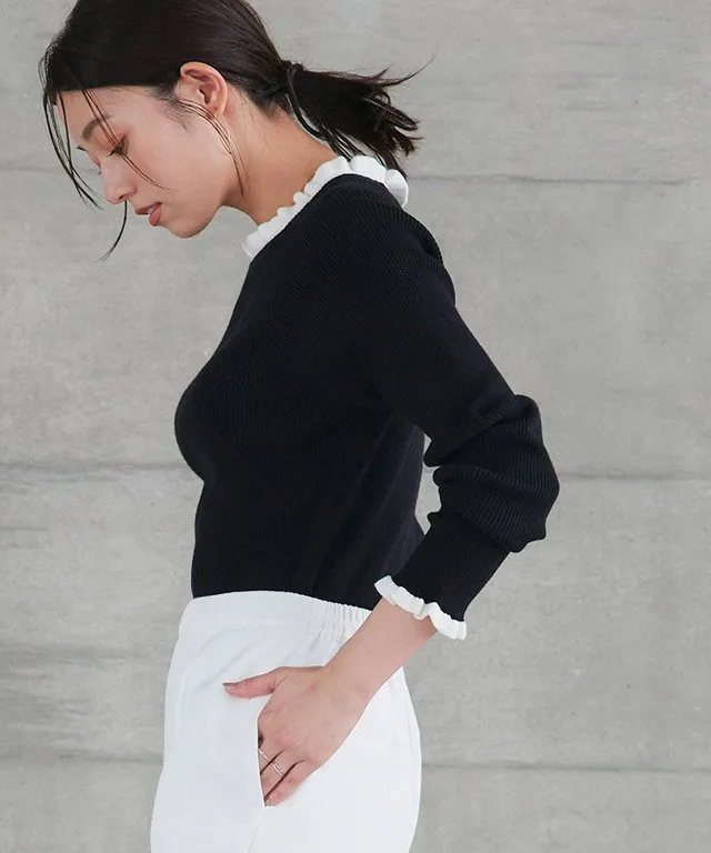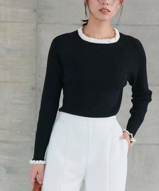 Трикотажная вещь с круглым вырезом и оборками в рубчик, которая добавит изысканности.