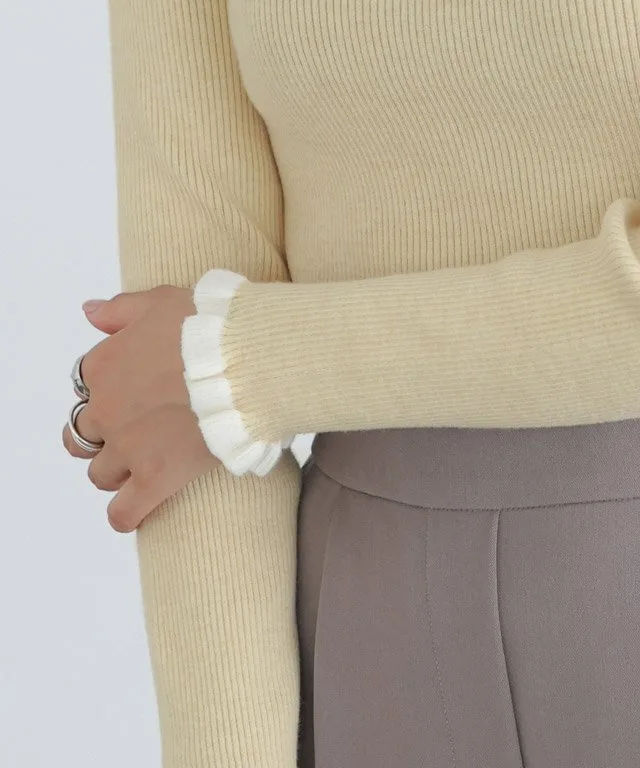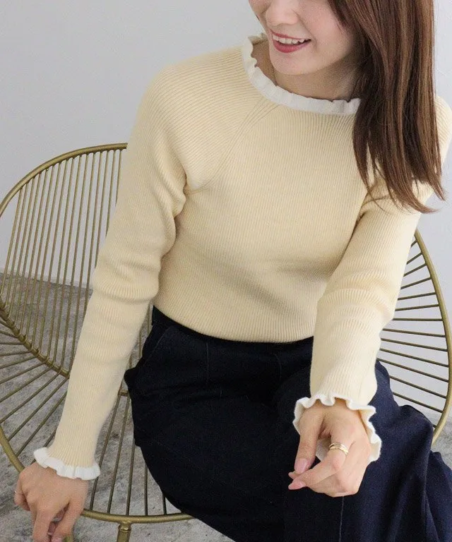 Трикотажная вещь с круглым вырезом и оборками в рубчик, которая добавит изысканности.